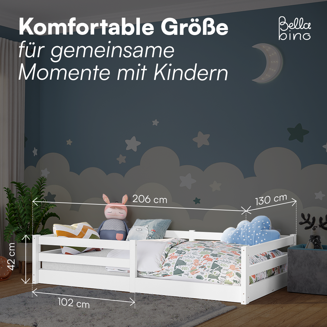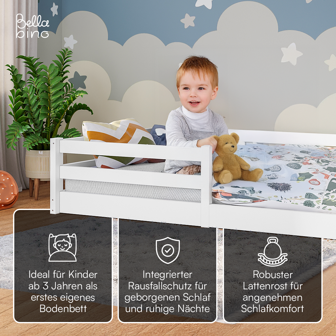 - Lieferumfang: Bodenbett inkl. Rausfallschutz, Lattenrost und Matratze