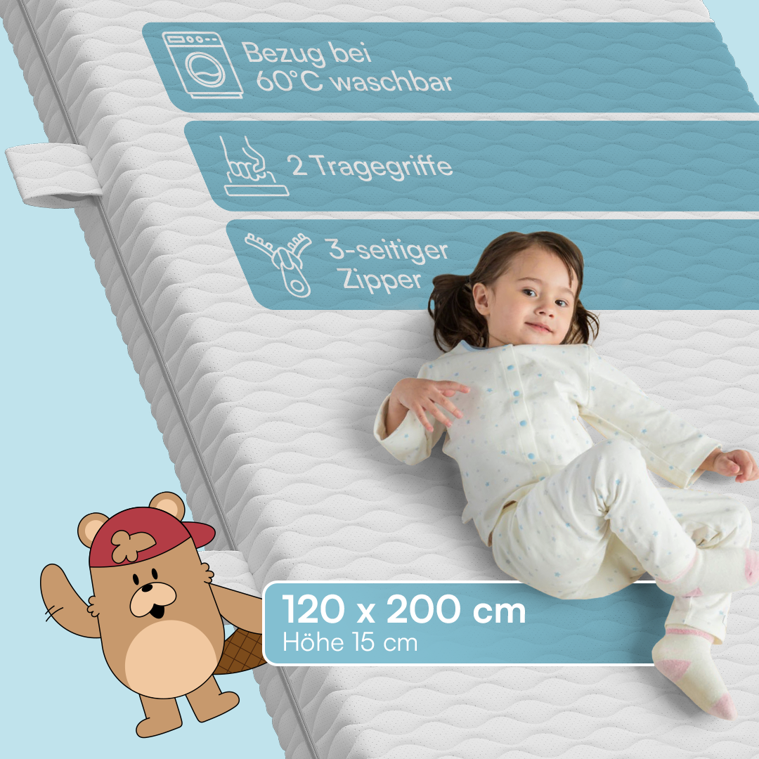 - Zwei Seiten: Babyseite (fest, glatt), Kinderseite (zoniert, ergonomisch)