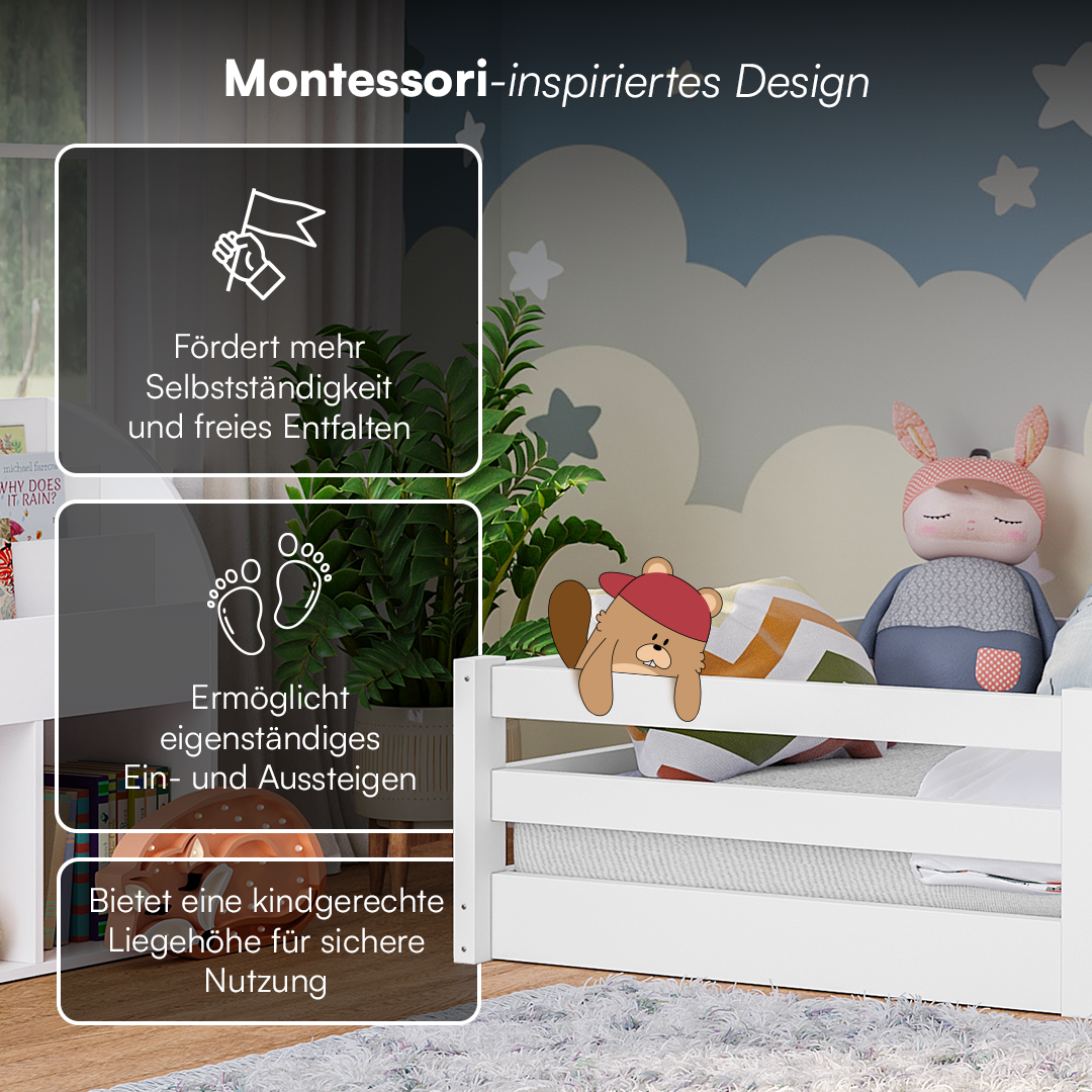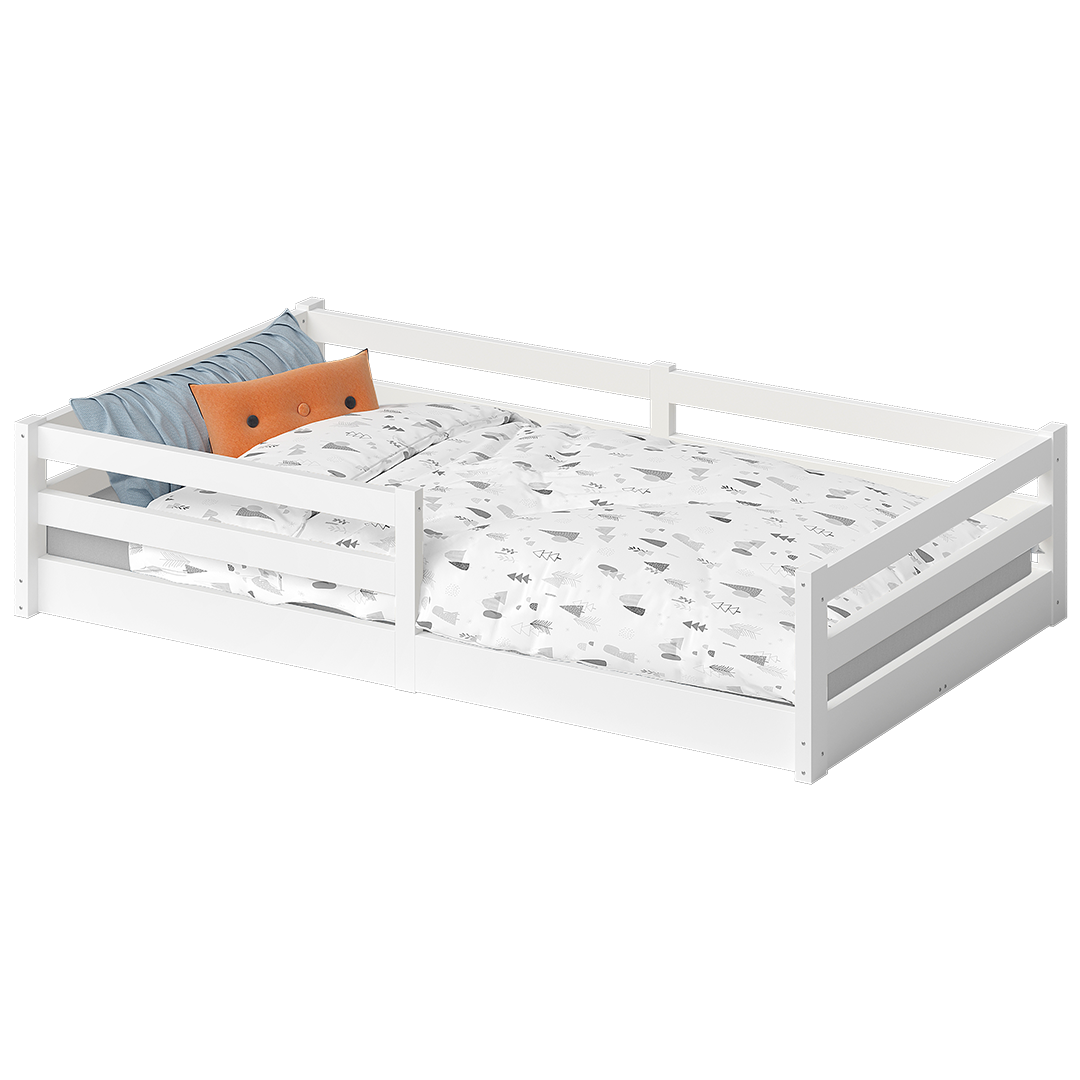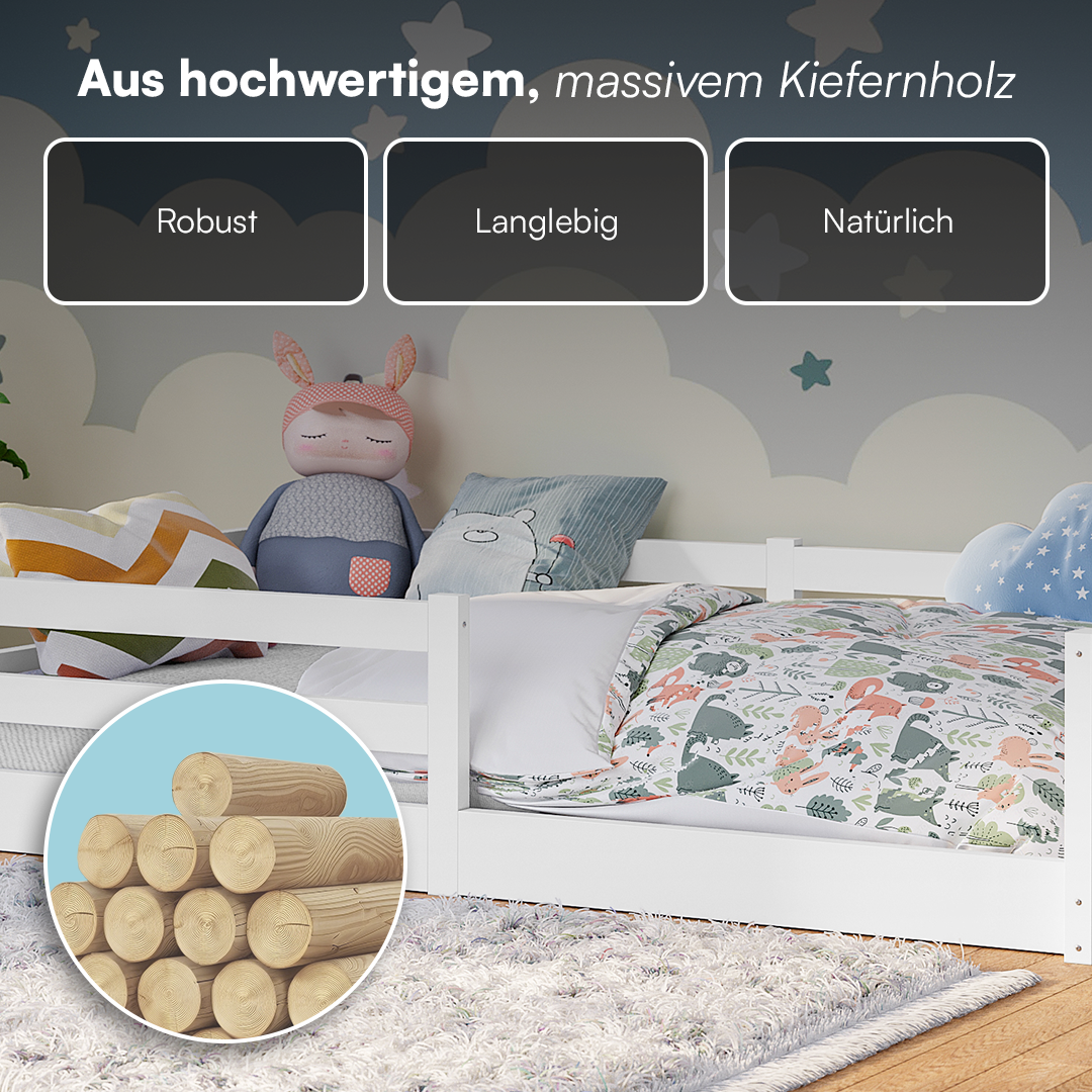 Iskri Bodenbett 120x200 cm, weiß, Massivholz Kiefer, Montessori Kinderbett mit Rausfallschutz und Lattenrost