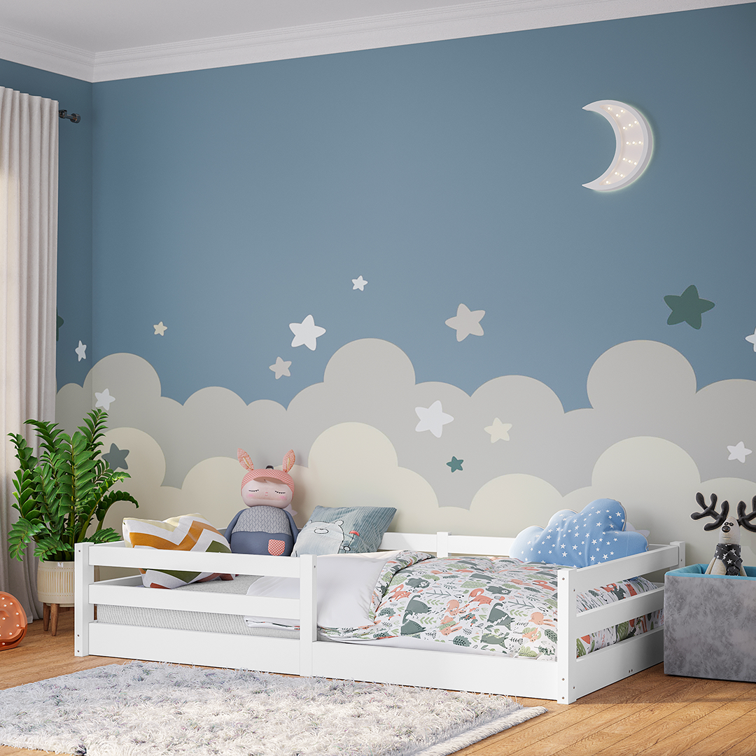Das Montessori-inspirierte Bodenbett Iskri von Bellabino fördert die Selbstständigkeit von Kindern durch seine niedrige Einstiegshöhe. Ideal für den Übergang vom Gitterbett, ermöglicht es ein sicheres Ein- und Aussteigen ganz ohne Hilfe.