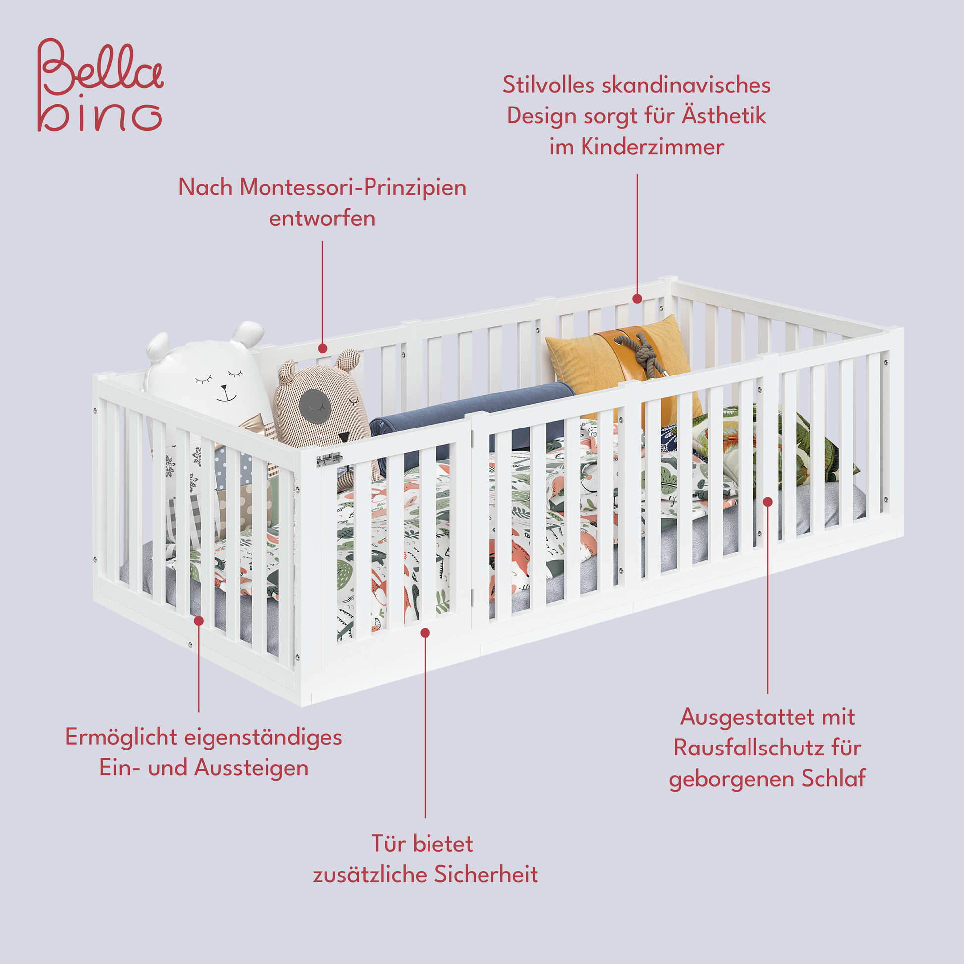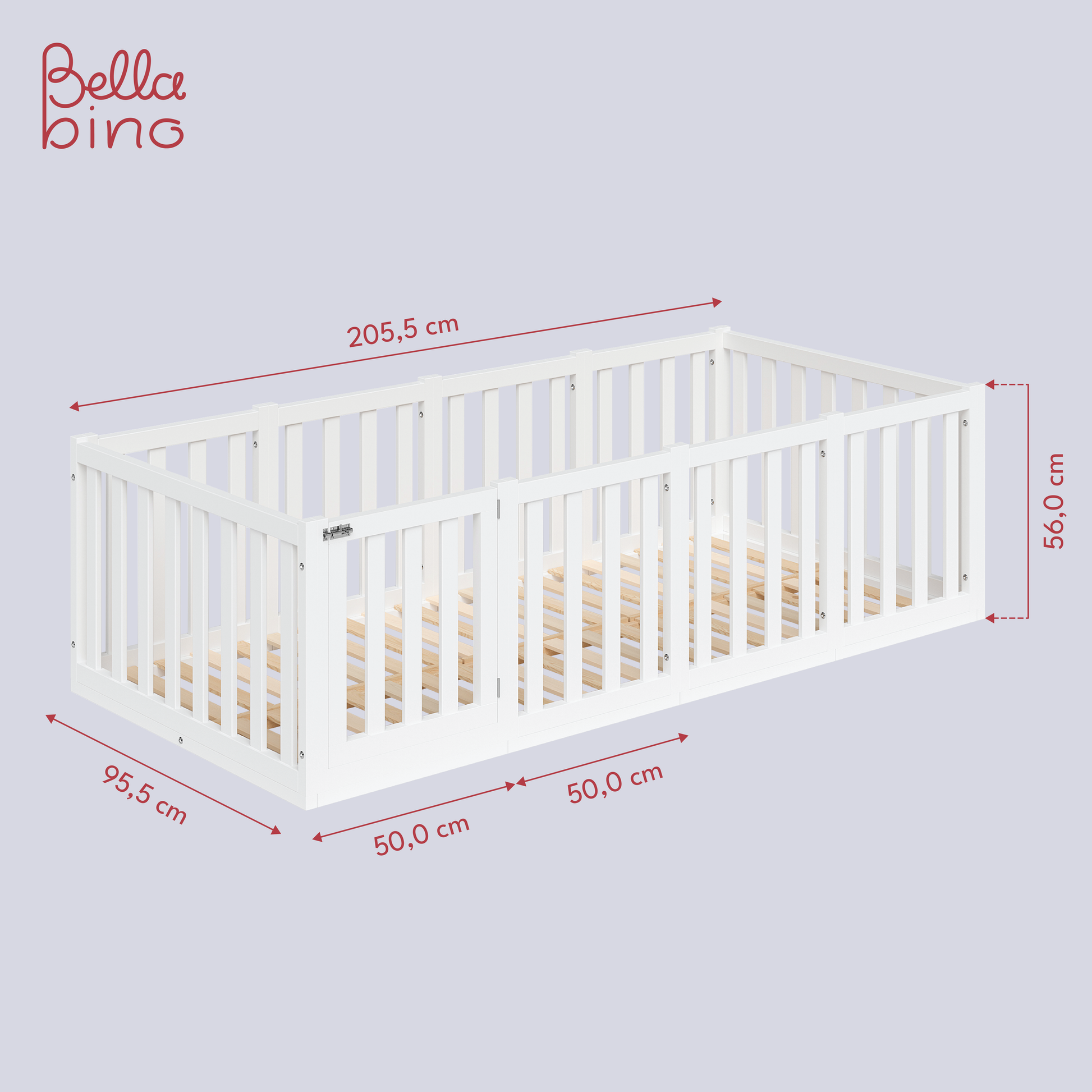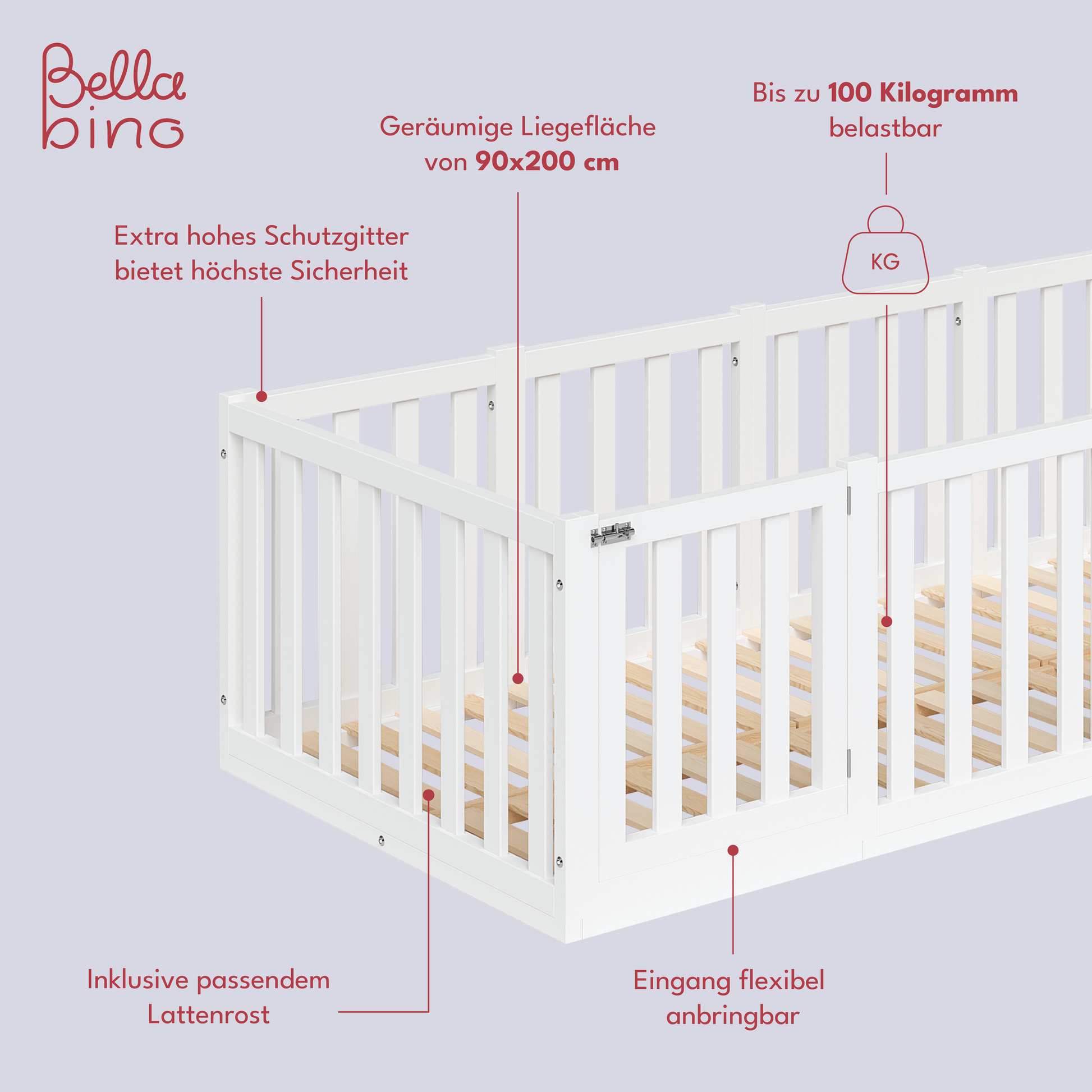 Tapi Bodenbett 90x200 cm mit extra hohem Gitter, mit Tür, weiß lackiert, Kiefer massiv, inkl. Lattenrost