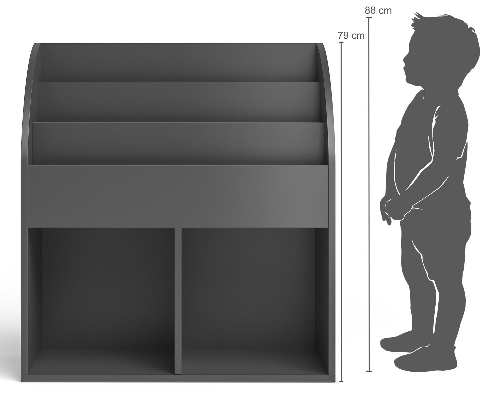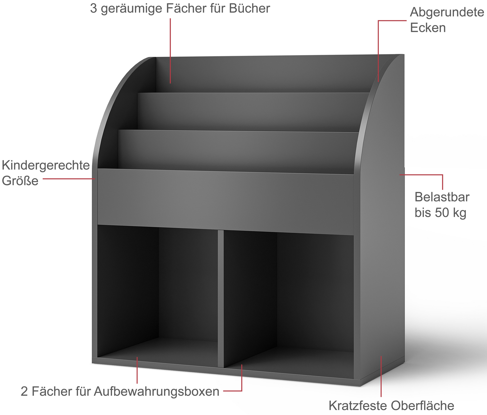 Koro Kinderregal, grau, mit 3 Fächern für Bücher und 2 Fächern für Boxen