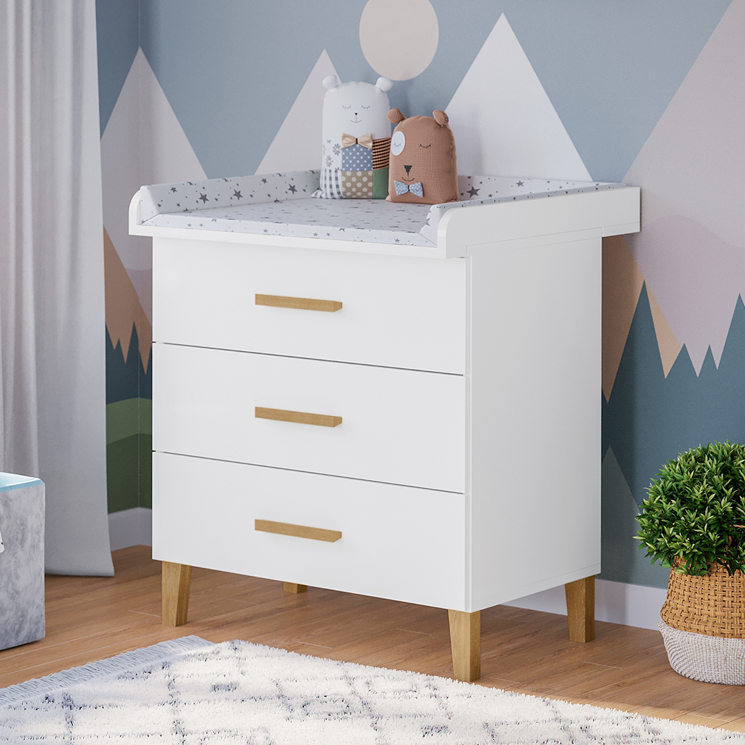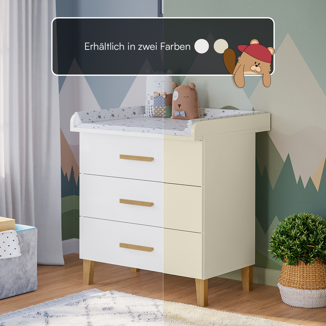 Unten befinden sich drei große Schubkästen mit sehr viel Stauraum für Windeln und Wickelaccessoires. Kommt Ihr Kind in ein Alter, in dem es nicht mehr gewickelt werden muss, bauen Sie den Wickelaufsatz in wenigen Hangriffen ab und nutzen das Möbelstück als normale Kommode weiter.