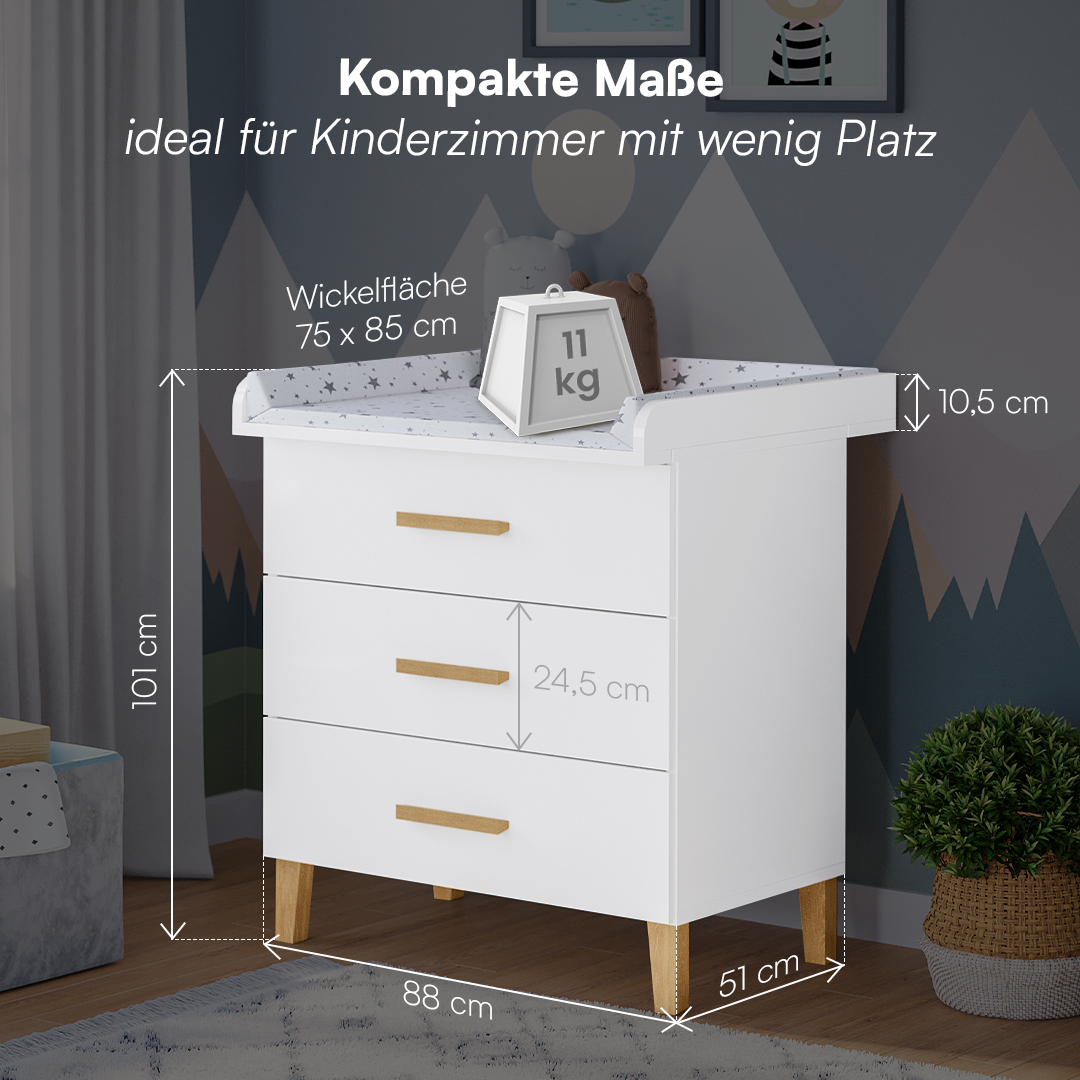 - Größe Kommode ohne Wickelaufsatz: B 88 cm x T 52,5 cm x H 93 cm