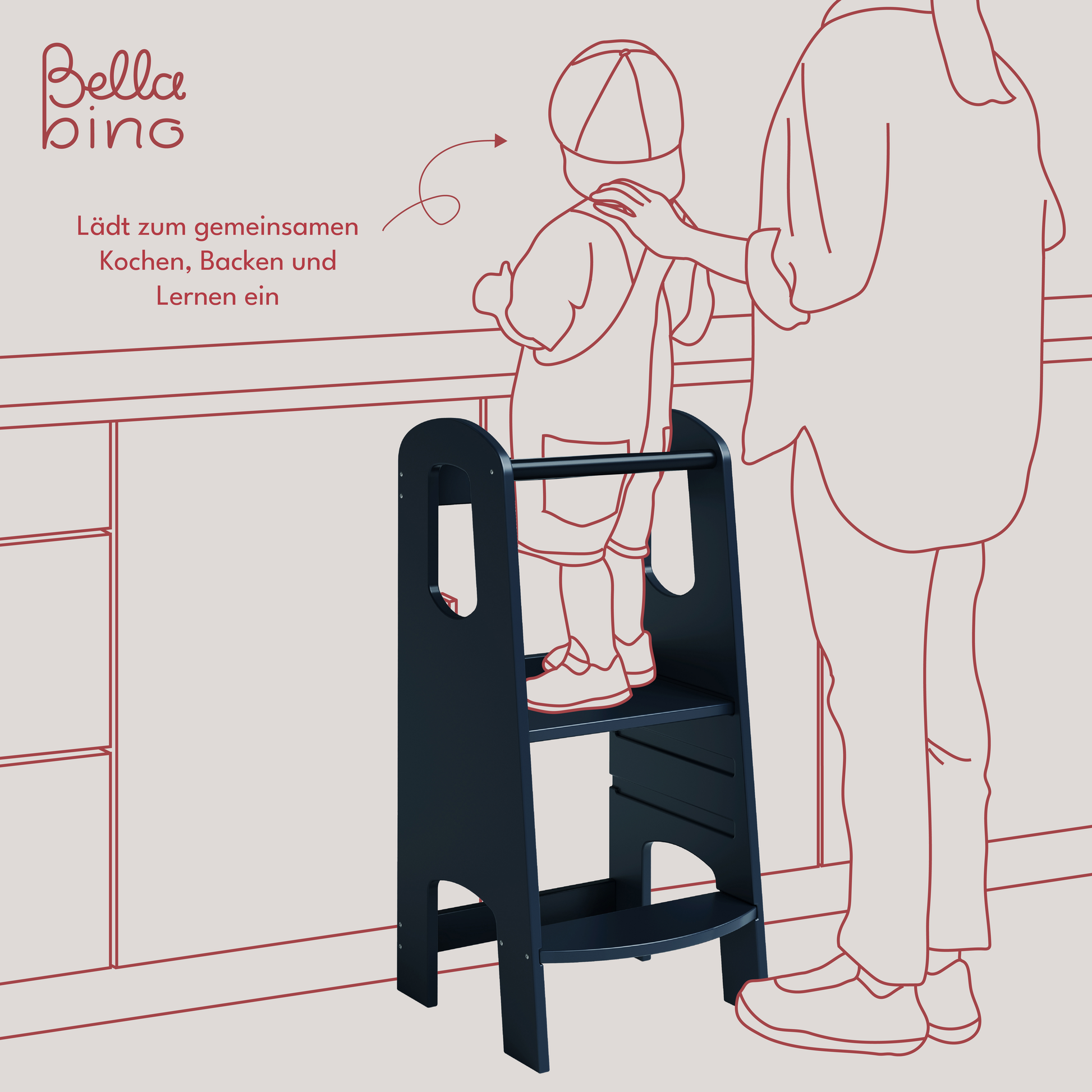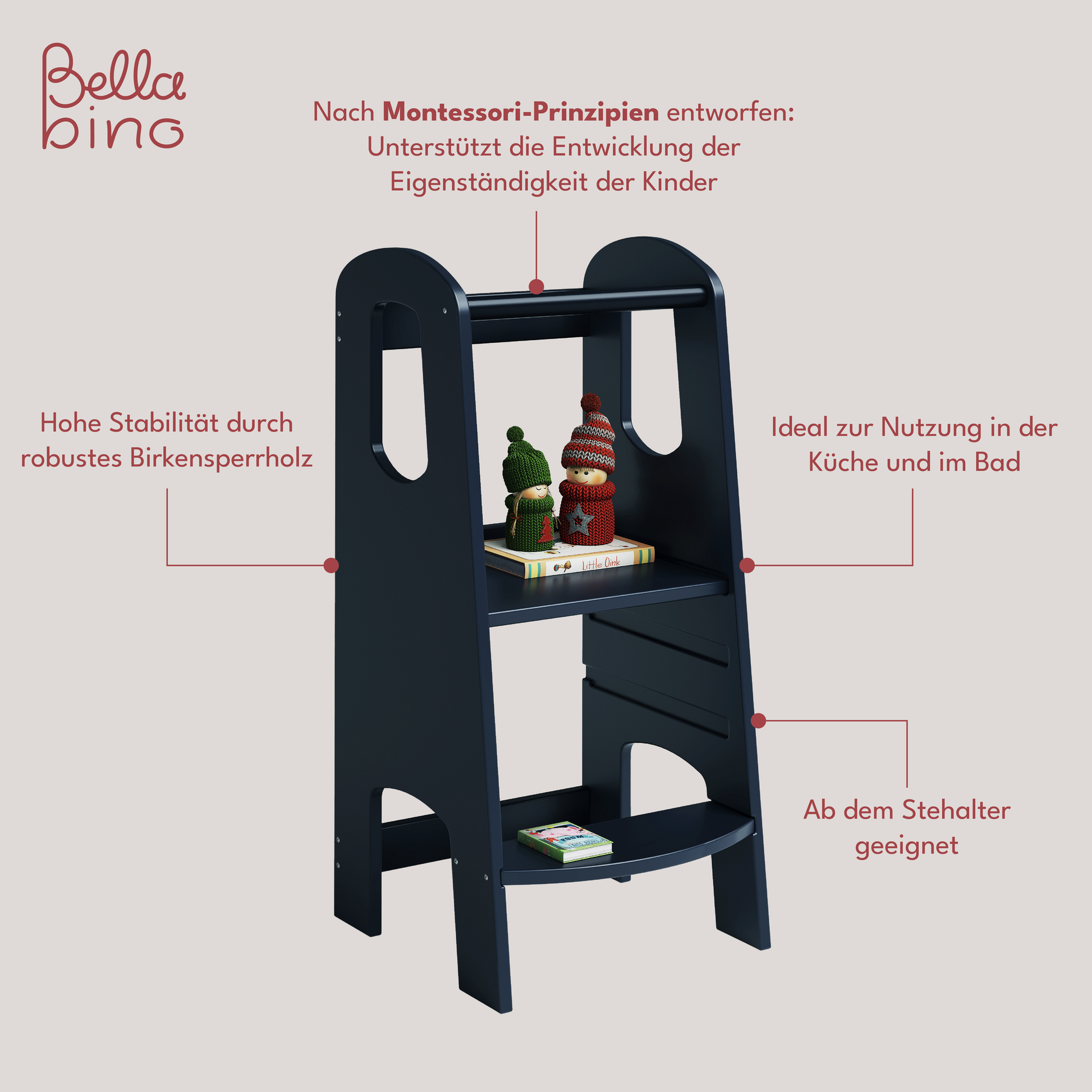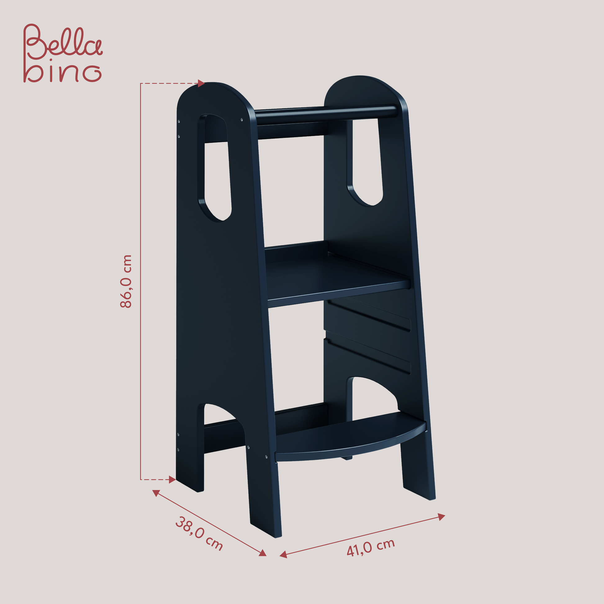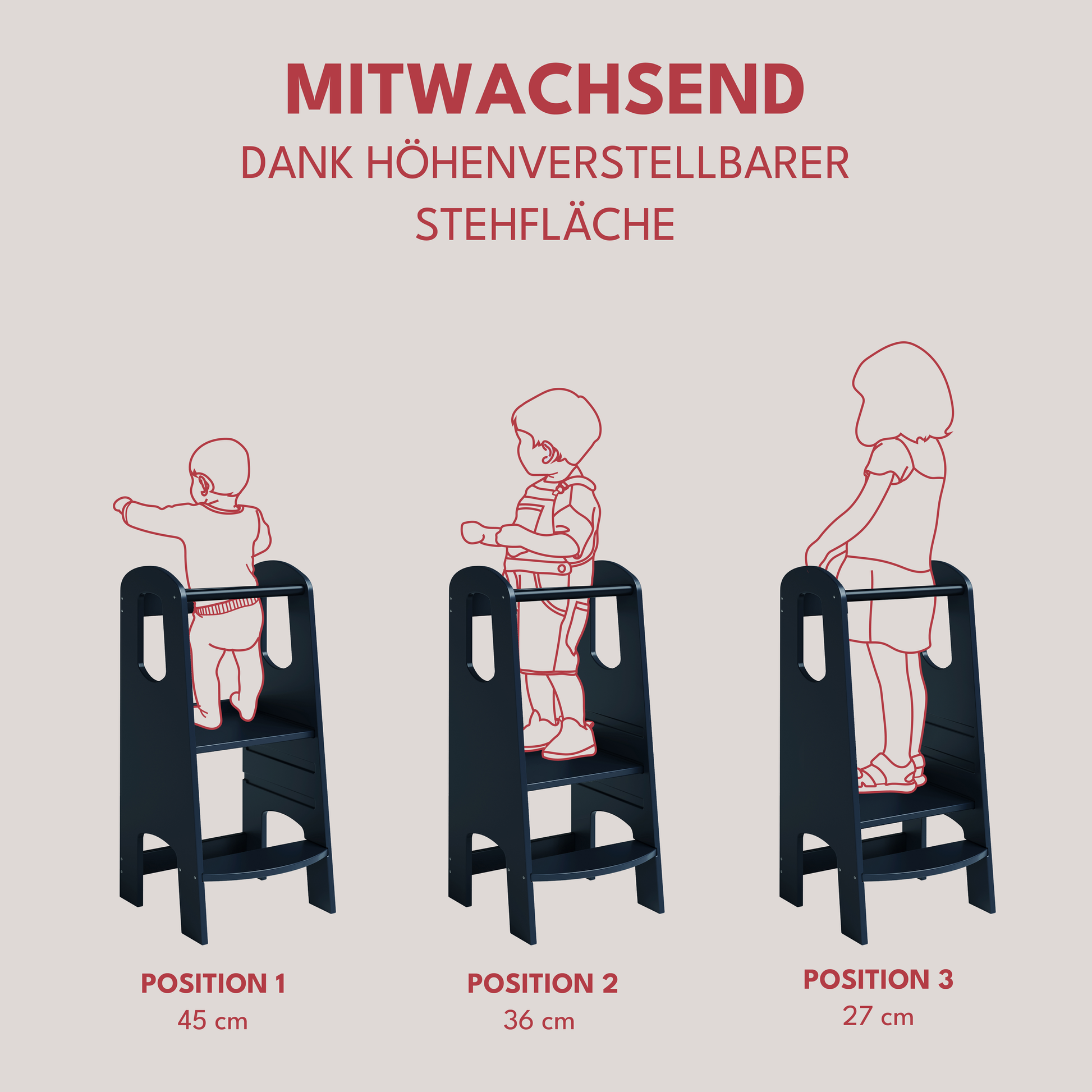 Der Lernturm von Bellabino ist in der Farbe Grau aus Sperrholz gefertigt, das dank seiner hohen Festigkeit für eine maximale Tragfähigkeit von 60 kg sorgt. Die Stehfläche ist auf drei Stufen (27, 36 und 45 cm) einstellbar, sodass sich der Turm wunderbar an die Größe Ihres Kindes anpassen lässt. Die Anpassung der Stehfläche erfolgt schnell und unkompliziert durch das einfache Rausziehen der Trittfläche.
