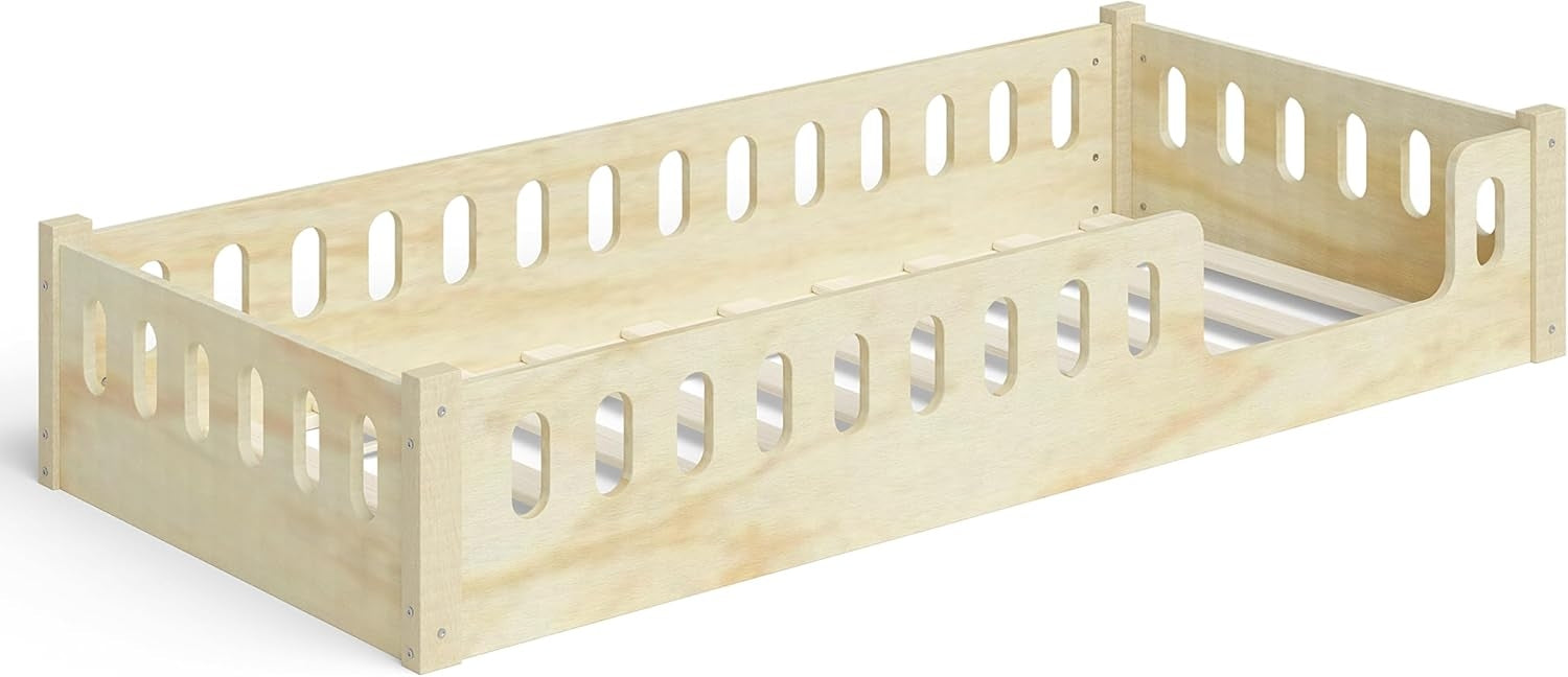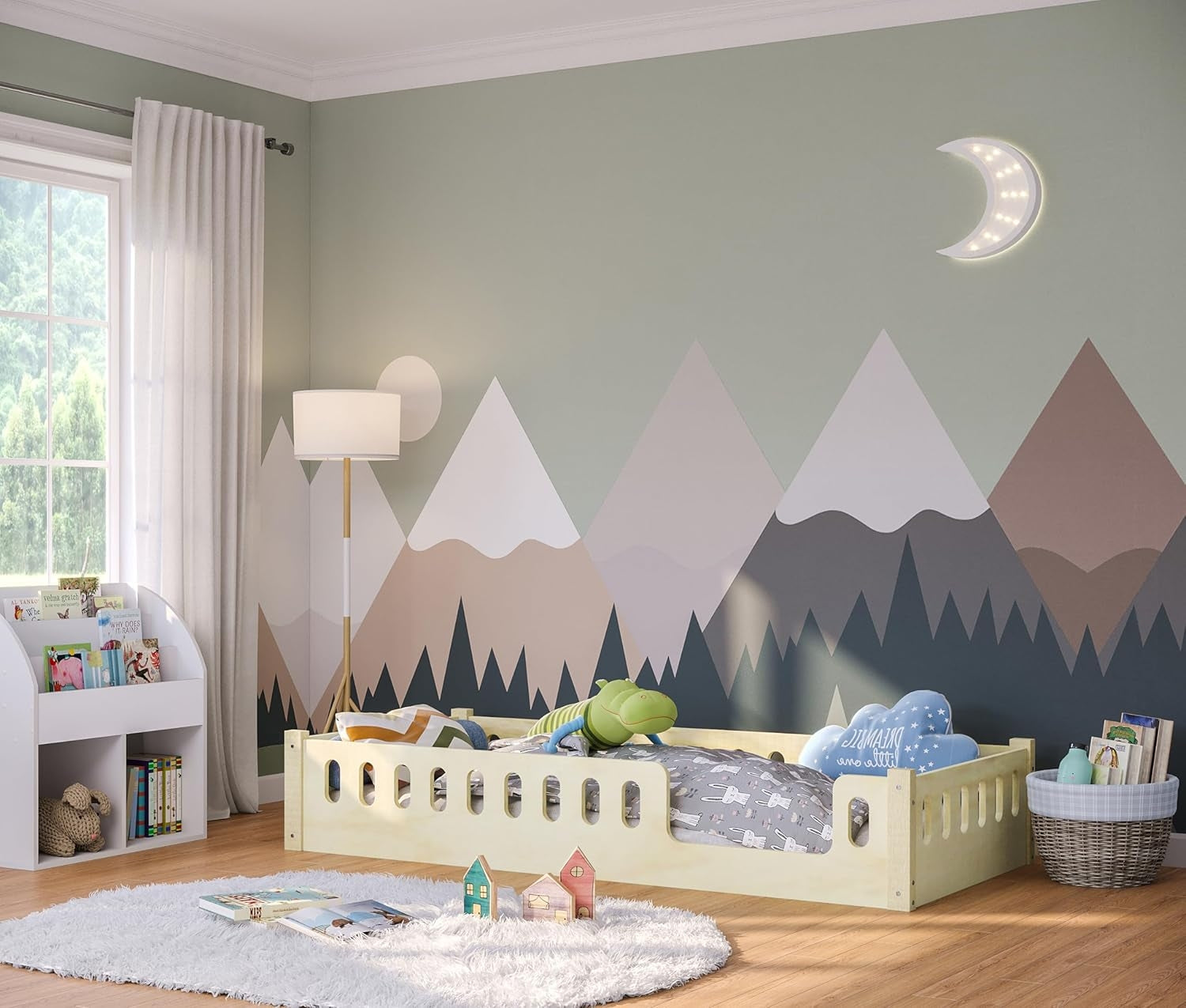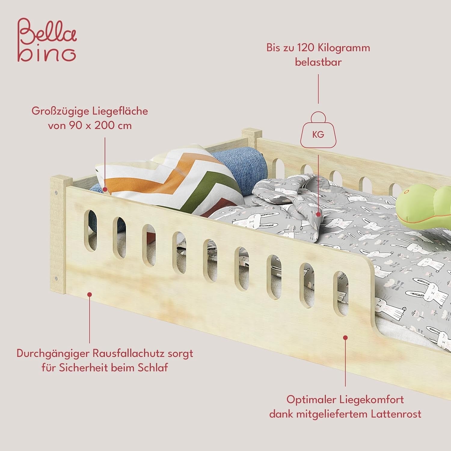 Die robuste Konstruktion ermöglicht eine Belastbarkeit von bis zu 120 kg für langanhaltende Nutzung und Stabilität. Das Montessori-inspirierte Design fördert die Unabhängigkeit und Selbstbestimmung des Kindes durch eine komfortable Schlafmöglichkeit.