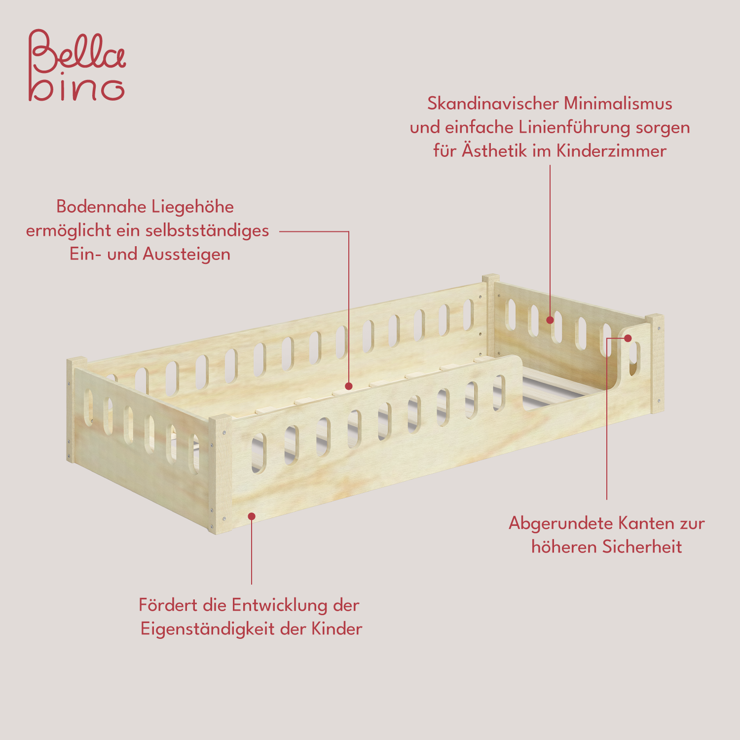 'Miera' von Bellabino schafft ein Bodenbett, das nicht nur funktional und sicher ist, sondern auch mit zeitlosem Design und kinderfreundlicher Ästhetik das Kinderzimmer zu einem gemütlichen und inspirierenden Ort macht.