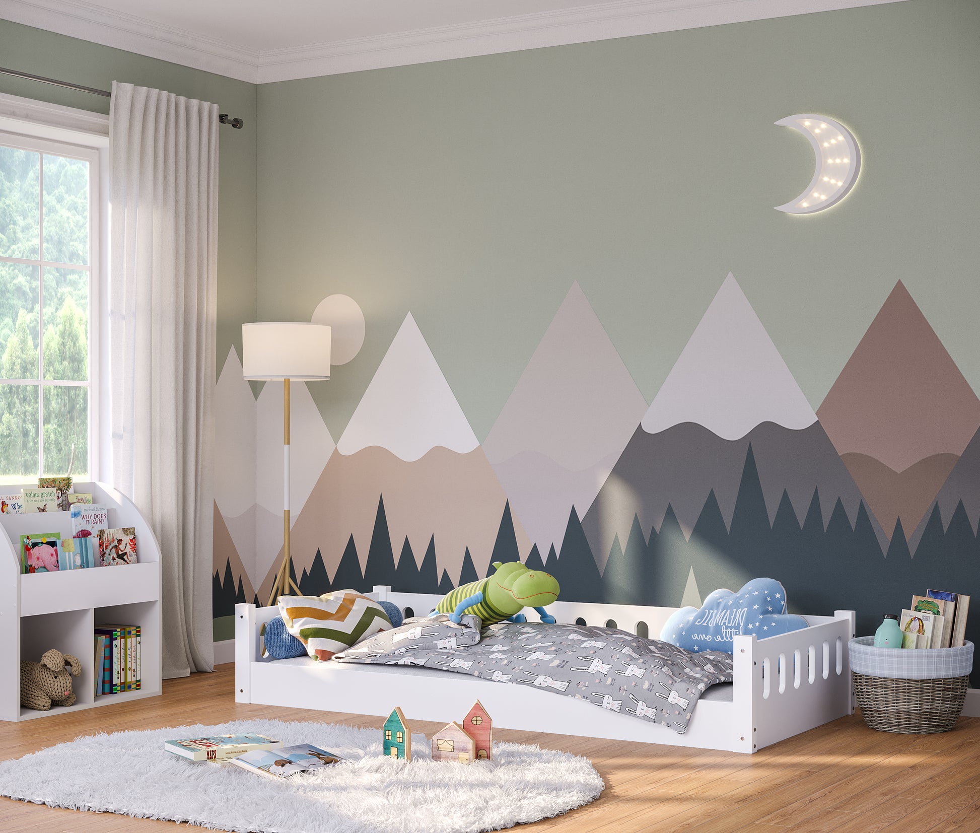 'Miera' von Bellabino schafft ein funktionales, sicheres Bodenbett mit zeitlosem Design und kinderfreundlicher Ästhetik für ein gemütliches und inspirierendes Kinderzimmer.