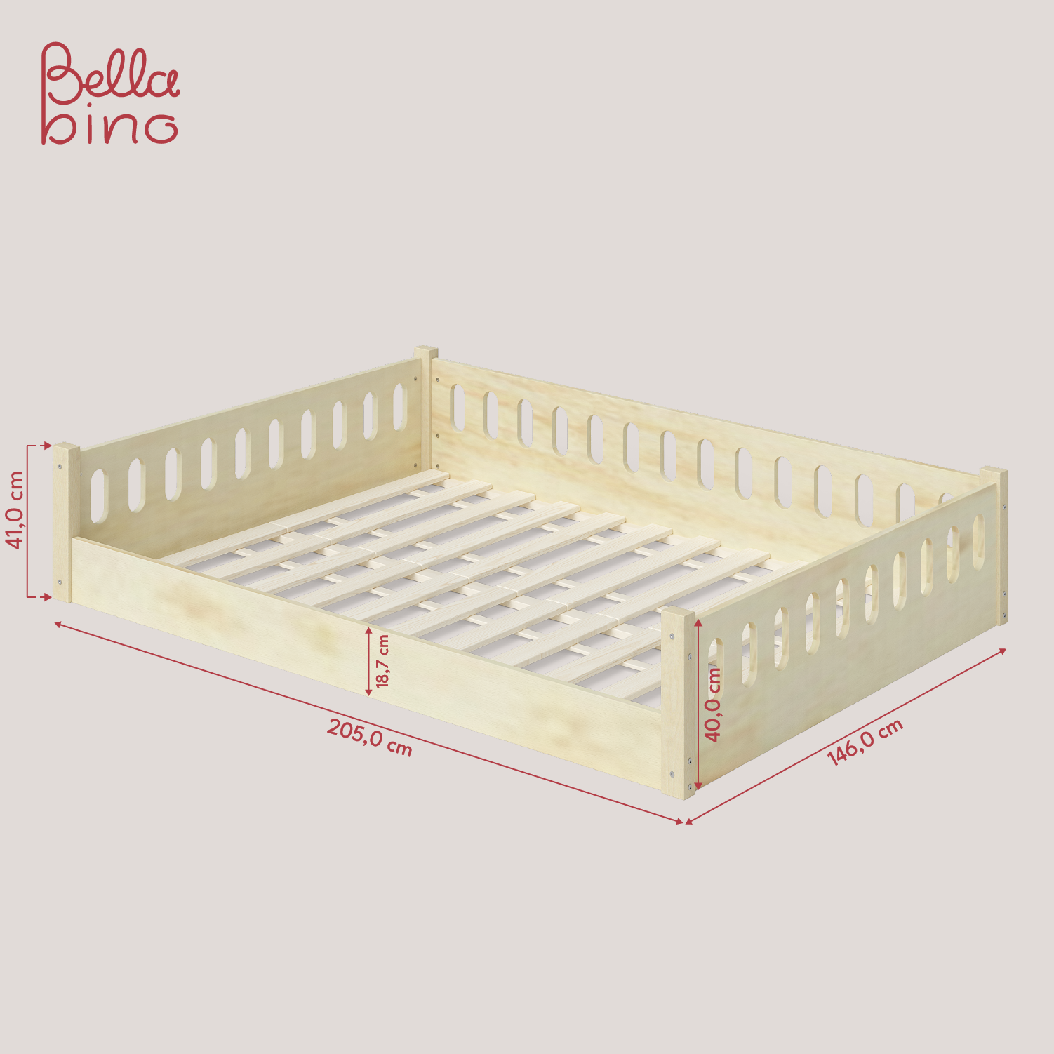 Das Bellabino Bodenbett 'Miera' bietet eine bequeme und ästhetische Schlafmöglichkeit für kleine Kinder. Mit Maßen von 205 cm Breite, 41 cm Höhe und 146 cm Tiefe ist es optimal auf die Bedürfnisse junger Schläfer abgestimmt. Das hochwertige Sperrholzmaterial gewährleistet nicht nur eine ansprechende Optik, sondern auch eine lange Lebensdauer.