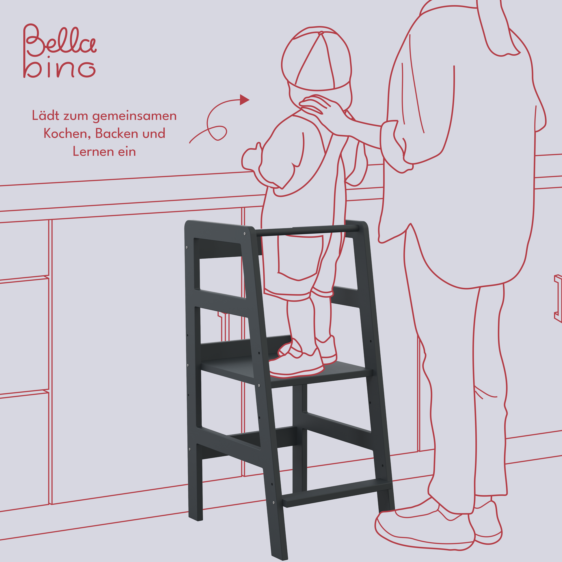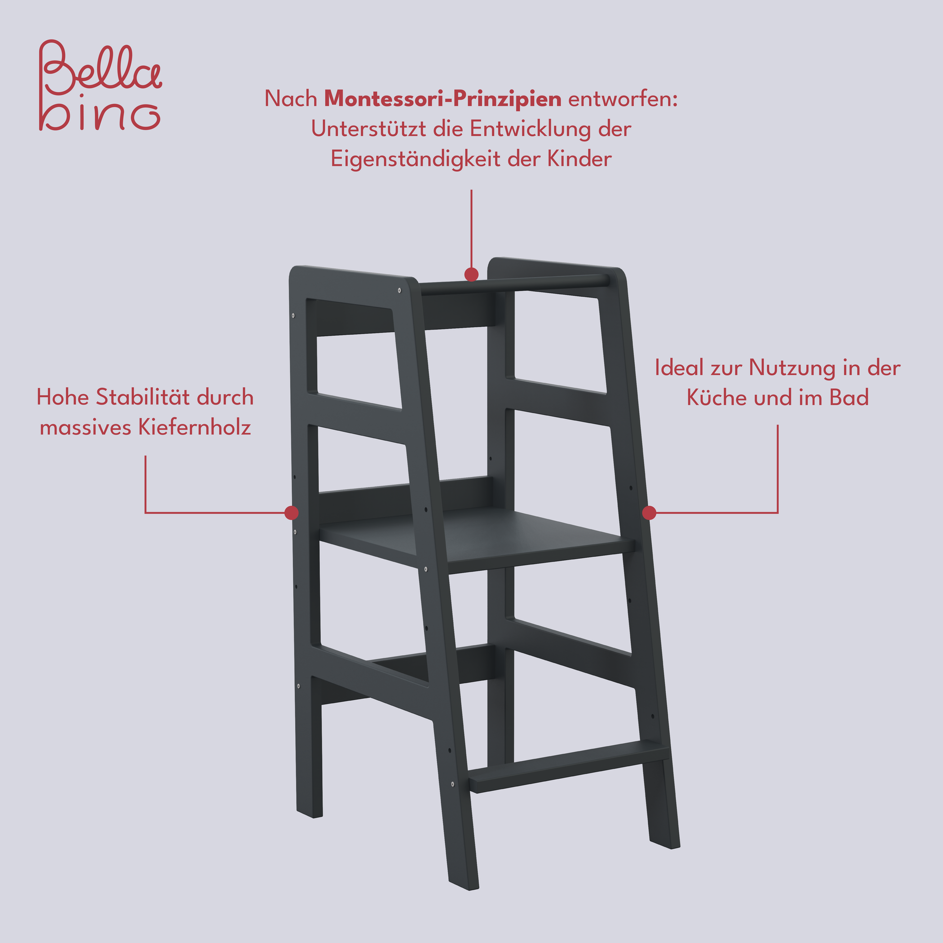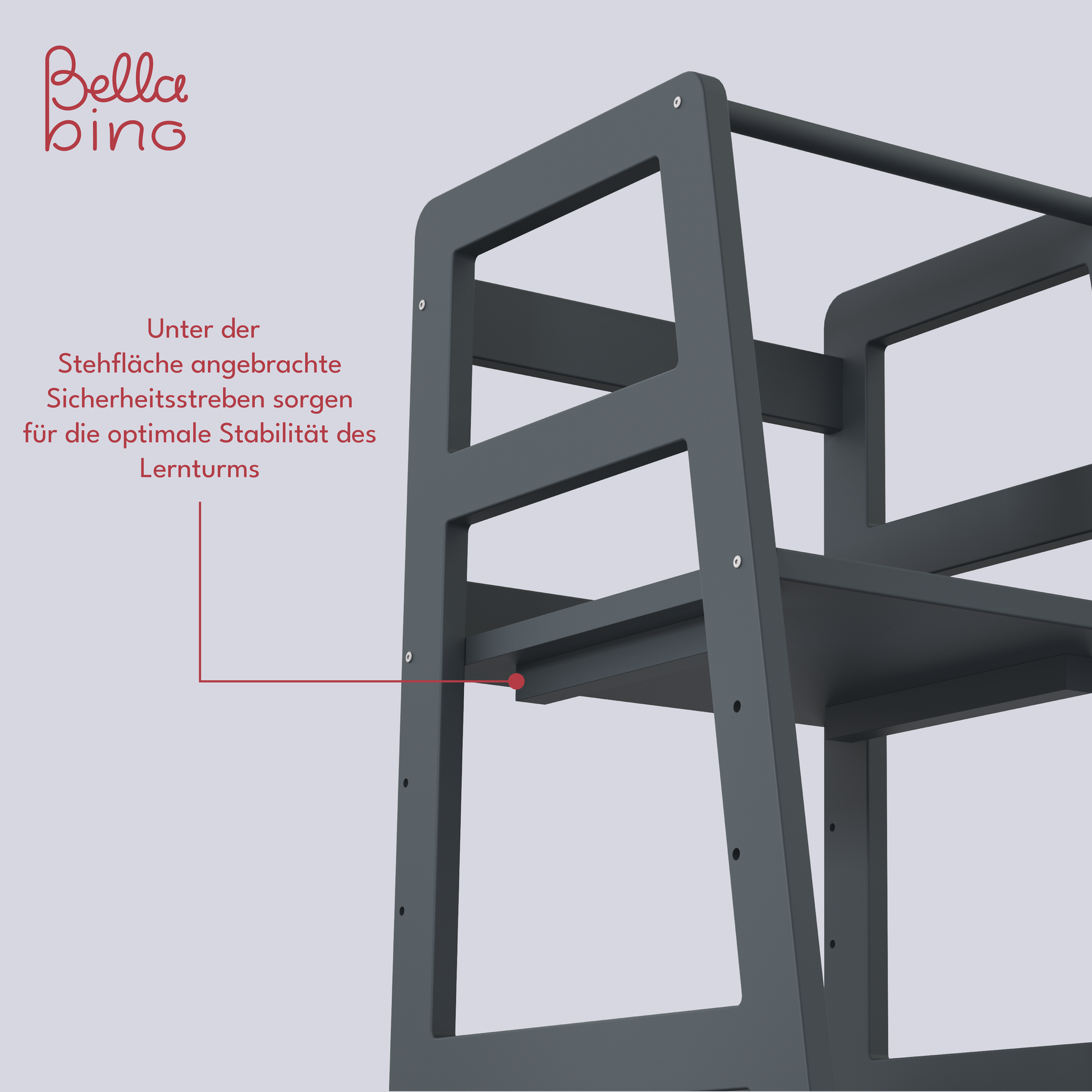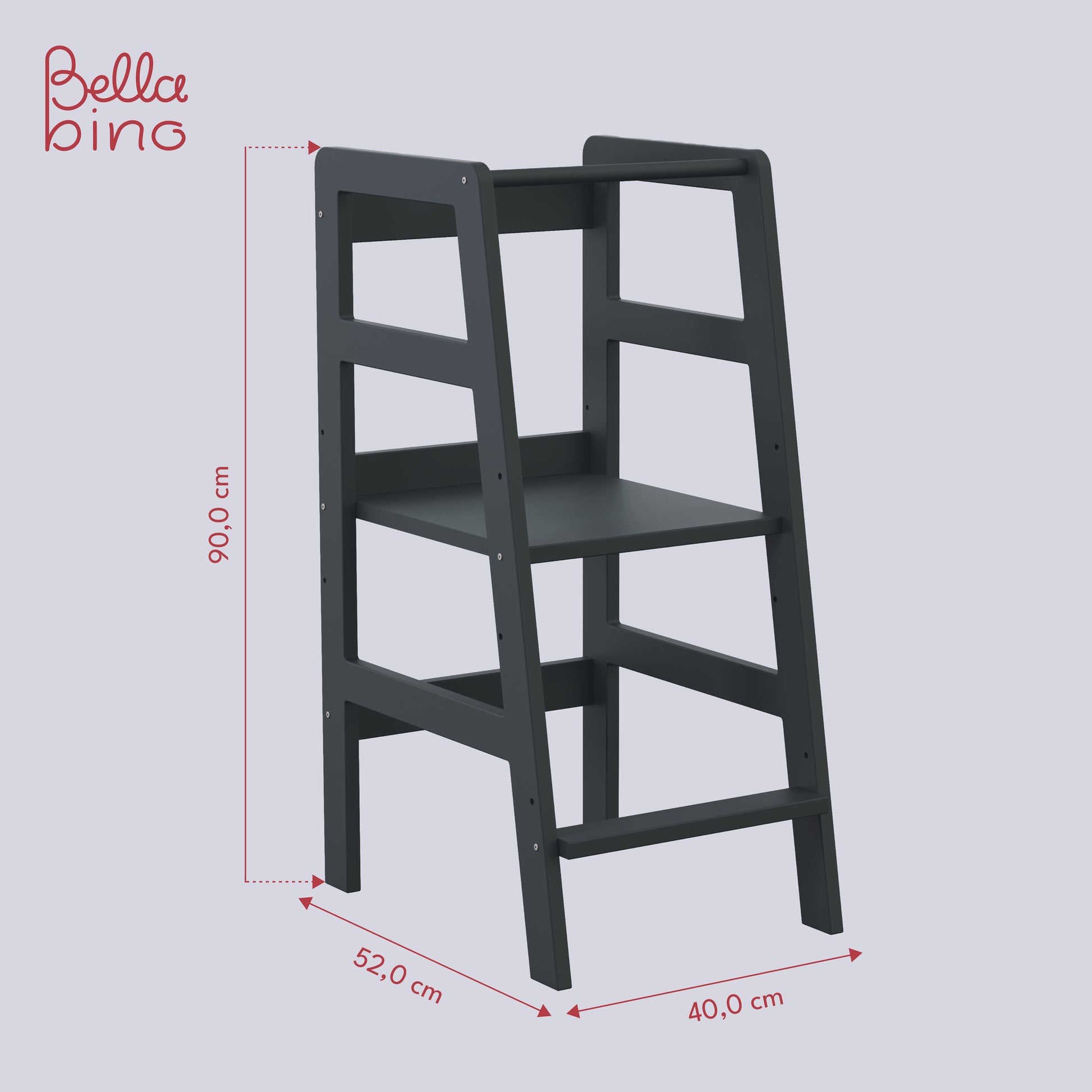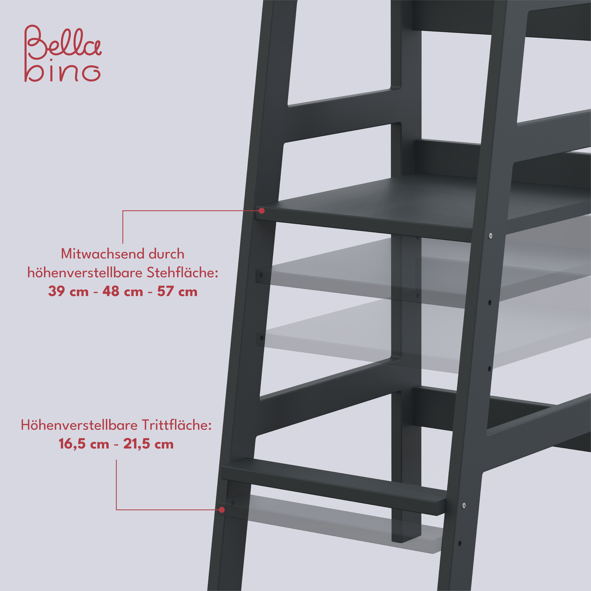 Der Lernturm von Bellabino ist optimal ausgestattet, um Ihnen und Ihrem Baby höchste Flexibilität zu bieten. Durch die praktische Stehfläche, die auf drei Stufen (39, 48 und 57 cm) einstellbar ist, passt sich der Turm wunderbar an die Größe Ihres Kindes an. Das Trittbrett kann ebenfalls auf zwei verschiedenen Höhen (16,5 und 21,5 cm) genutzt werden. Dank der hohen Festigkeit des Massivholzes, die für eine Tragfähigkeit von bis zu 50 kg sorgt, bleibt der 'Milo' ein treuer Begleiter für lange Zeit.