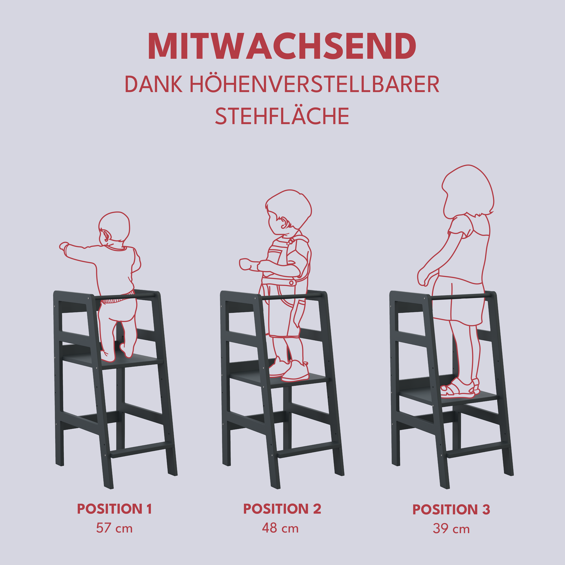 Milo Lernturm, Tritt 3-fach höhenverstellbar, grau lackiert, Kiefer Massivholz