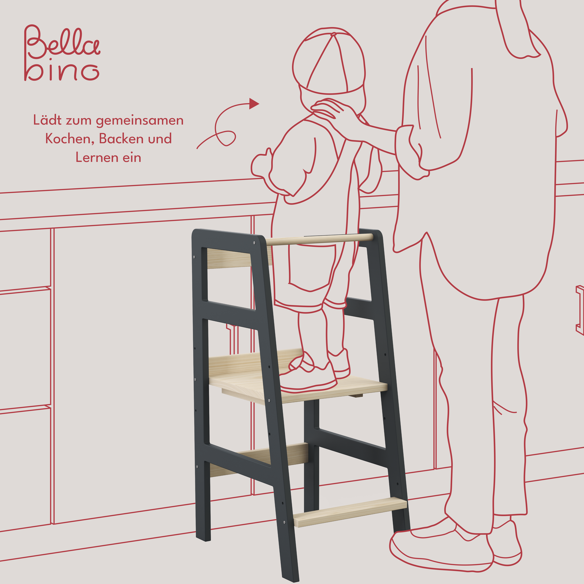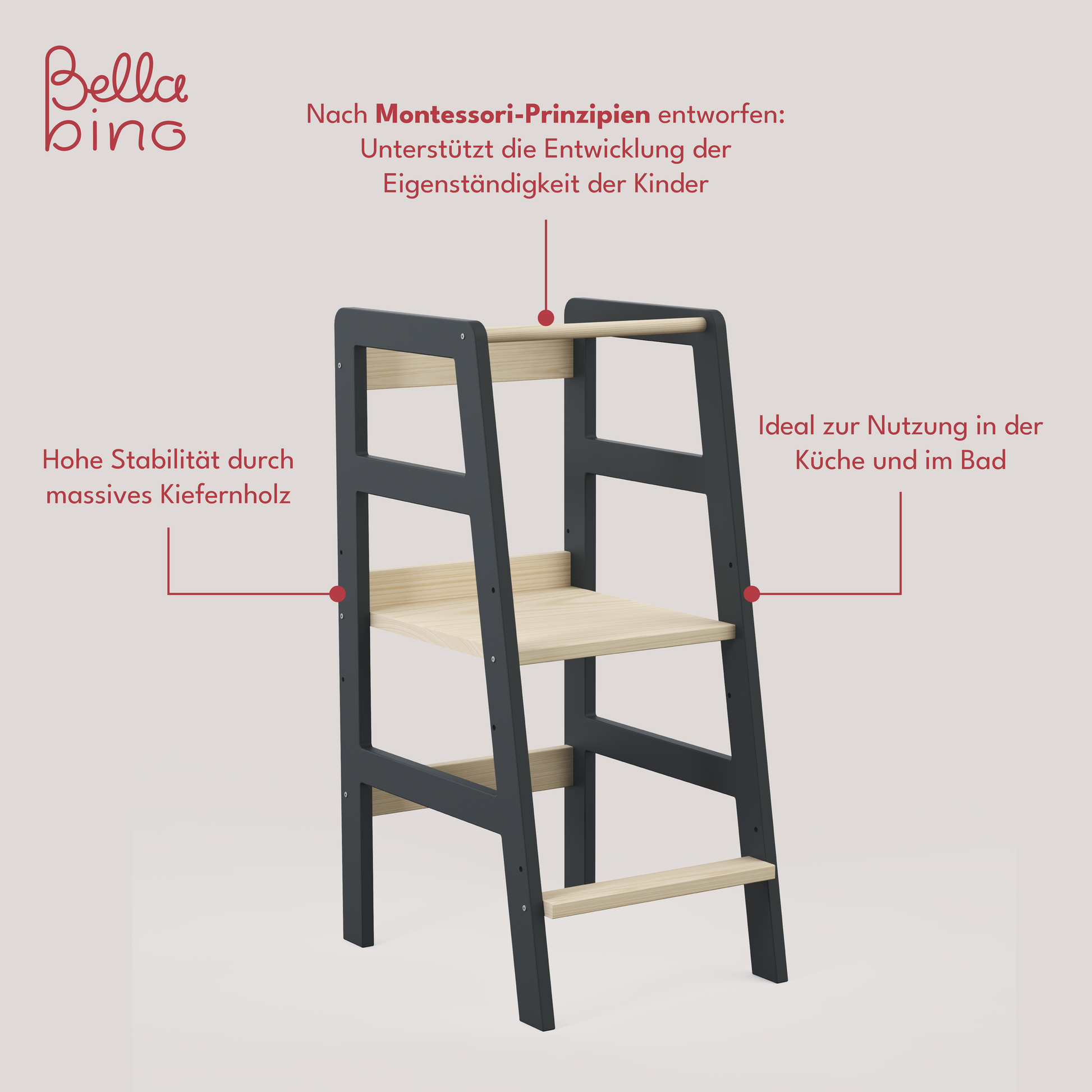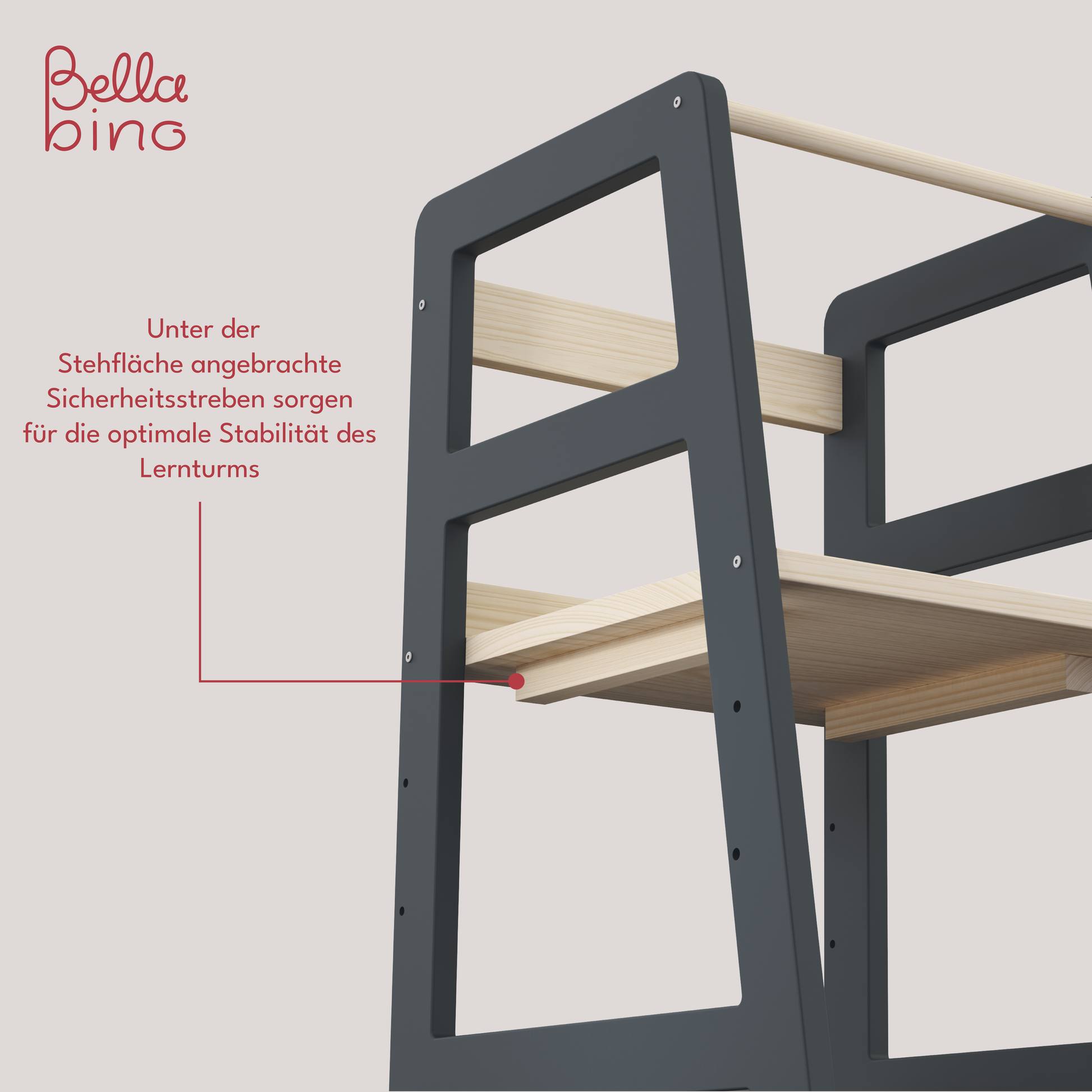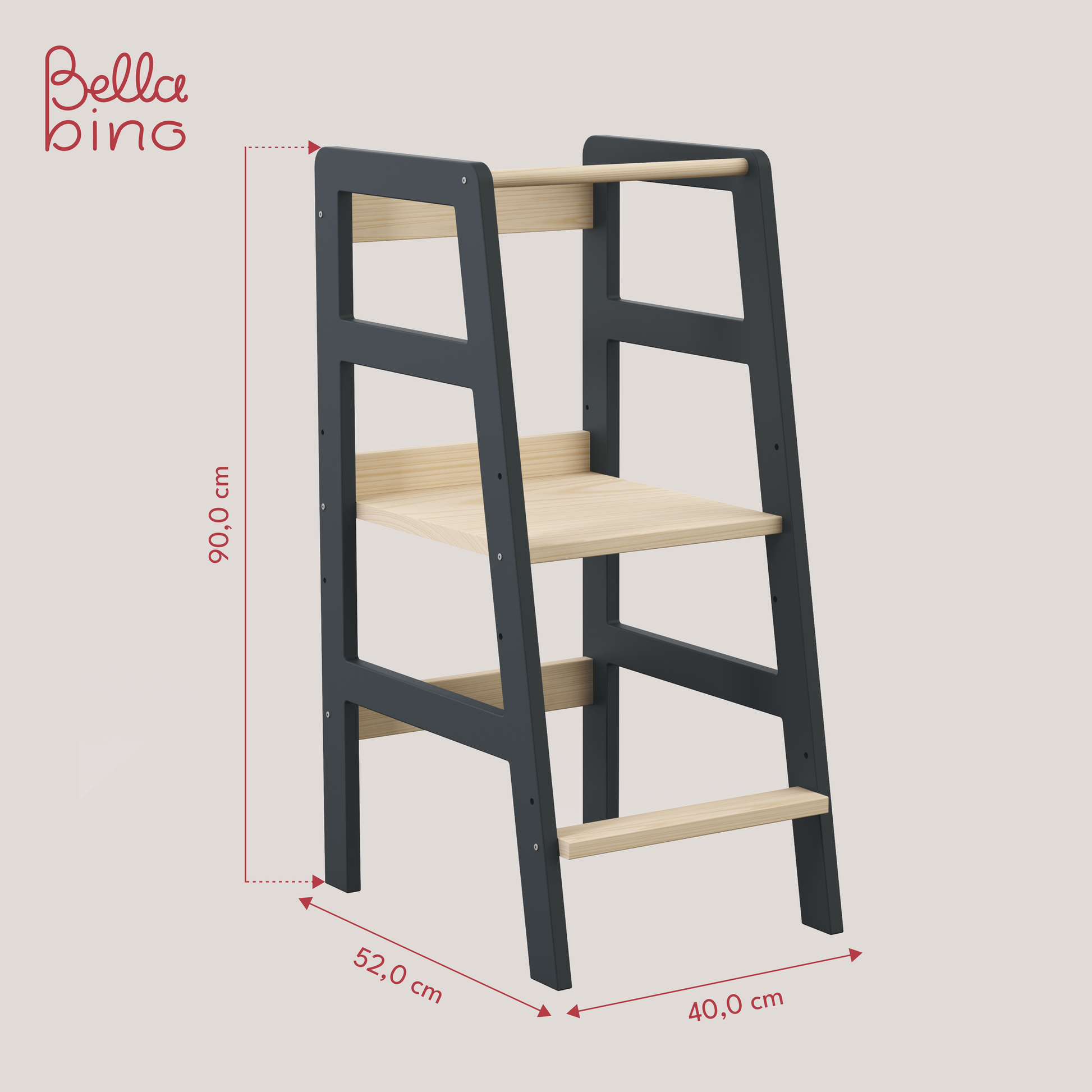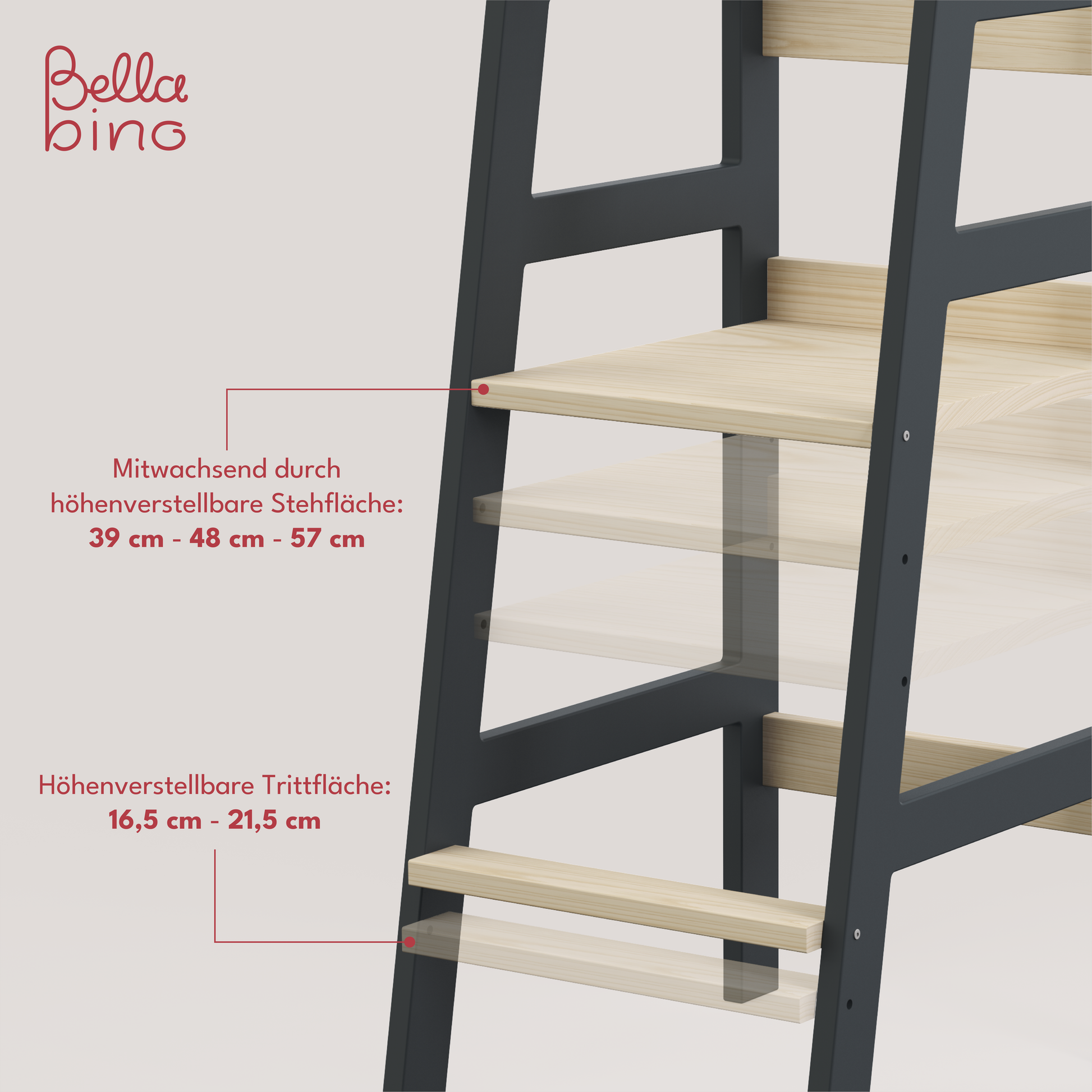 Der Lernturm von Bellabino ist optimal ausgestattet, um Ihnen und Ihrem Baby höchste Flexibilität zu bieten. Durch die praktische Stehfläche, die auf drei Stufen (39, 48 und 57 cm) einstellbar ist, passt sich der Turm wunderbar an die Größe Ihres Kindes an. Das Trittbrett kann ebenfalls auf zwei verschiedenen Höhen (16,5 und 21,5 cm) genutzt werden. Dank der hohen Festigkeit des Massivholzes, die für eine Tragfähigkeit von bis zu 50 kg sorgt, bleibt der 'Milo' ein treuer Begleiter für lange Zeit.