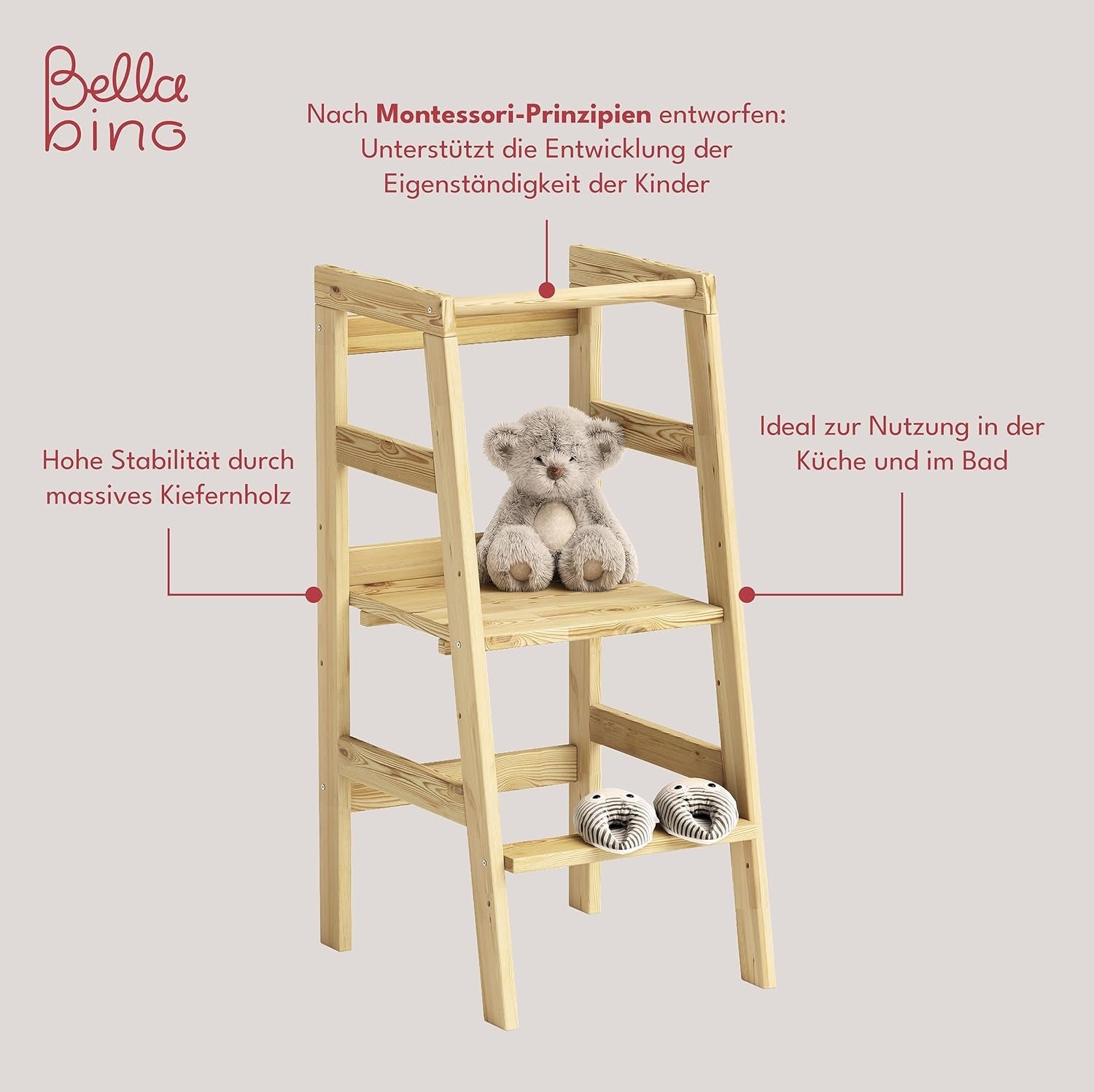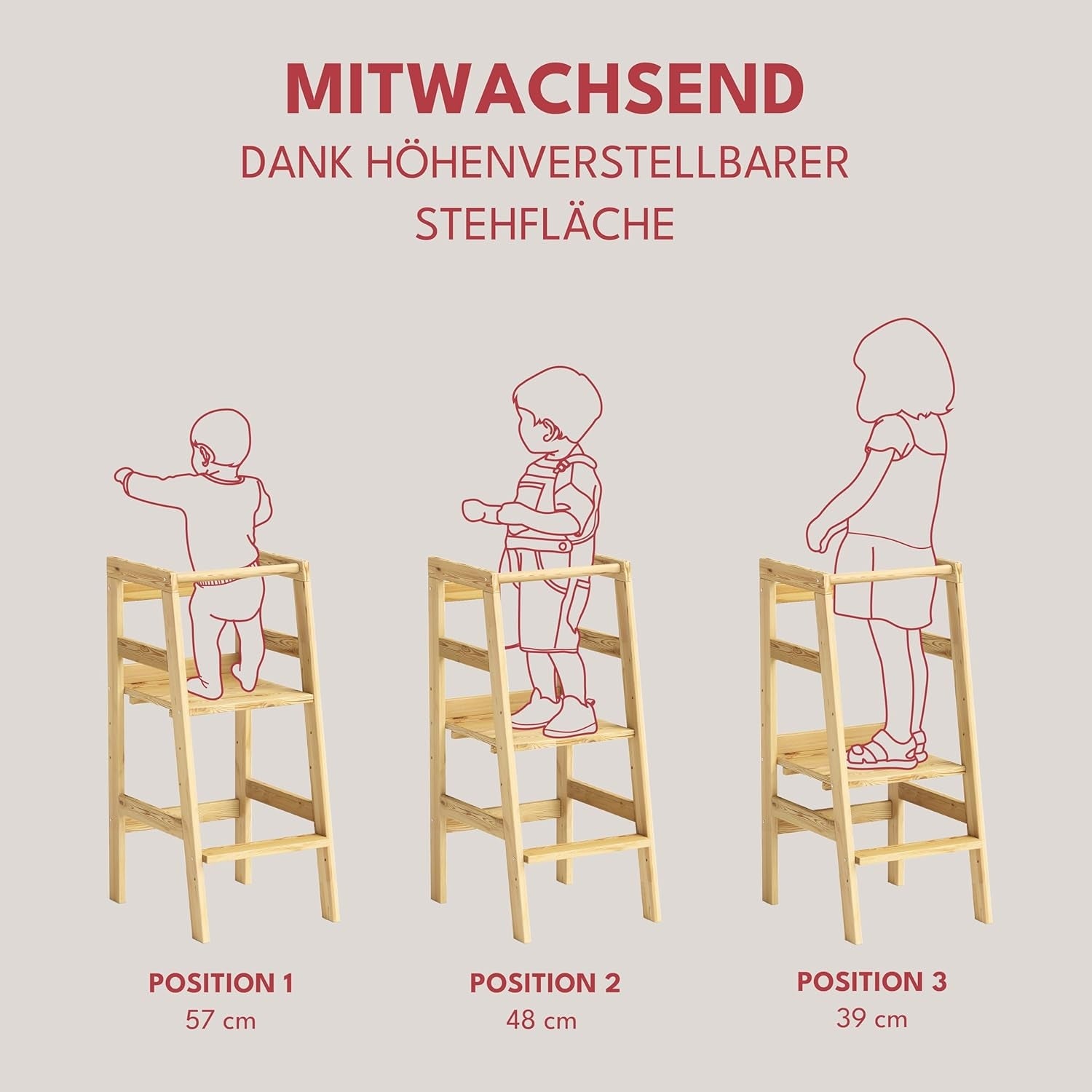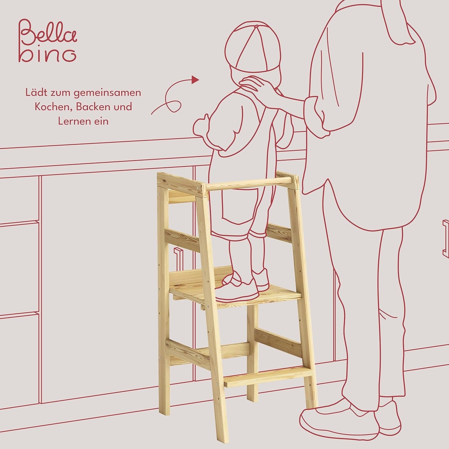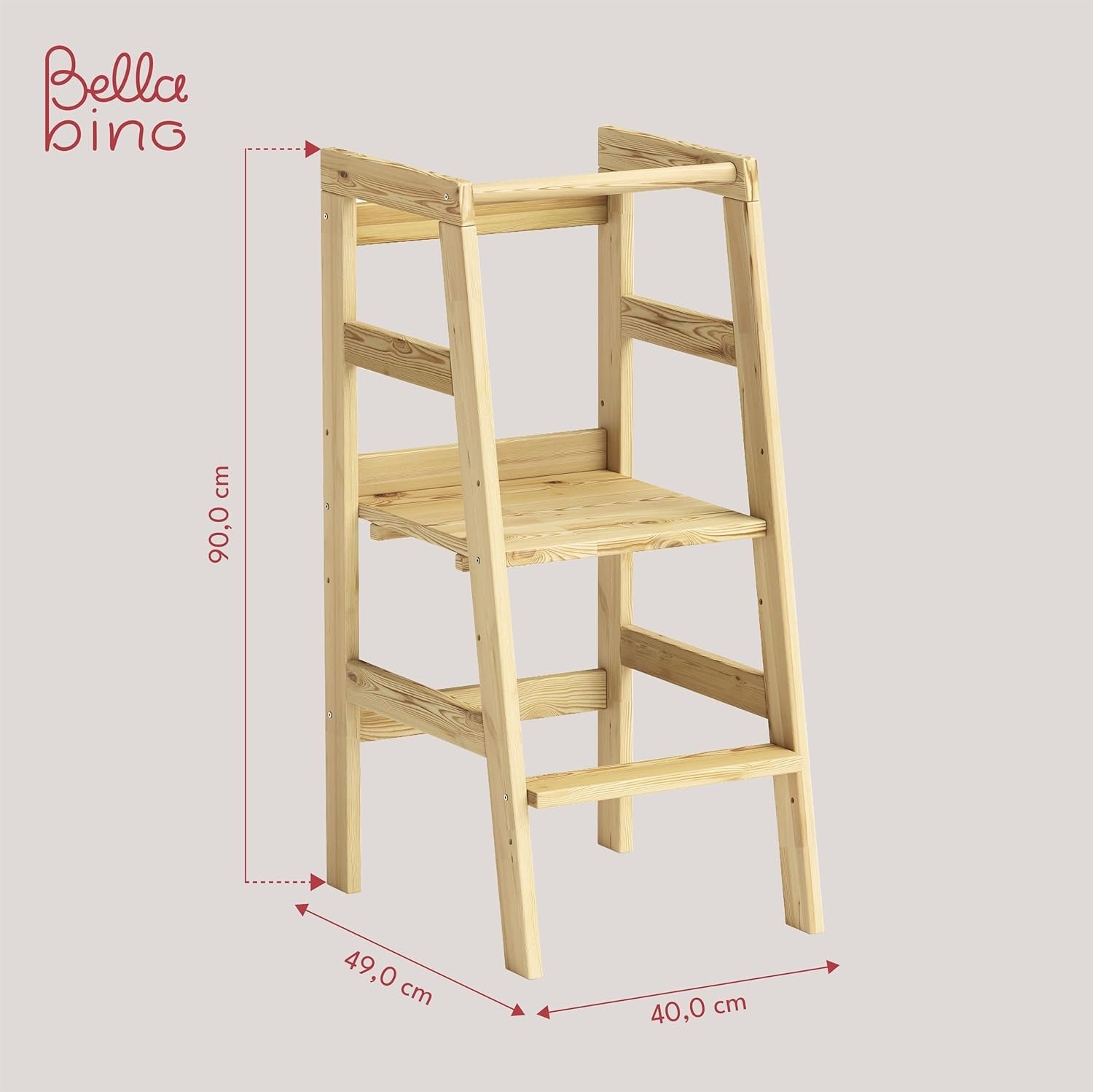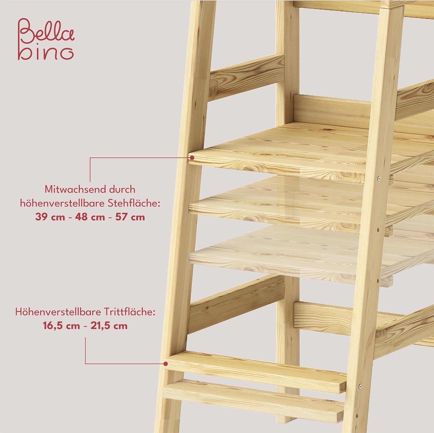 Der Lernturm von Bellabino ist optimal ausgestattet, um Ihnen und Ihrem Baby höchste Flexibilität zu bieten. Durch die praktische Stehfläche, die auf drei Stufen (39, 48 und 57 cm) einstellbar ist, passt sich der Turm wunderbar an die Größe Ihres Kindes an. Das Trittbrett kann ebenfalls auf zwei verschiedenen Höhen (16,5 und 21,5 cm) genutzt werden. Dank der hohen Festigkeit des Massivholzes, die für eine Tragfähigkeit von bis zu 50 kg sorgt, bleibt der 'Milo' ein treuer Begleiter für lange Zeit.