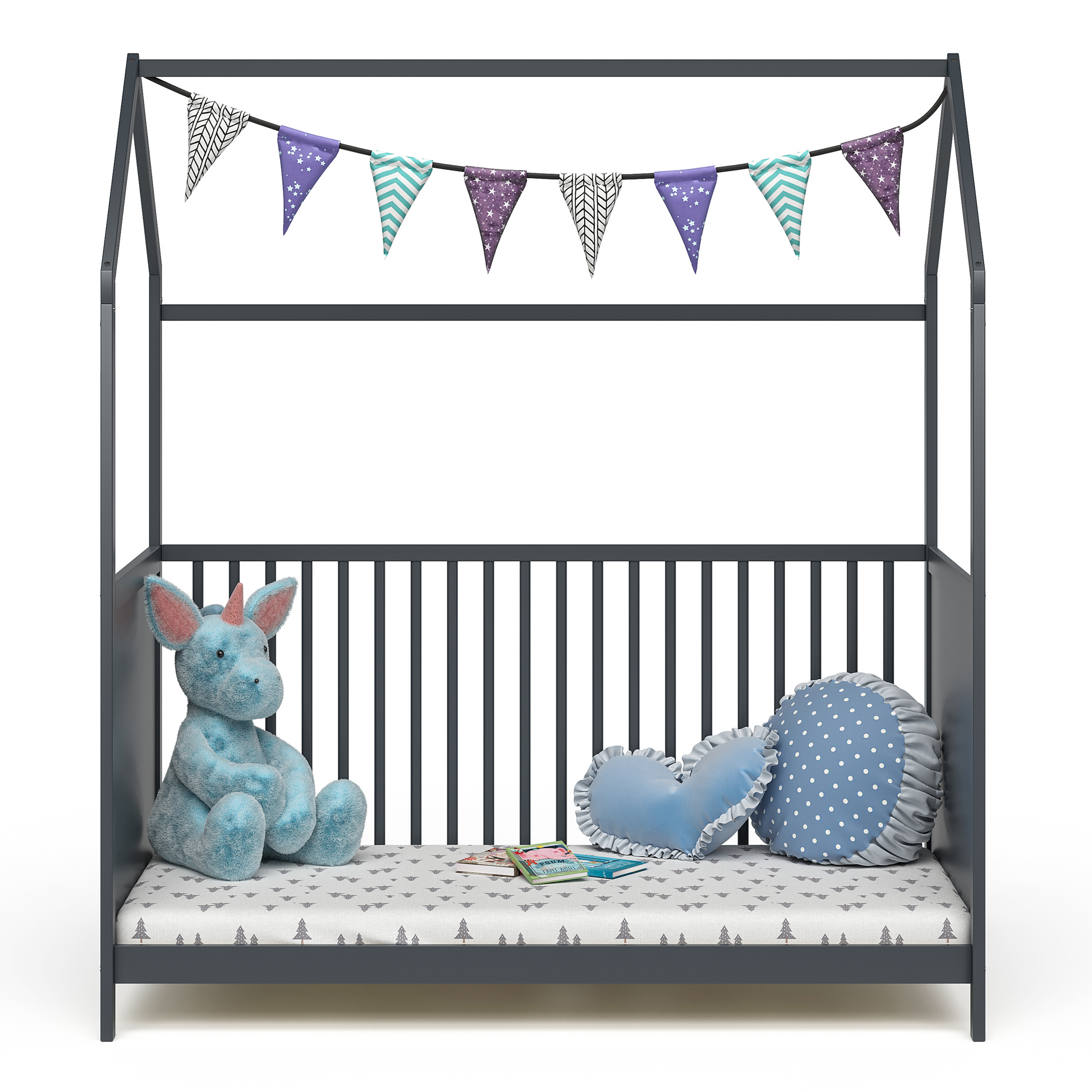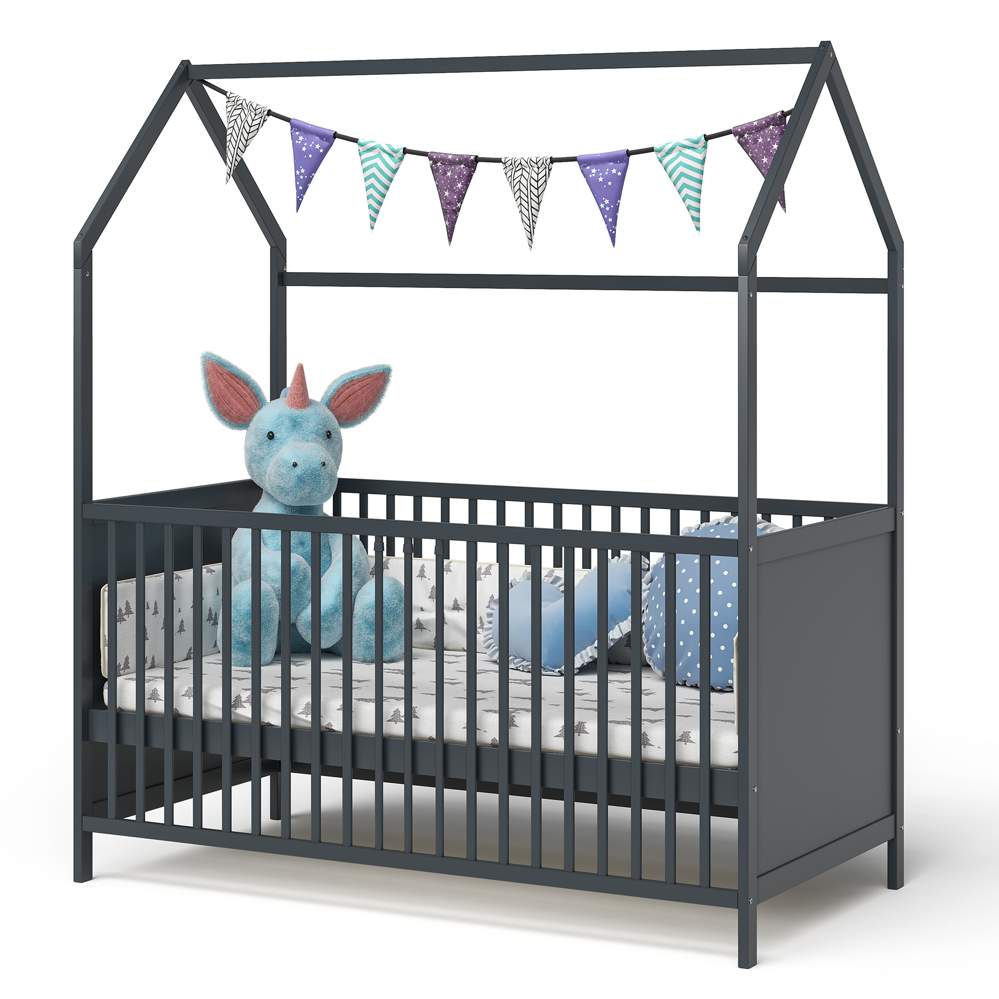 Das Hausbett ist aus robuster Massivkiefer gefertigt (max. Belastbarkeit 50 kg) und bietet eine geräumige Liegefläche von 70 x 140 cm, die den Schlafbedürfnissen eines Babys optimal nachkommt. Die Liegefläche ist mit einem höhenverstellbaren Lattenrost ausgestattet, damit die Betthöhe an verschiedene Körpergrößen angepasst werden kann. Das Bettgitter, das die Liegefläche vollständig umgibt, ist mit 3 Schlupfsprossen versehen, die sich ohne Aufwand abnehmen lassen. So kann Ihr Kind problemlos aus dem Bett heraus- und hereinkrabbeln.