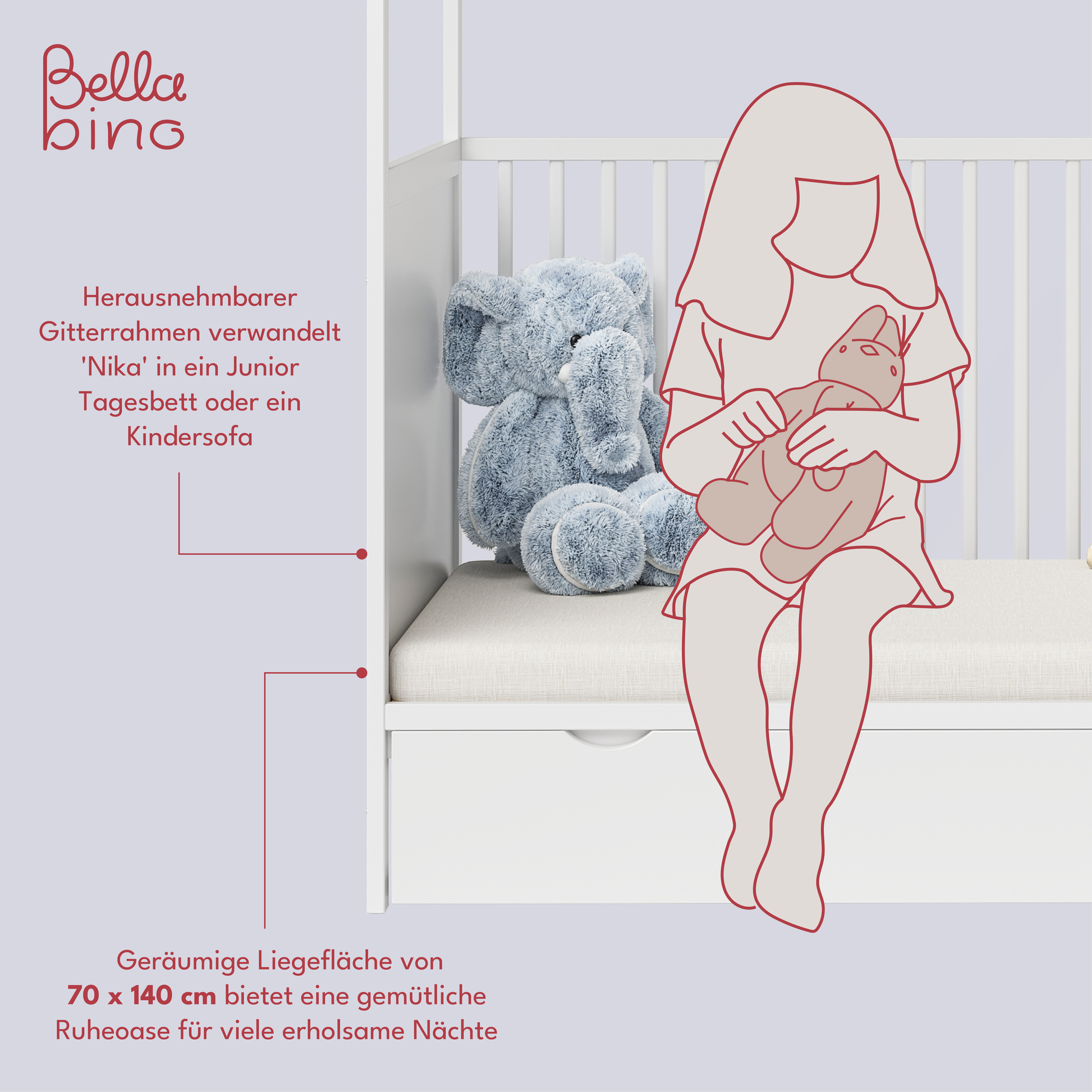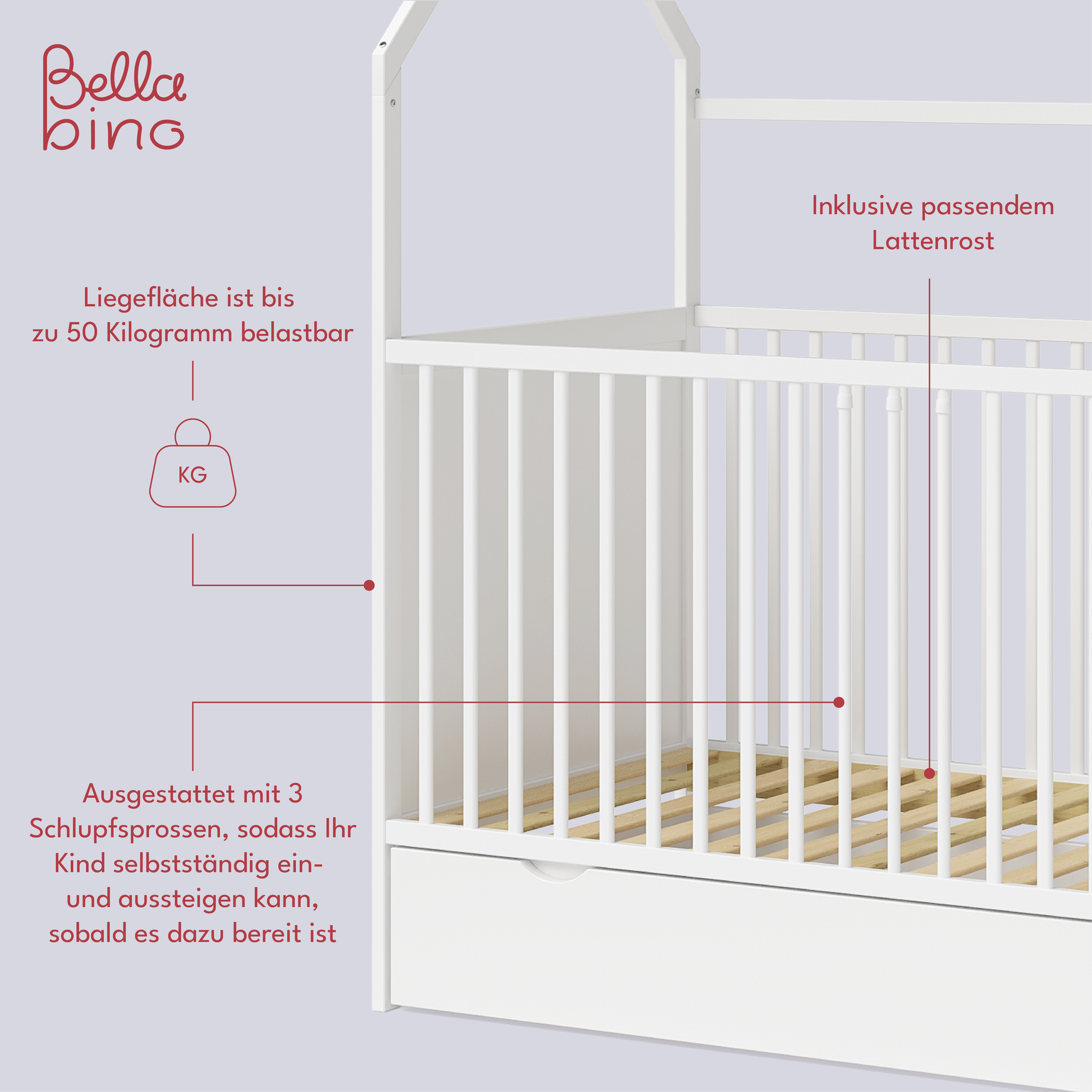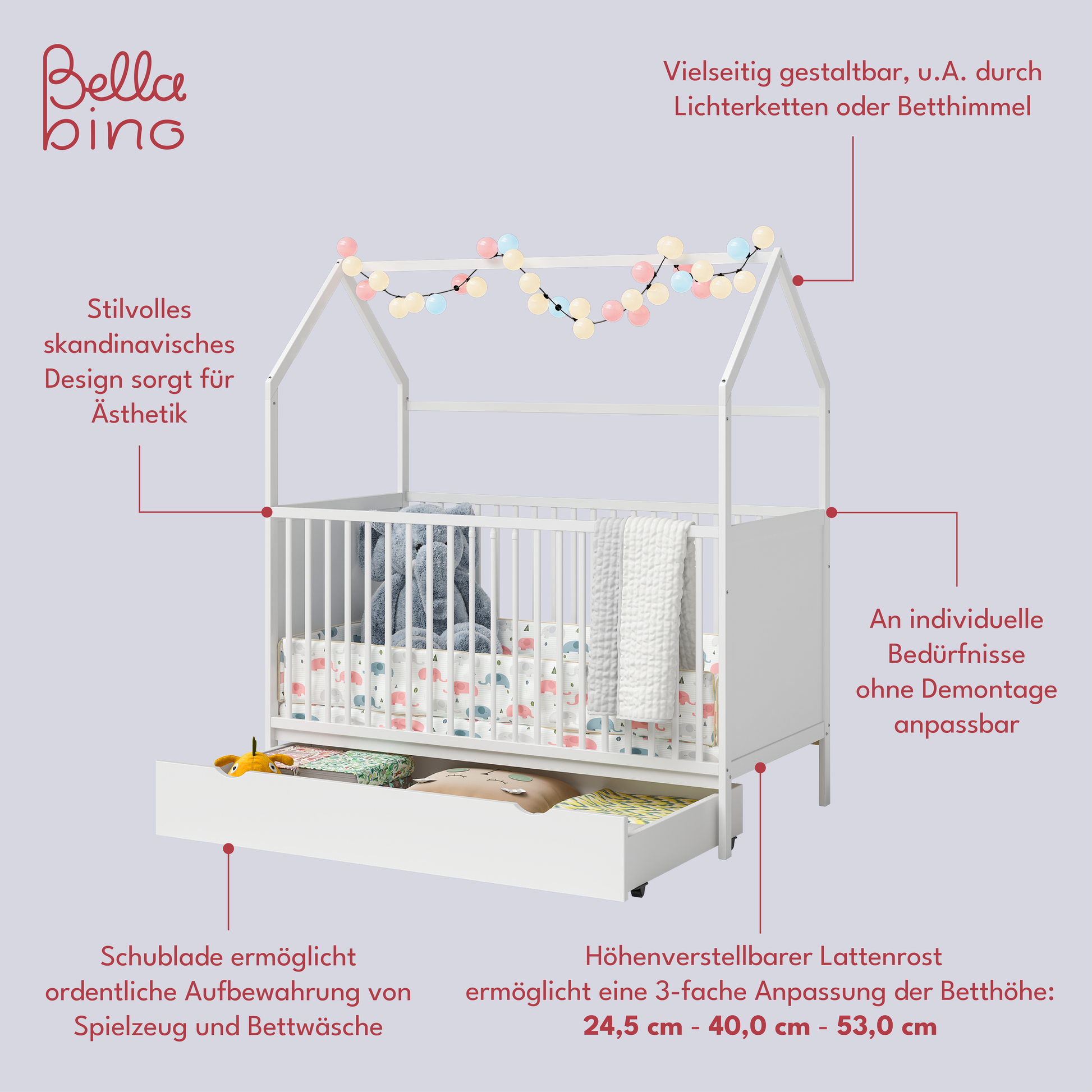 'Nika' ist aus robuster Massivkiefer gefertigt, die dem Hausbett eine maximale Belastbarkeit von 50 kg garantiert. Die geräumige Liegefläche von 70 x 140 cm sorgt zudem für eine gemütliche Ruheoase und verspricht Ihrem Baby viele erholsame Nächte. Das Bettgitter, das die Liegefläche schützt, ist mit 3 Schlupfsprossen ausgestattet. Einmal die Sprossen entfernt, kann Ihr Kind selbständig aus dem Bett heraus- und hereinkrabbeln. Der Bettausstattung legt Bellabino zudem einen höhenverstellbaren Lattenrost bei, mit welchem die Betthöhe von 53,0 cm auf 40,0 cm und auf 24,5 cm angepasst werden kann: So müssen Sie sich nicht tief bücken, um Ihr Baby aus seinem Bettchen zu holen.
