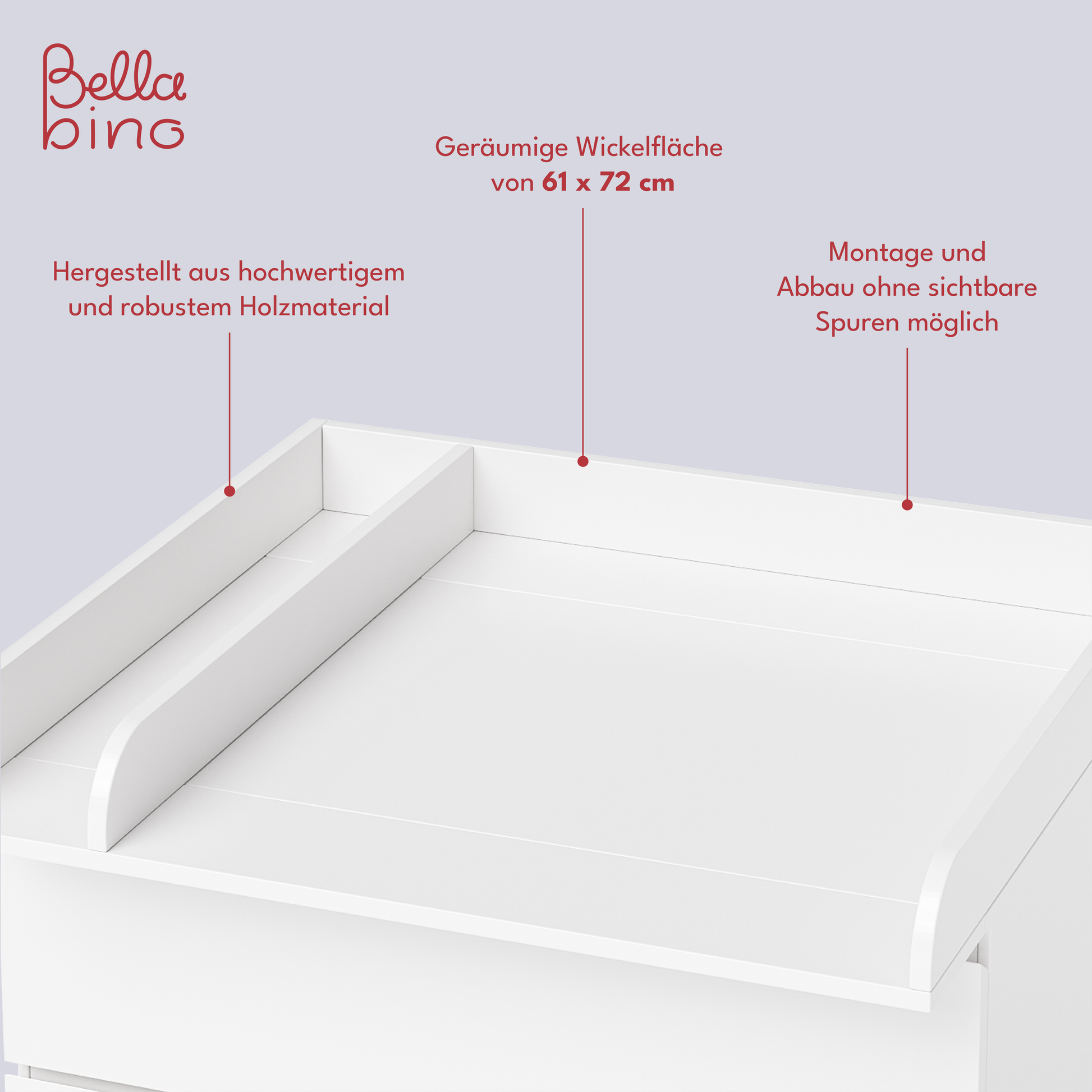 Mit einer großzügigen Wickelfläche von 61 x 72 cm bietet der Wickelaufsatz von Bellabino höchsten Komfort für das Baby beim Wickeln. Dabei überzeugt 'Oti' nicht nur mit seiner Funktionalität, sondern auch mit seiner Leichtigkeit, denn mit nur 4,5 kg Gewicht lässt er sich bequem auf- und abbauen. Die flexible seitliche Trennwand sorgt zudem dafür, dass alle Wickelutensilien griffbereit sind.