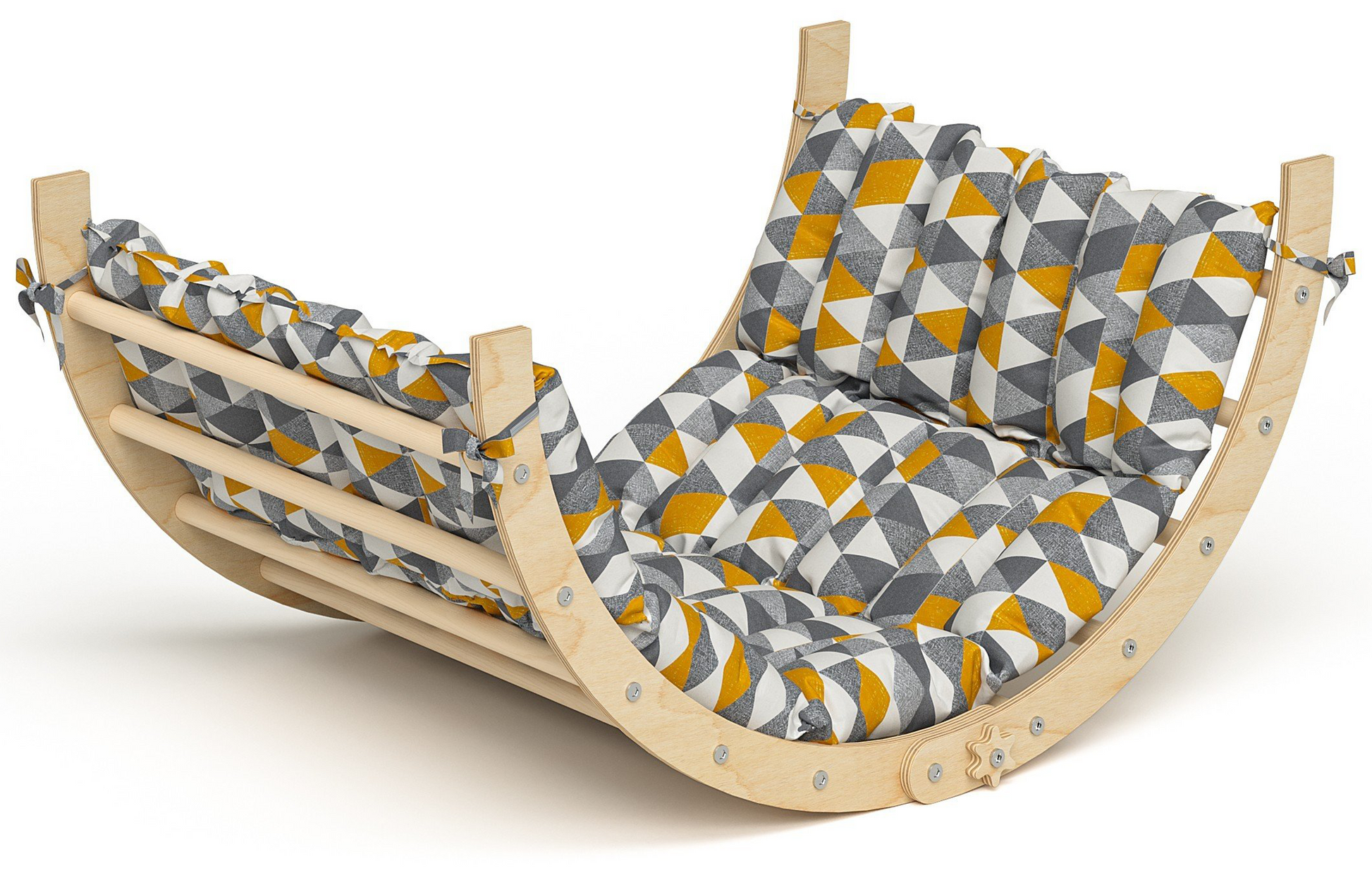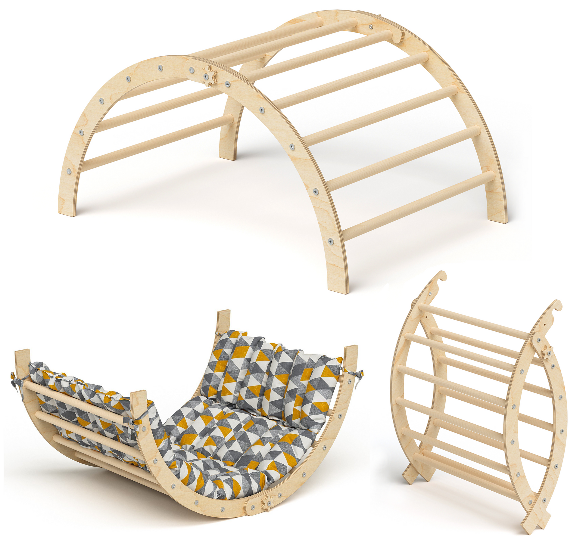 Ruki 2in1 Kletterbogen und Wippe zusammenklappbar, inkl. Matratze "Dreiecke", natur lackiert, Buche Massivholz