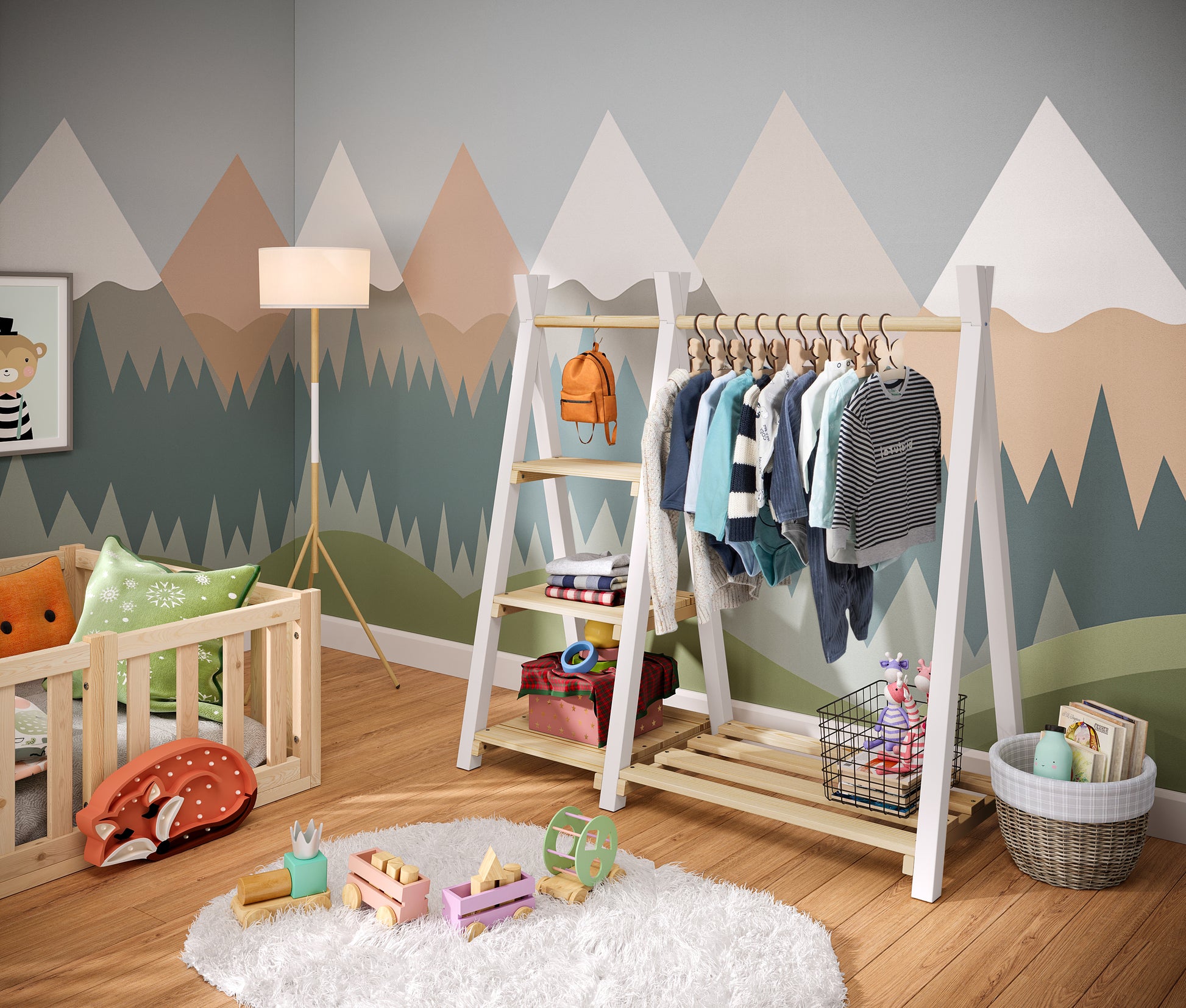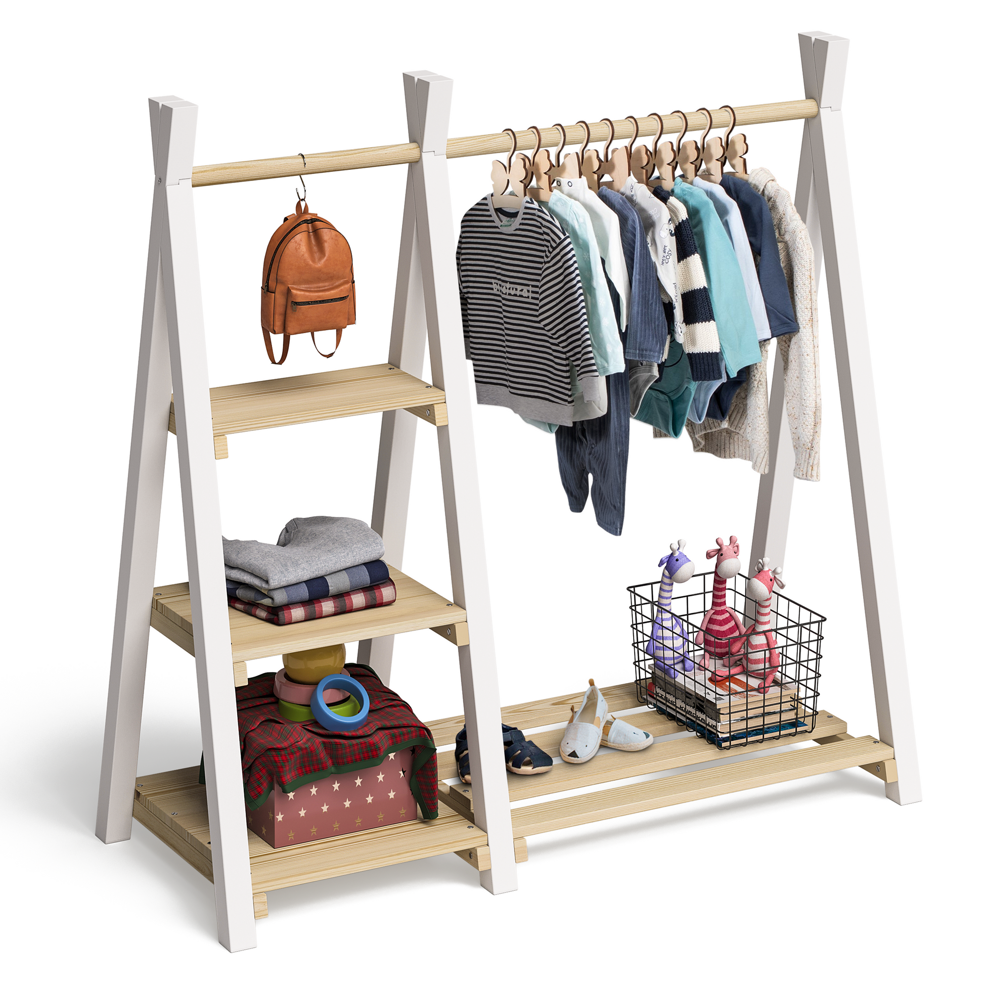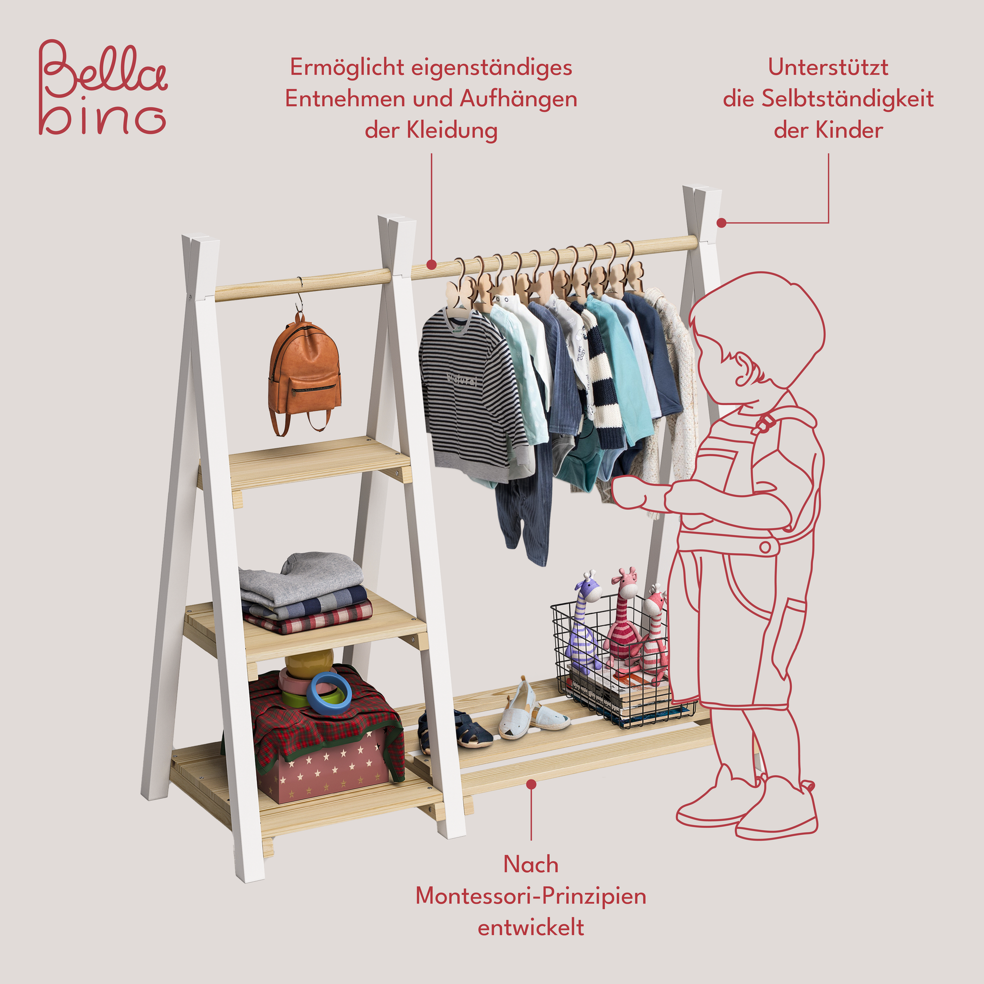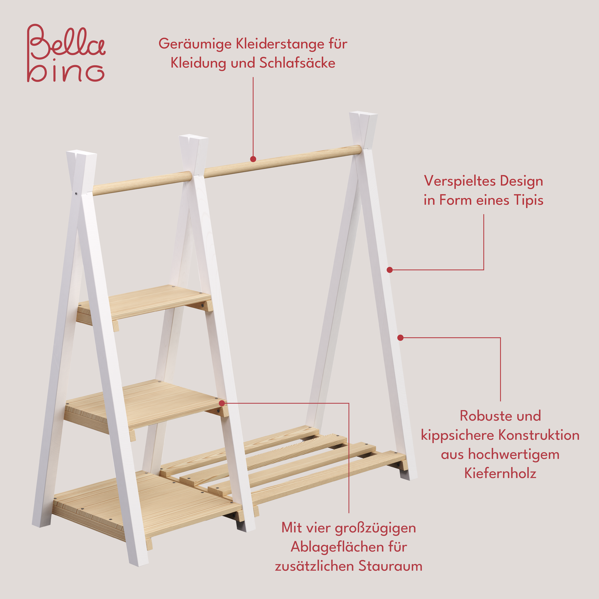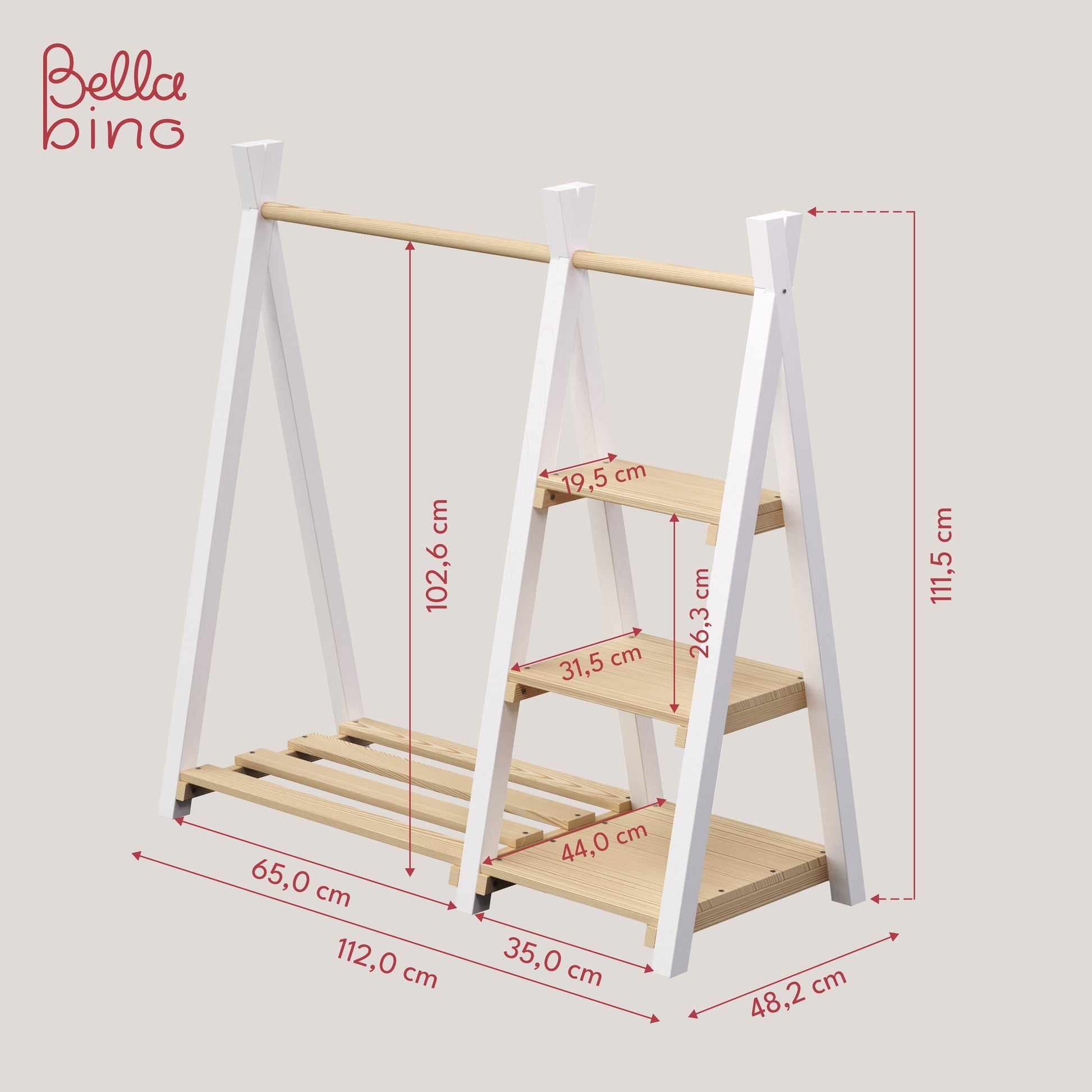 Die Bellabino 'Ryck' Tipi-Kleiderstange vereint praktische Organisation mit stilvollem Design aus massivem Kiefernholz. Einfach zu montieren und funktional im Design, ist sie die ideale Lösung, um Ihrem Kind frühzeitig Verantwortung für seine Kleidung beizubringen.