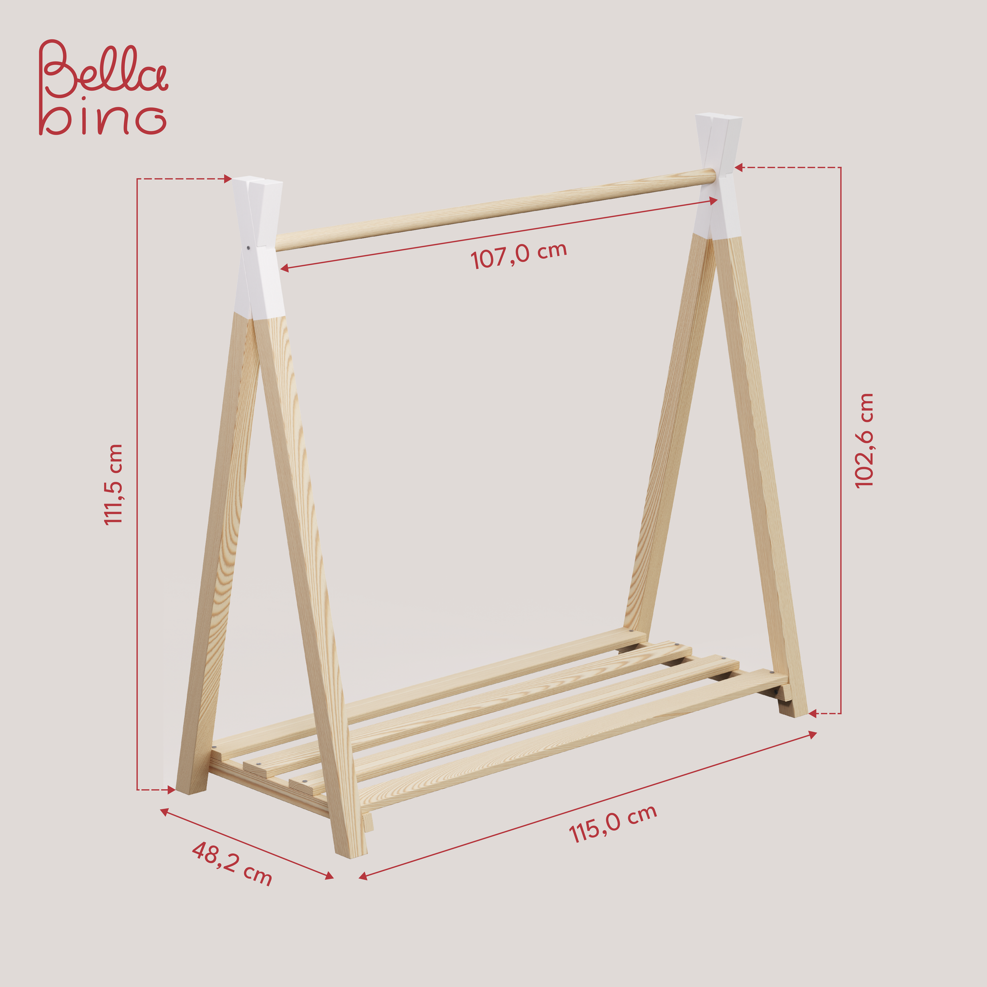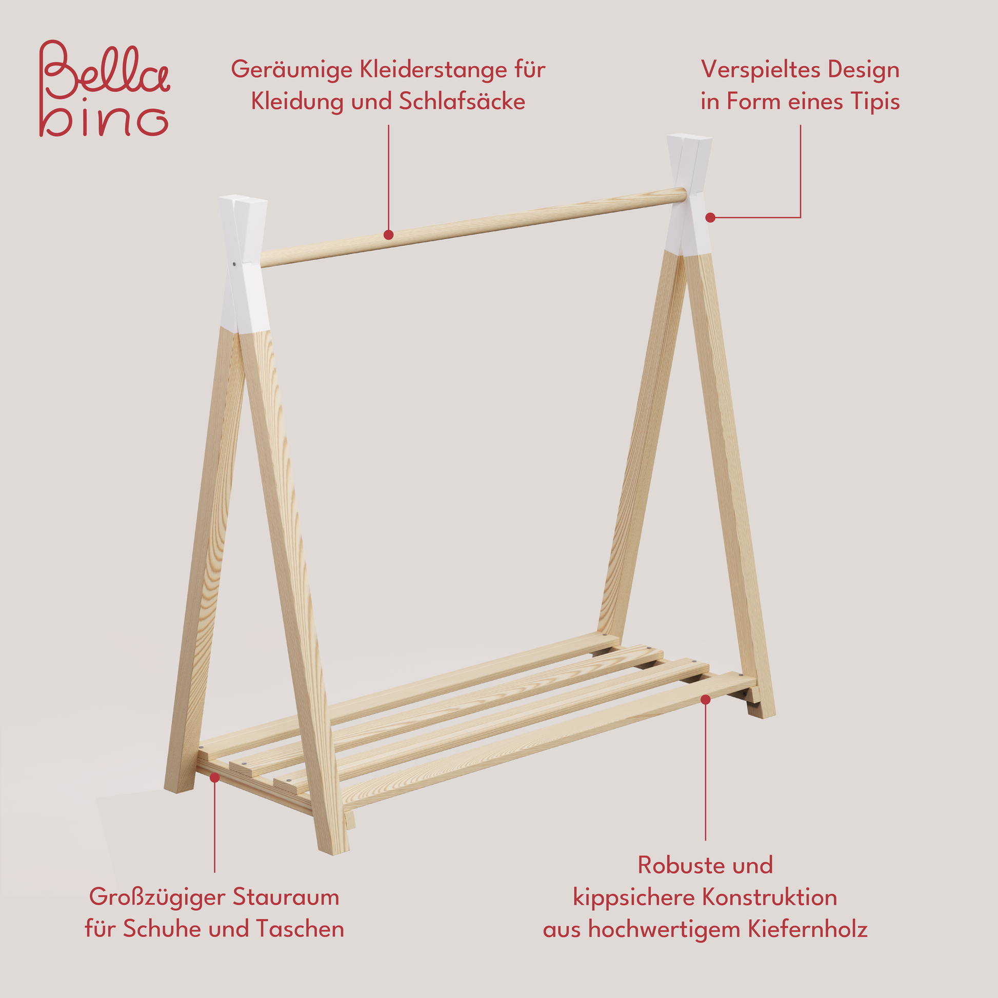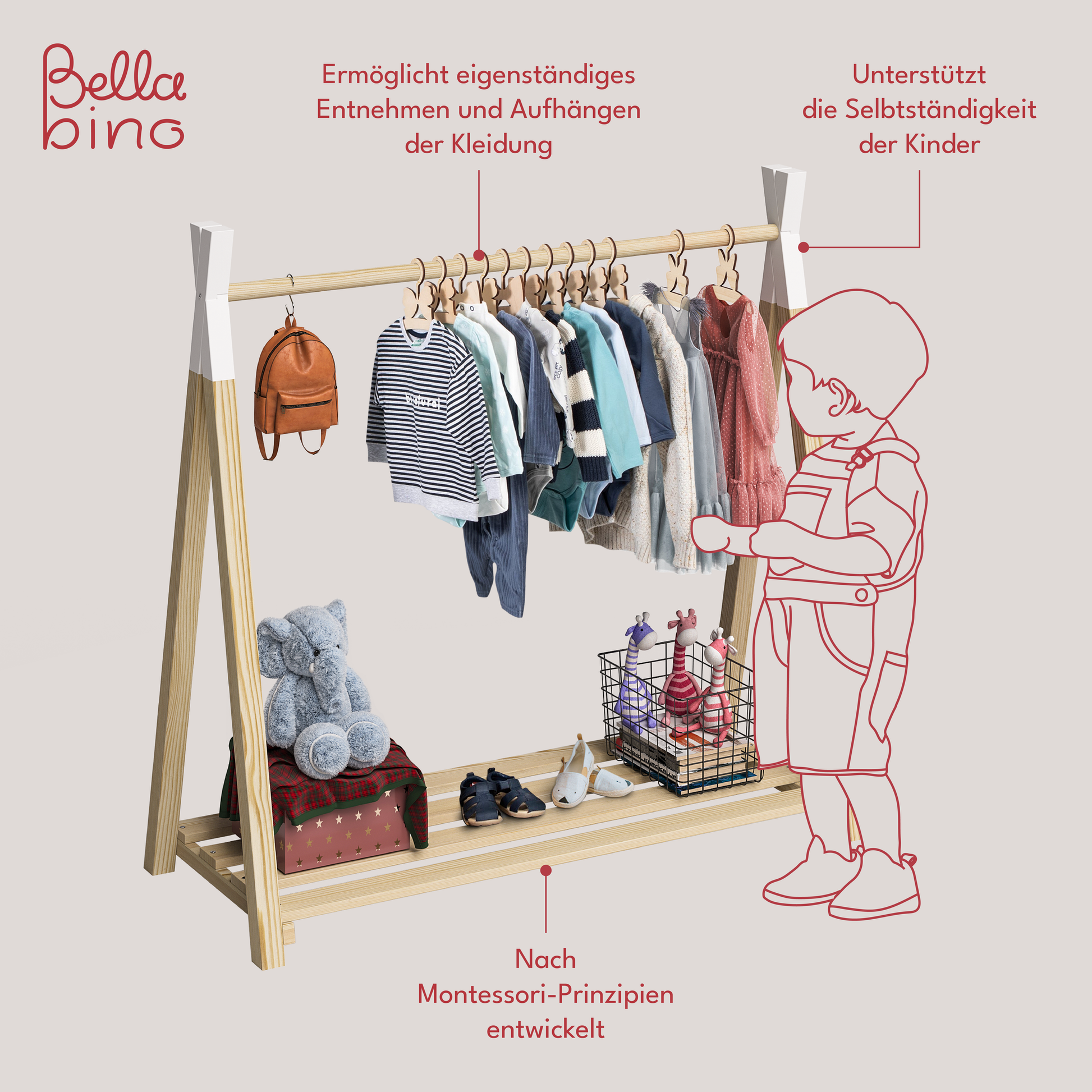 Die Kindergarderobe von Bellabino ist aus robustem Kiefernholz gefertigt und kann bis zu 5 kg belastet werden. Dank seiner funktionalen Konstruktion bietet 'Ryck' ausreichend Platz für diverse Kleidungsstücke: Jacken, Pullover und T-Shirts können an die Stange aufgehängt und ordentlich aufbewahrt werden. Die Kleiderstange ist nach Montessori-Prinzipien konzipiert, sodass die Kinder schnell und flexibel ihr Lieblingsstück von der Stange abnehmen und wieder verstauen können – ganz ohne Hilfe der Eltern.