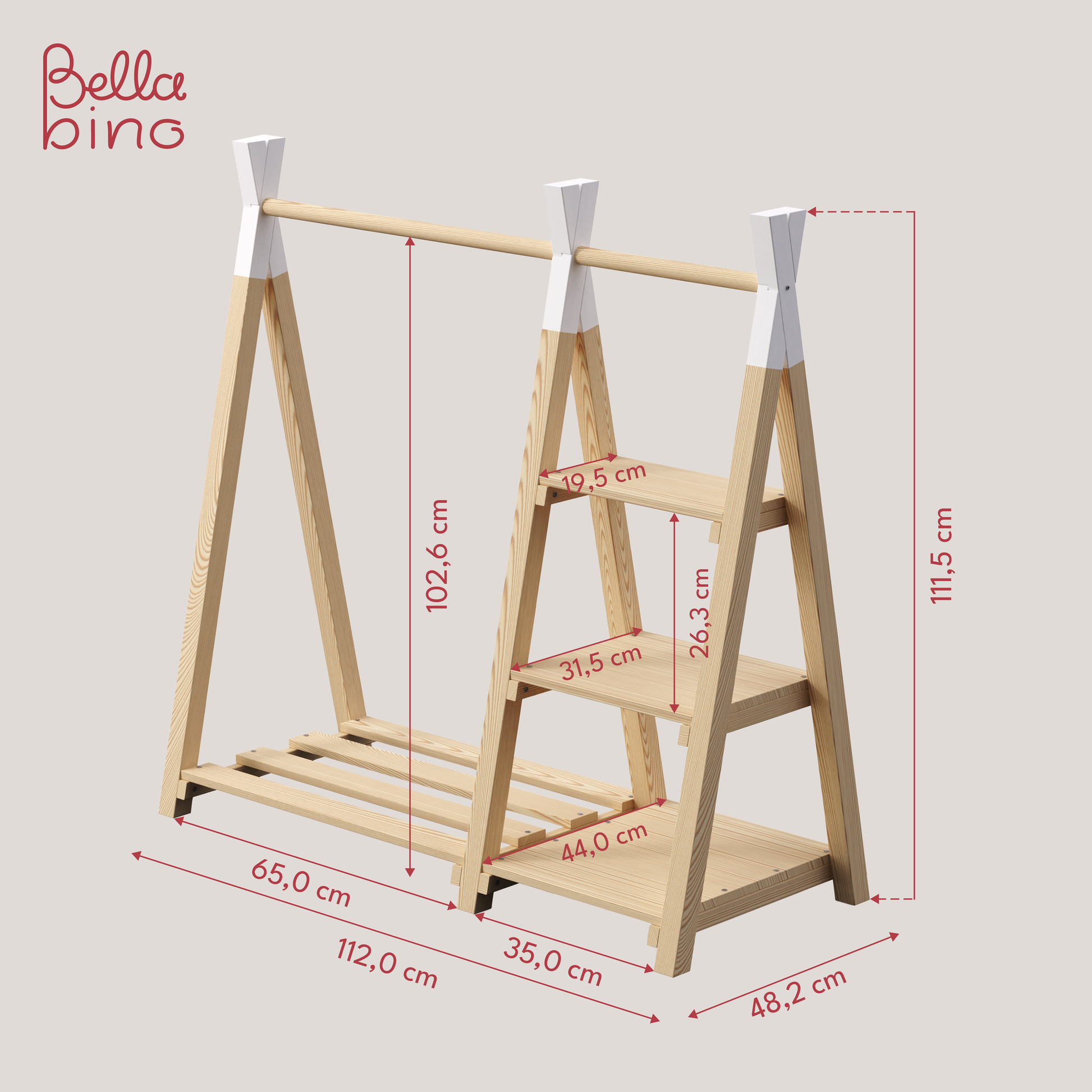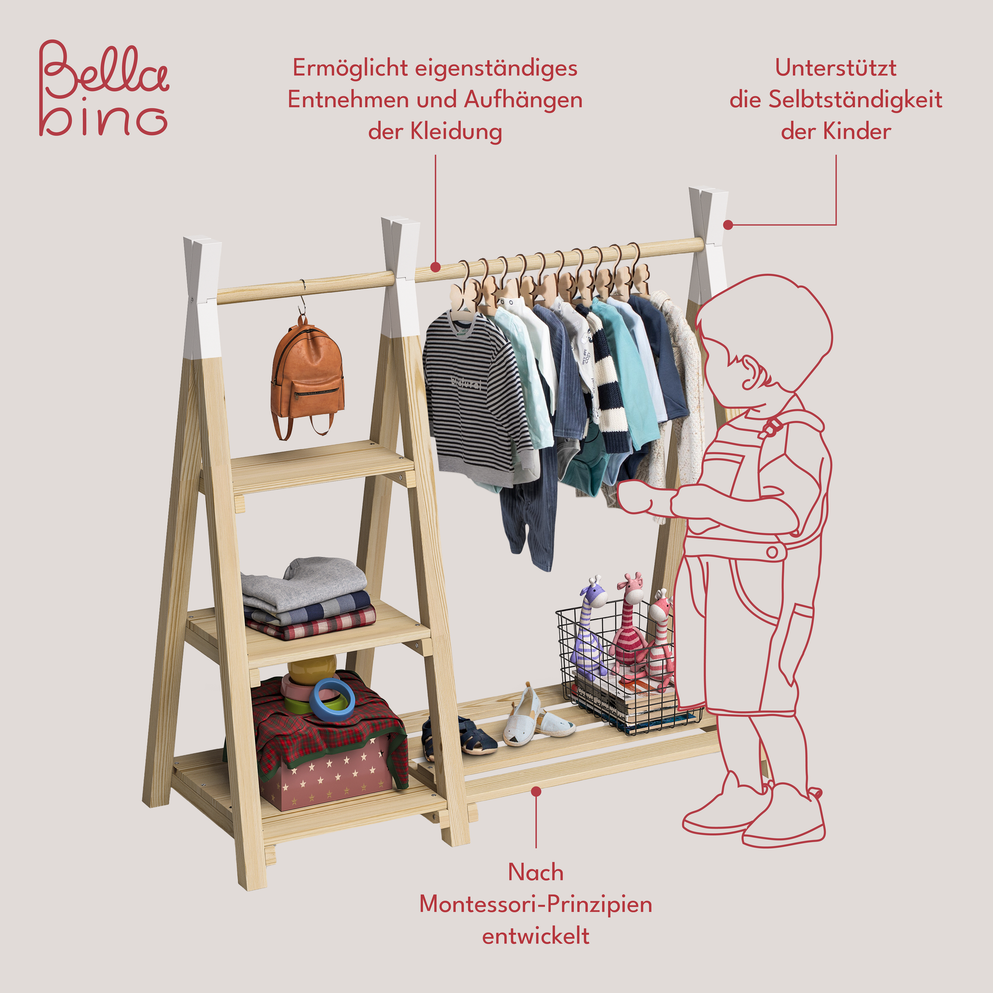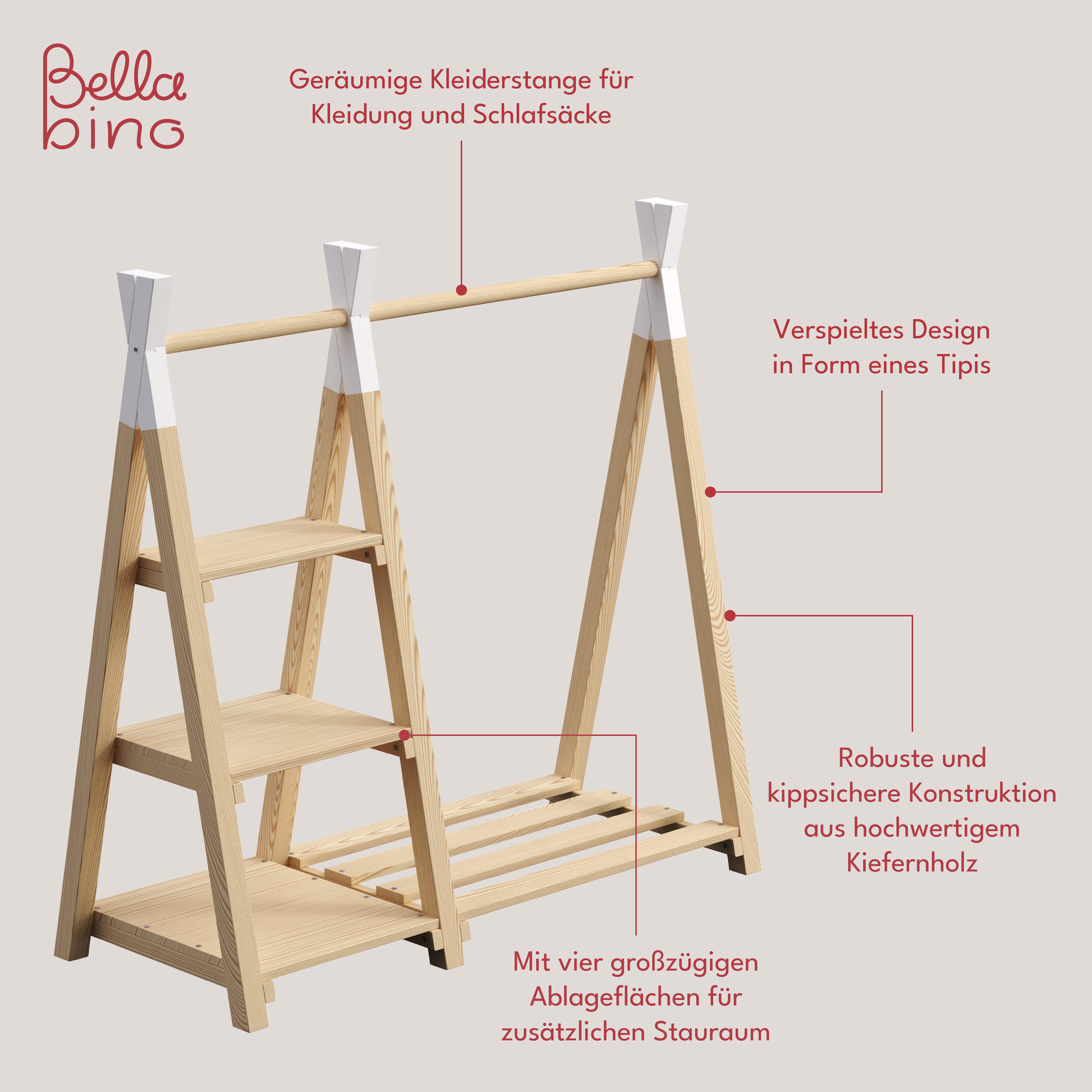 Die Bellabino 'Ryck' Tipi-Kleiderstange vereint praktische Organisation mit stilvollem Design aus massivem Kiefernholz. Einfach zu montieren und funktional im Design, ist sie die ideale Lösung, um Ihrem Kind frühzeitig Verantwortung für seine Kleidung beizubringen.