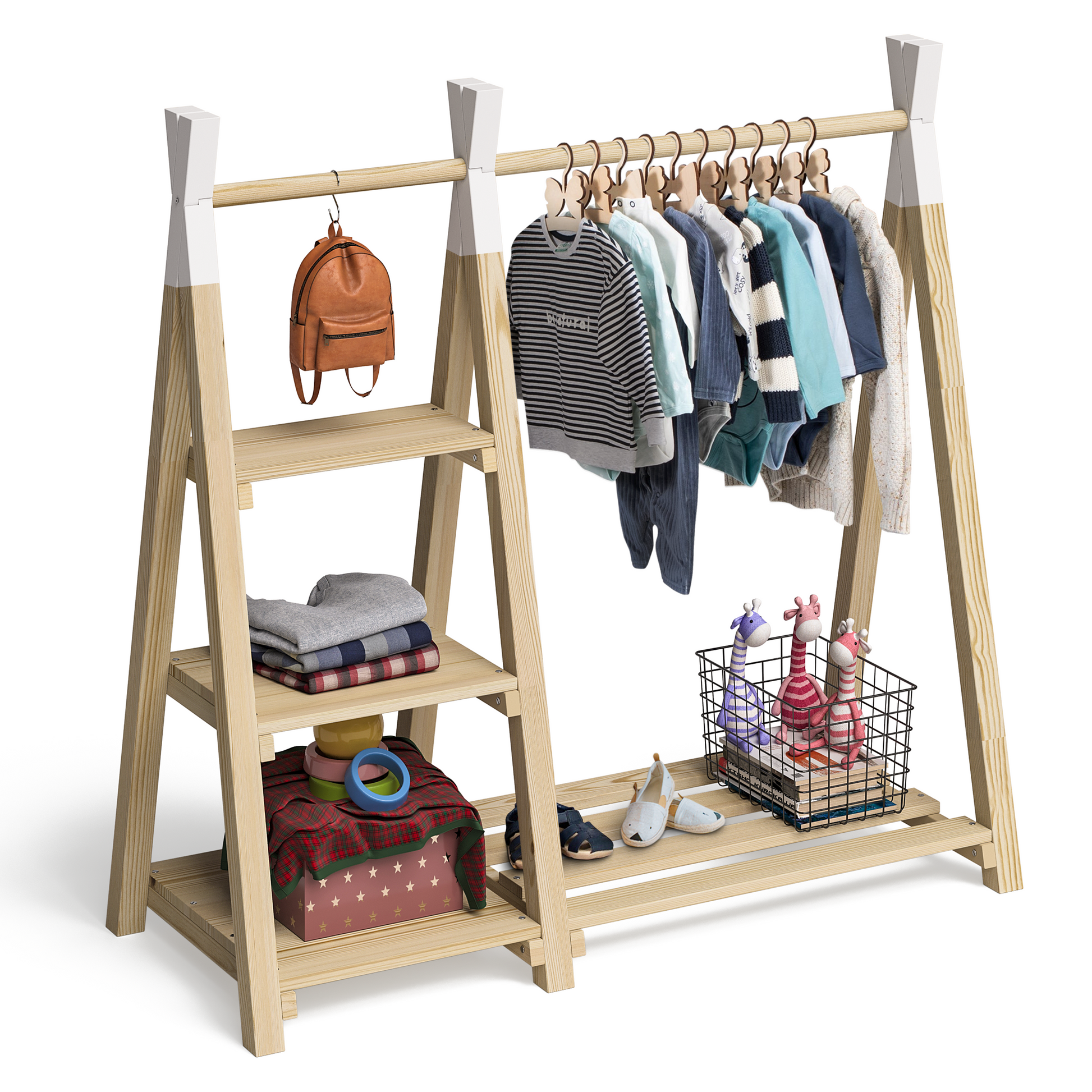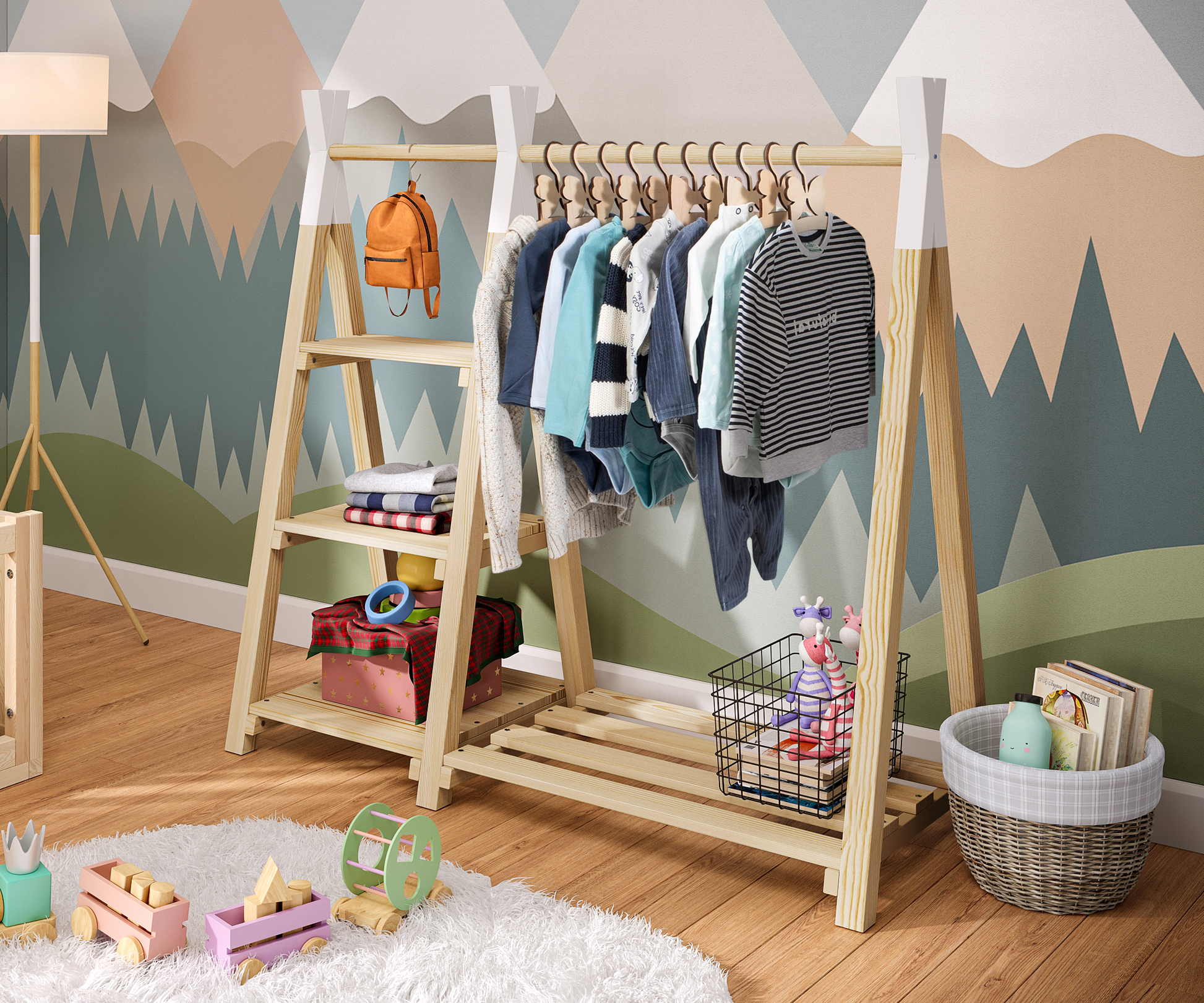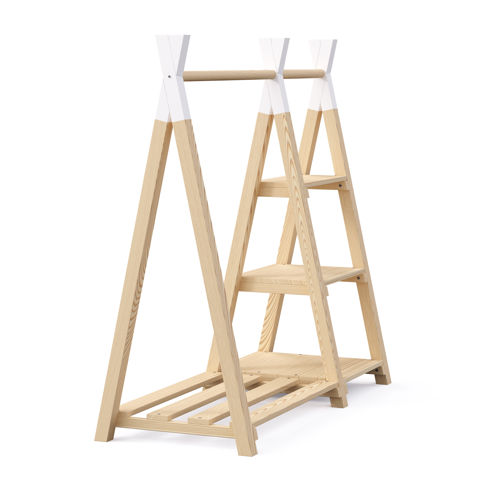 Die Bellabino 'Ryck' Tipi-Kleiderstange vereint praktische Organisation mit stilvollem Design aus massivem Kiefernholz. Einfach zu montieren und funktional im Design, ist sie die ideale Lösung, um Ihrem Kind frühzeitig Verantwortung für seine Kleidung beizubringen.
