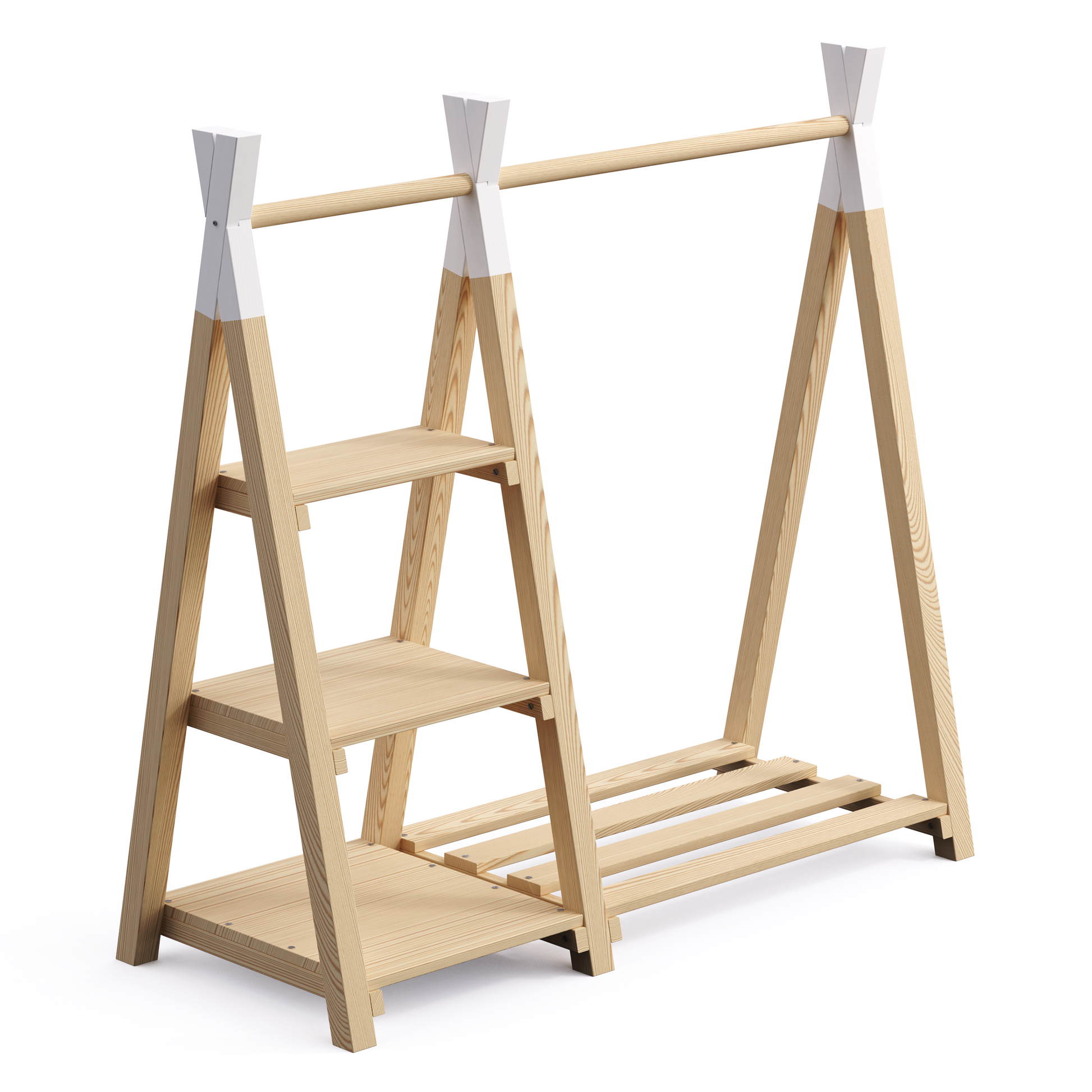 Ryck Tipi-Kleiderstange, natur mit weißen Spitzen, Kiefer massiv, inkl. 3 Regalen und Schuhablagefläche