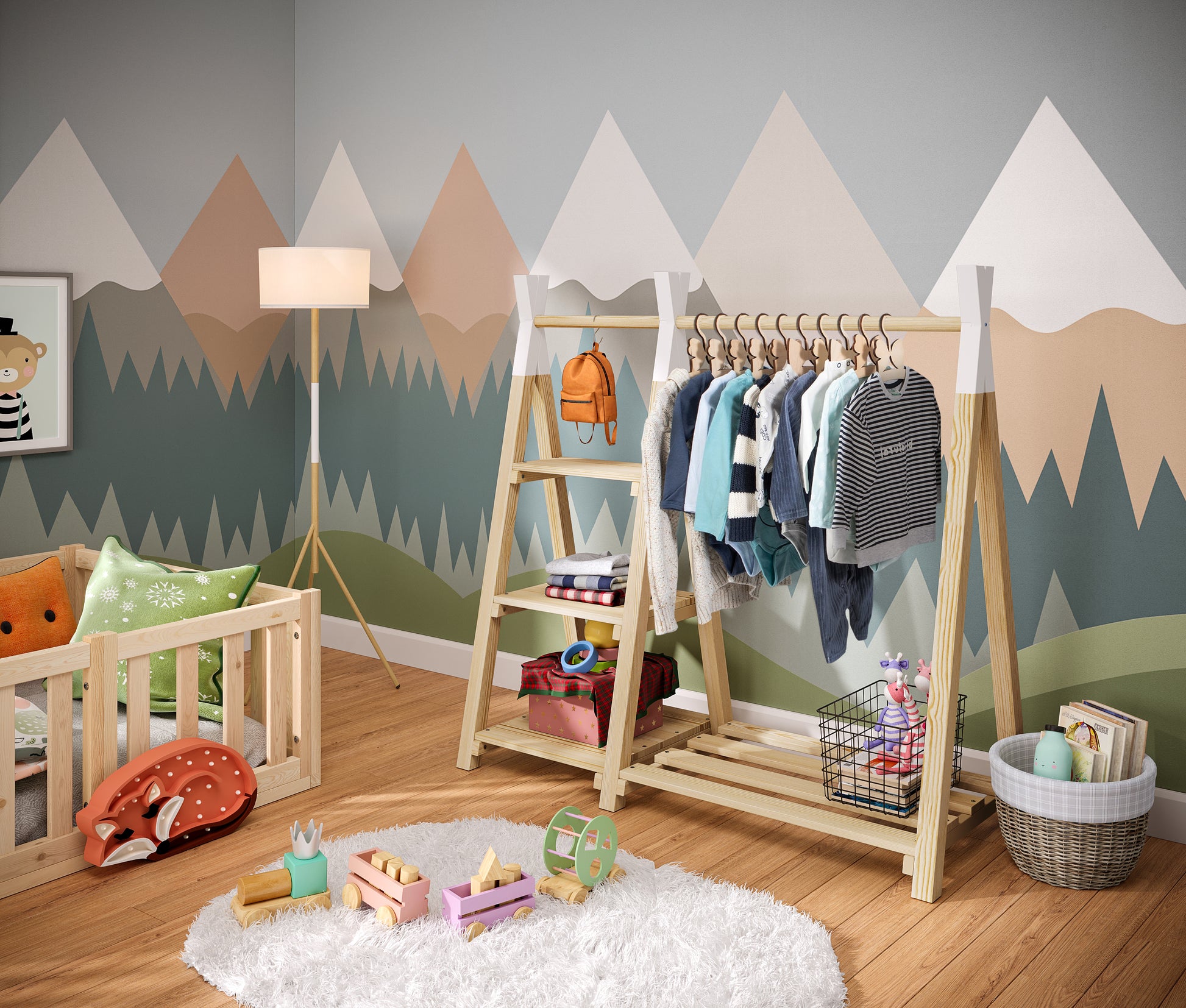 Die robuste Kleiderstange 'Ryck' von Bellabino aus Kiefernholz bietet eine stabile Konstruktion, auf der Jacken, Pullover, T-Shirts und mehr sicher aufgehängt werden können. Das nach Montessori-Prinzipien konzipierte Design ermöglicht es Kindern, ihre Lieblingsstücke eigenständig auf- und abzuhängen, ohne Hilfe von Erwachsenen.