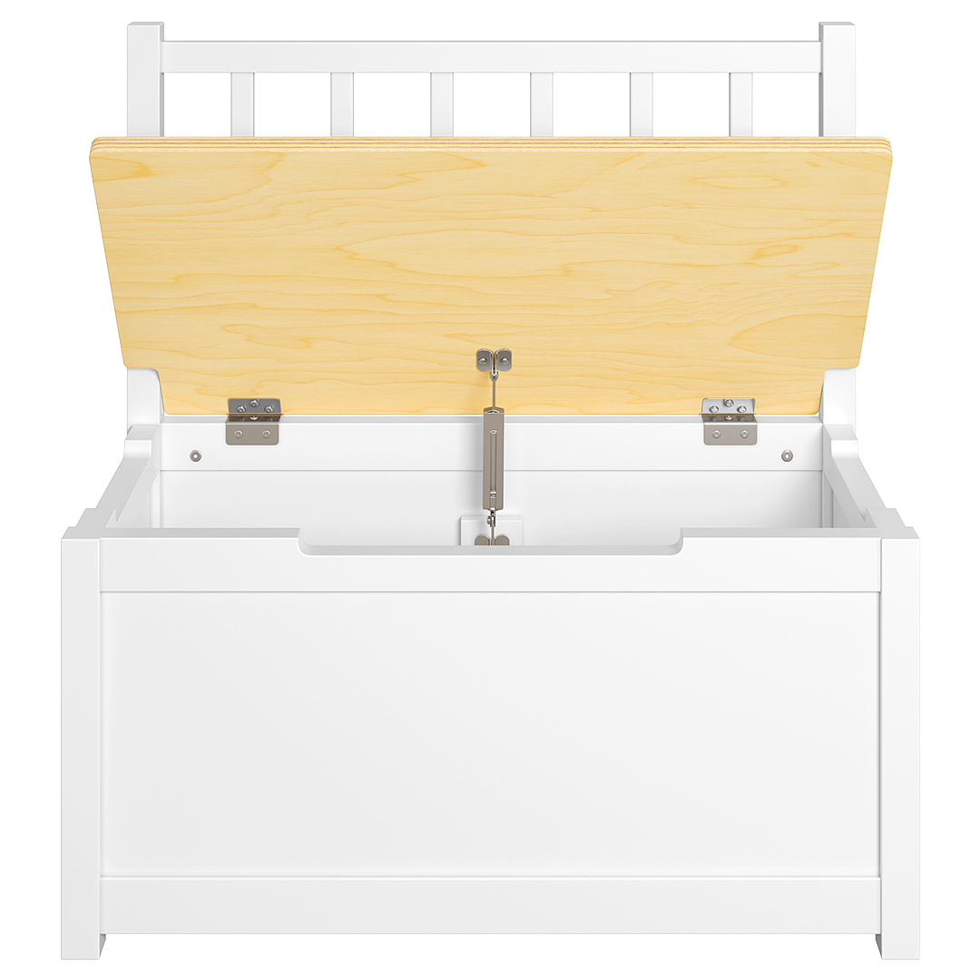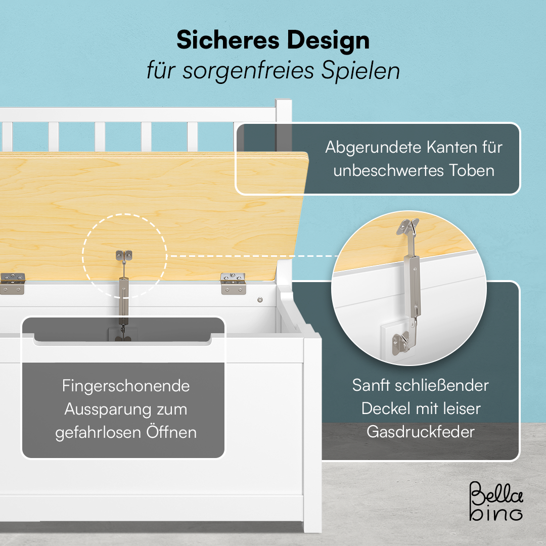 Die Kindersitzbank Sora von Bellabino vereint kindgerechtes Design mit Funktionalität und Stil – ideal für Kinderzimmer, Spielecke oder Flur. Abgerundete Kanten und ein stabiler Stand sorgen für Sicherheit im Alltag, selbst beim lebhaften Spielen. Unter der Sitzfläche verbirgt sich eine praktische Truhe, in der Spielzeug, Bücher oder Kuscheltiere ordentlich verstaut werden können. Eine hochwertige Gasdruckfeder ermöglicht ein sanftes Öffnen und Schließen des Deckels – ganz ohne eingeklemmte Finger. Gefertigt aus robustem Kiefernmassivholz und Sperrholz, ist die Bank besonders langlebig und bis zu 150 kg belastbar. Mit ihrer Sitzhöhe von 29 cm eignet sie sich perfekt für Kinder, bietet aber auch Erwachsenen Platz. Die einfache Montage gelingt dank verständlicher Anleitung im Handumdrehen – für mehr Zeit zum Spielen, Basteln und Entspannen.