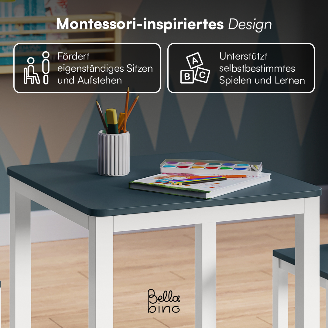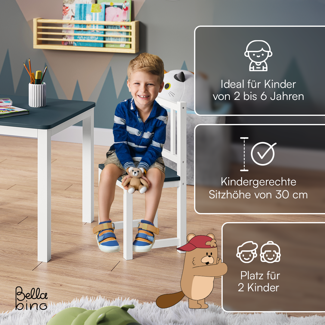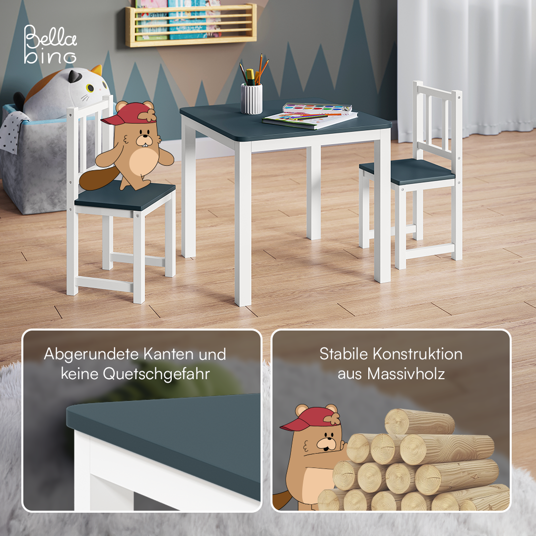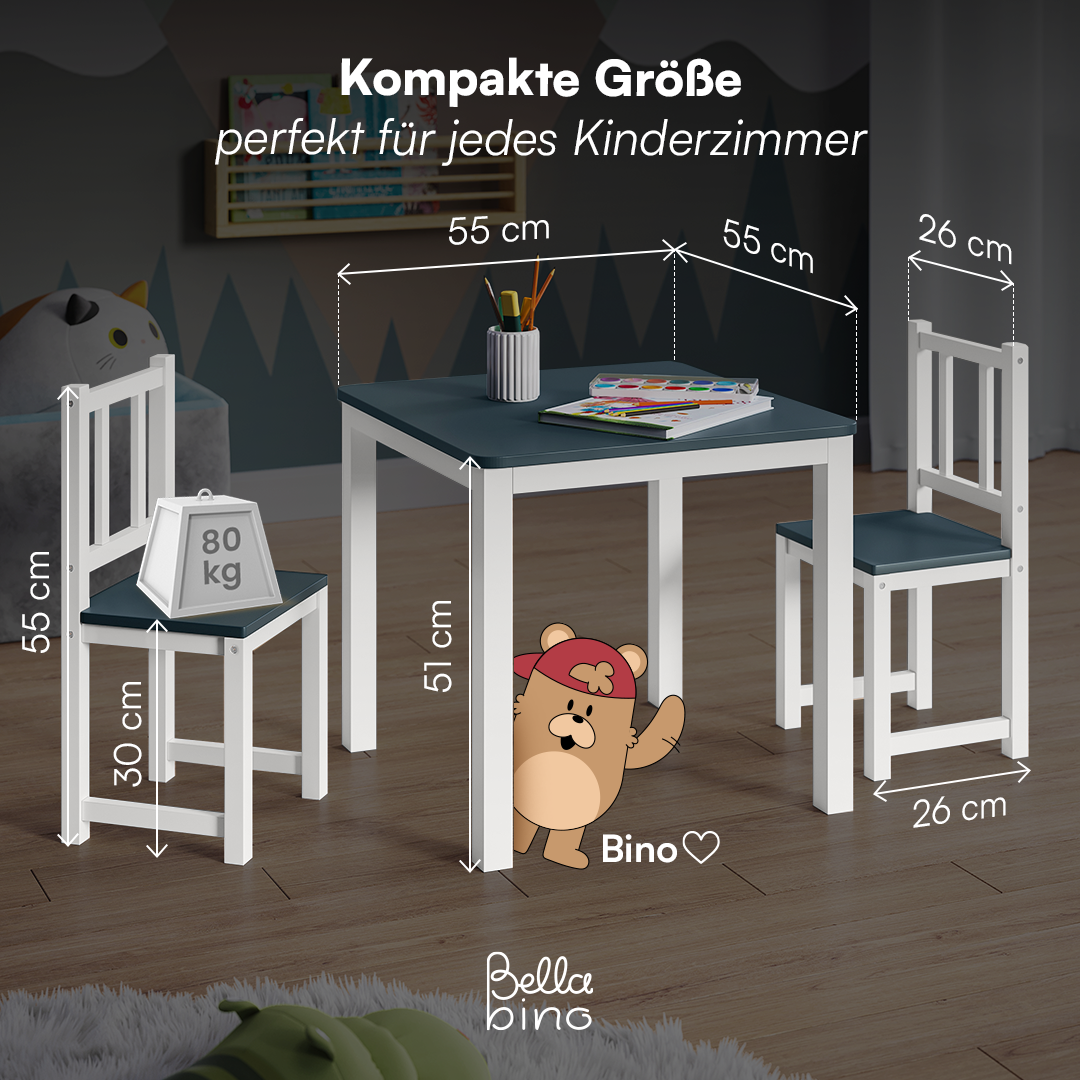 Die Sora Kindersitzgruppe von Bellabino kombiniert Langlebigkeit, Sicherheit und kindgerechtes Design. Gefertigt aus hochwertigem Kiefernmassivholz und Sperrholz, umfasst das Set einen stabilen Tisch und zwei abgestimmte Stühle mit abgerundeten Kanten für maximale Sicherheit. Die Möbel sind ideal für Kinder von 2 bis 6 Jahren und bieten mit ihren Maßen (Tisch: 55x55x51 cm, Stuhl: 26x26x55 cm, Sitzhöhe: 29 cm) perfekten Komfort. Jeder Stuhl ist bis 80 kg belastbar, sodass auch Erwachsene problemlos Platz nehmen können. Dank der beiliegenden Anleitung ist der Aufbau in 30–60 Minuten kinderleicht erledigt.