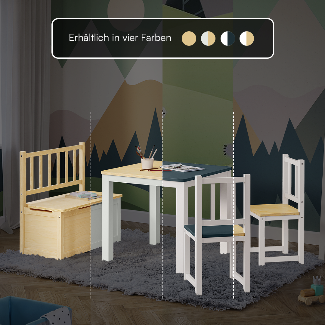 Gefertigt aus massivem Kiefernholz und Sperrholz ist das Set besonders robust. Die kindgerechte Sitzhöhe von 29 cm passt perfekt für Kinder zwischen 2 und 6 Jahren. Stühle tragen bis zu 80 kg, die Bank bis 150 kg – so können auch Erwachsene mit Platz nehmen.