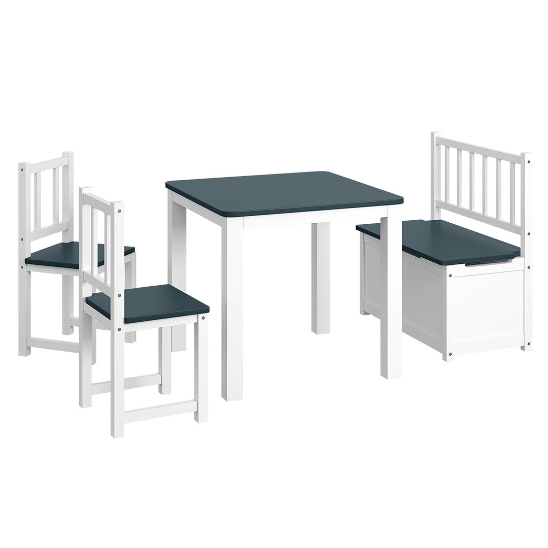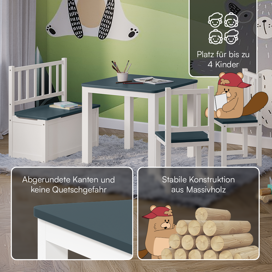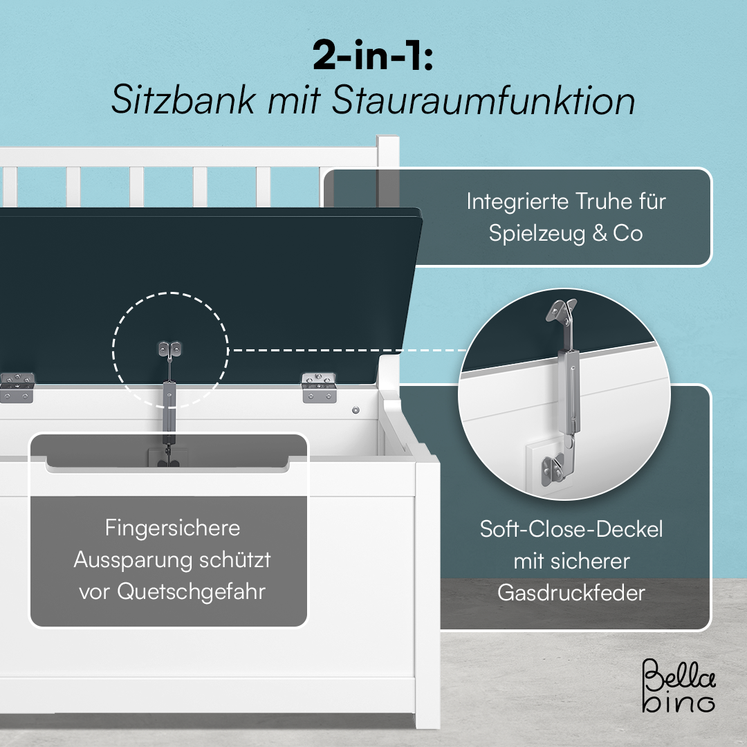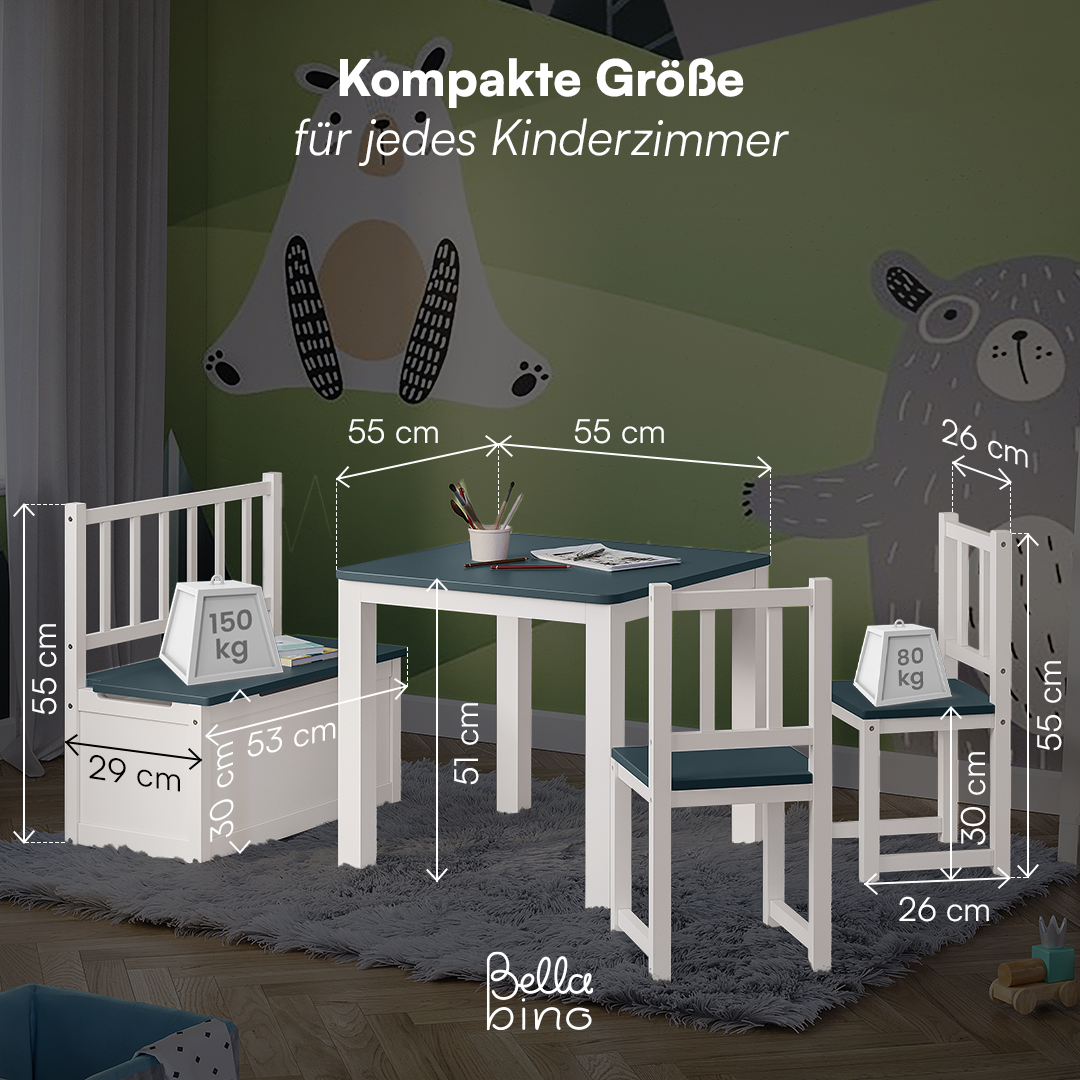 Alle Möbel sind mit abgerundeten Kanten ausgestattet und besonders standfest – für sicheres Spielen, Malen und Essen. Die Bank bietet unter der Sitzfläche eine praktische Truhe für Bücher, Spielzeug oder Kuscheltiere. Eine Gasdruckfeder sorgt für sanftes Öffnen und schützt kleine Finger.