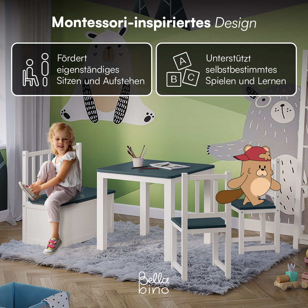 Das Kindermöbel-Set „Sora“ von Bellabino vereint kindgerechtes Design mit Alltagstauglichkeit. Es besteht aus einem stabilen Tisch, zwei passenden Stühlen und einer Sitzbank mit integriertem Stauraum – ideal für Kinderzimmer, Spielecke oder Flur. Der natürliche Holzlook macht es schnell zum Lieblingsplatz der Kleinen.