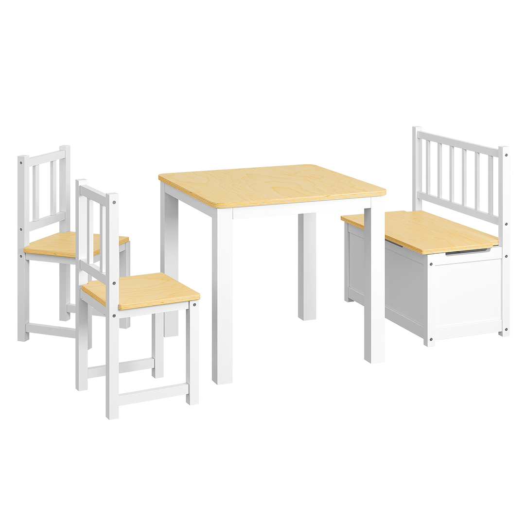 Gefertigt aus massivem Kiefernholz und Sperrholz ist das Set besonders robust. Die kindgerechte Sitzhöhe von 29 cm passt perfekt für Kinder zwischen 2 und 6 Jahren. Stühle tragen bis zu 80 kg, die Bank bis 150 kg – so können auch Erwachsene mit Platz nehmen.