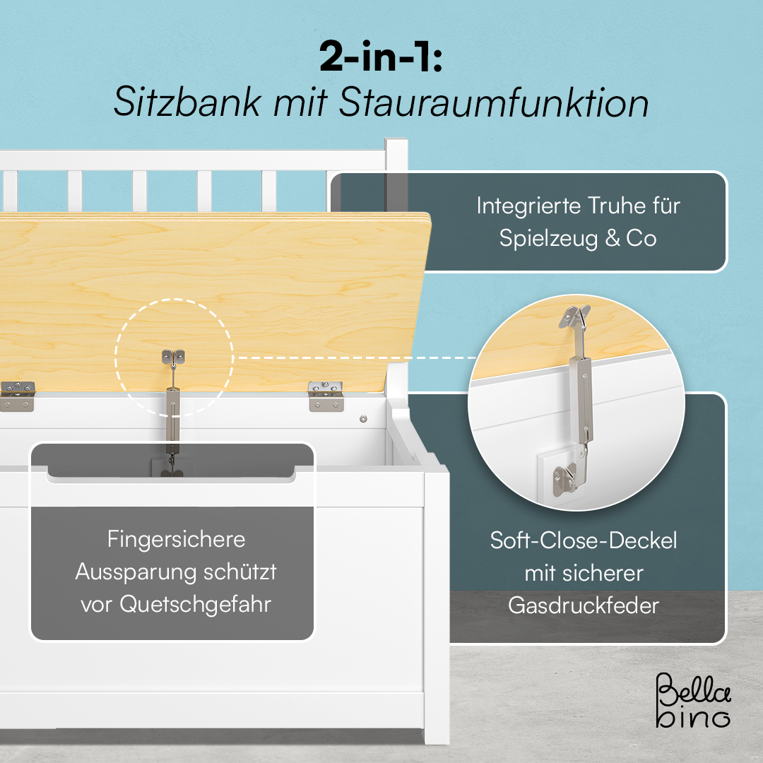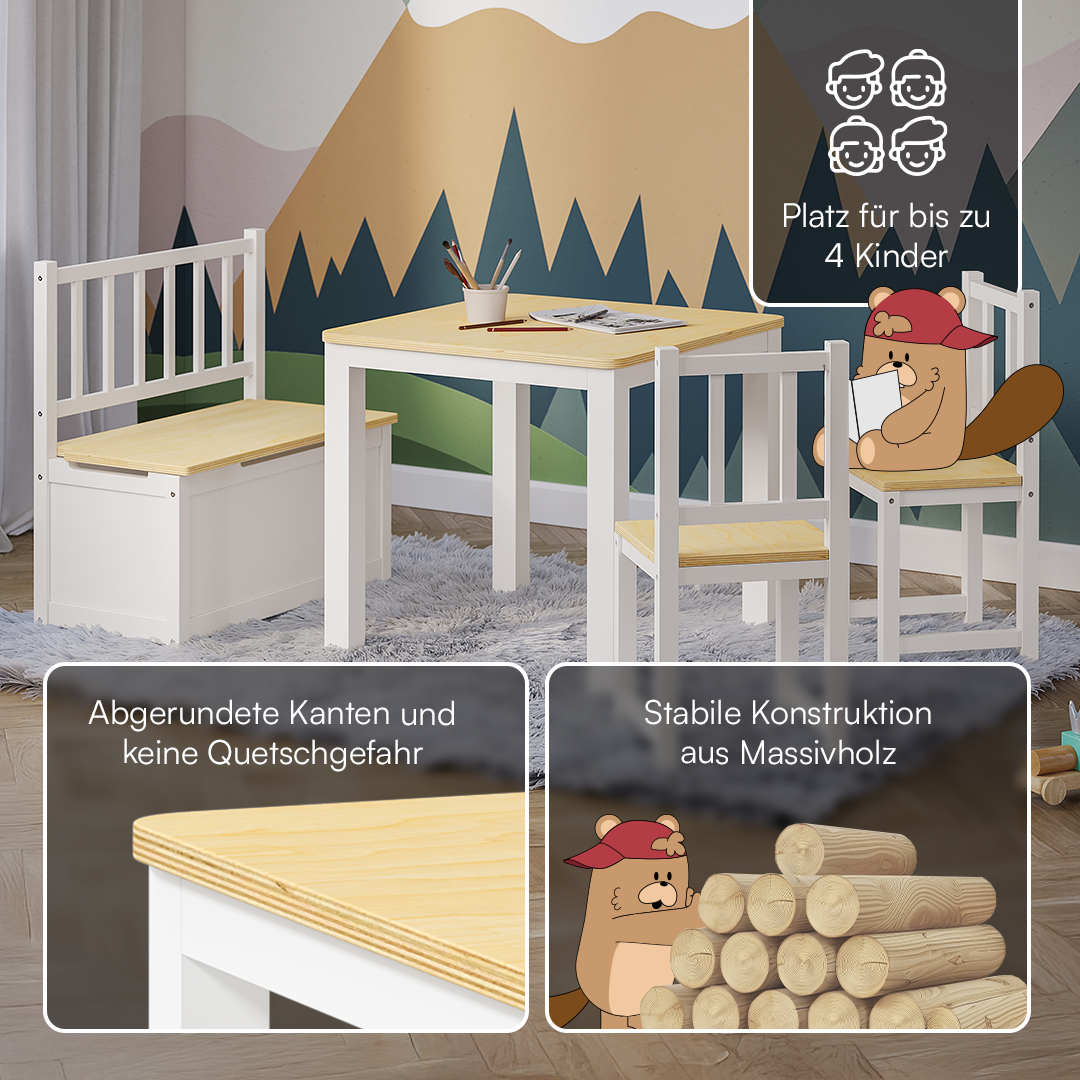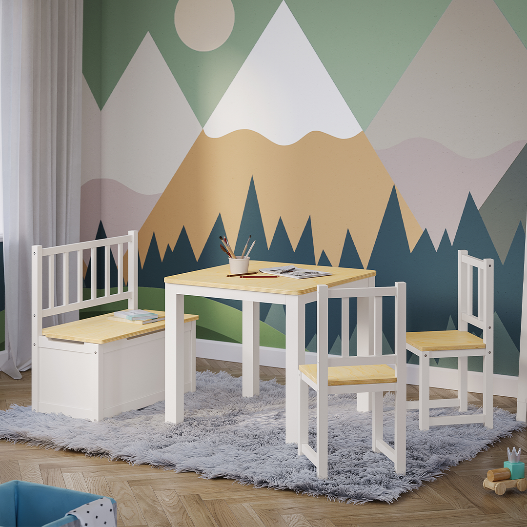 Alle Möbel sind mit abgerundeten Kanten ausgestattet und besonders standfest – für sicheres Spielen, Malen und Essen. Die Bank bietet unter der Sitzfläche eine praktische Truhe für Bücher, Spielzeug oder Kuscheltiere. Eine Gasdruckfeder sorgt für sanftes Öffnen und schützt kleine Finger.