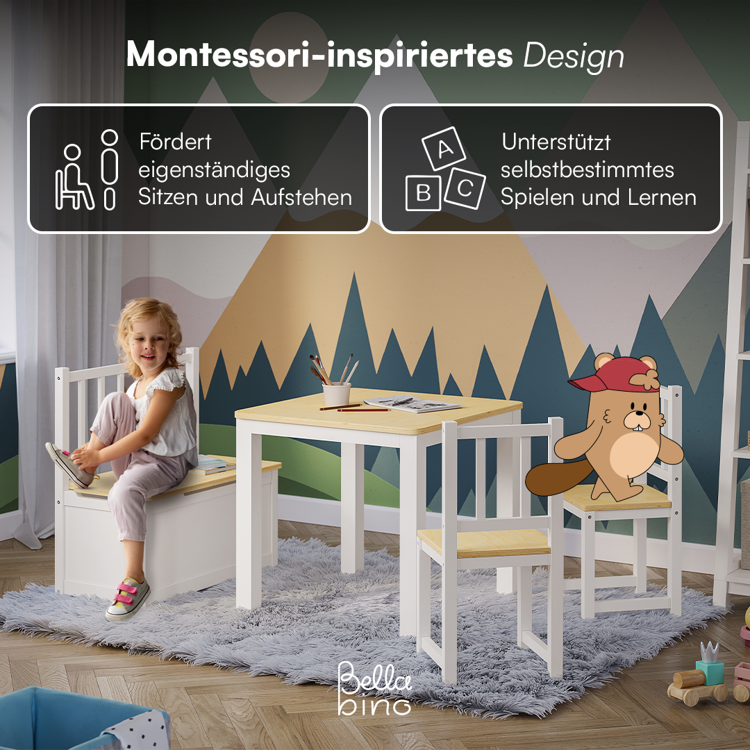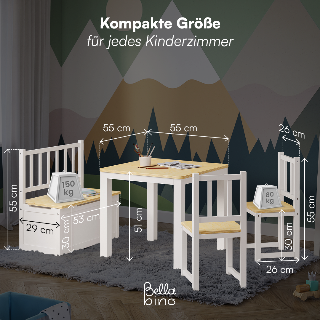 Das Kindermöbel-Set „Sora“ von Bellabino vereint kindgerechtes Design mit Alltagstauglichkeit. Es besteht aus einem stabilen Tisch, zwei passenden Stühlen und einer Sitzbank mit integriertem Stauraum – ideal für Kinderzimmer, Spielecke oder Flur. Der natürliche Holzlook macht es schnell zum Lieblingsplatz der Kleinen.