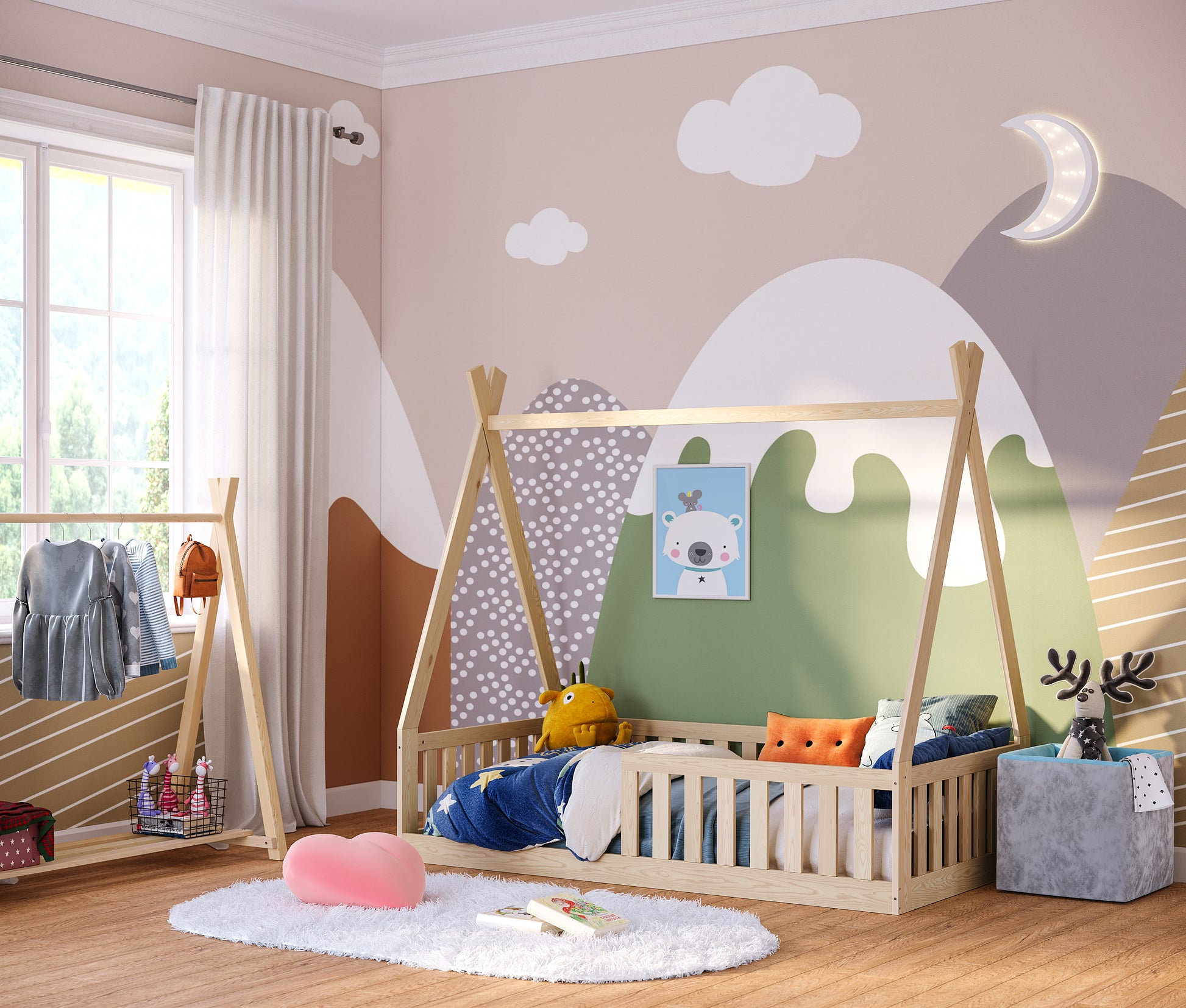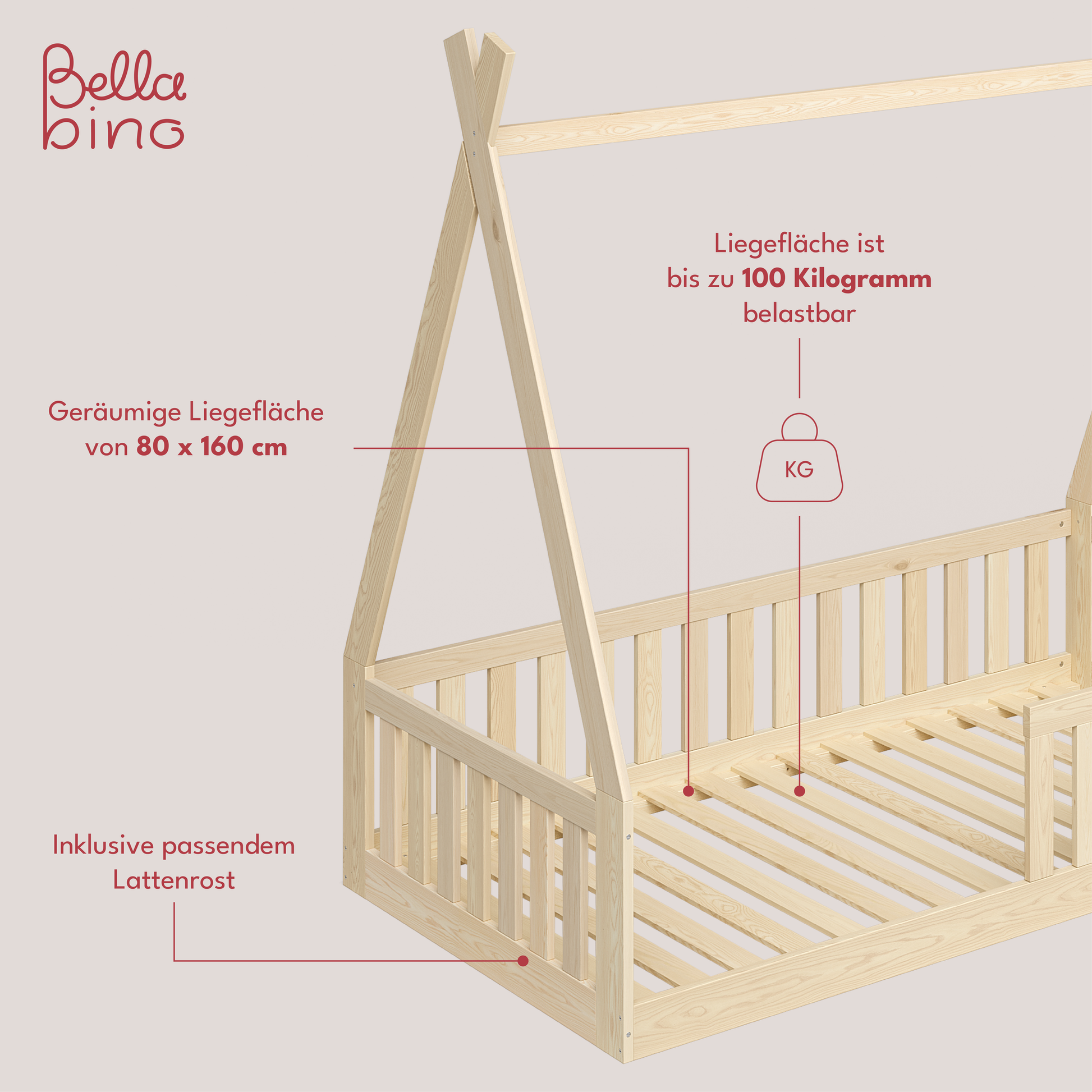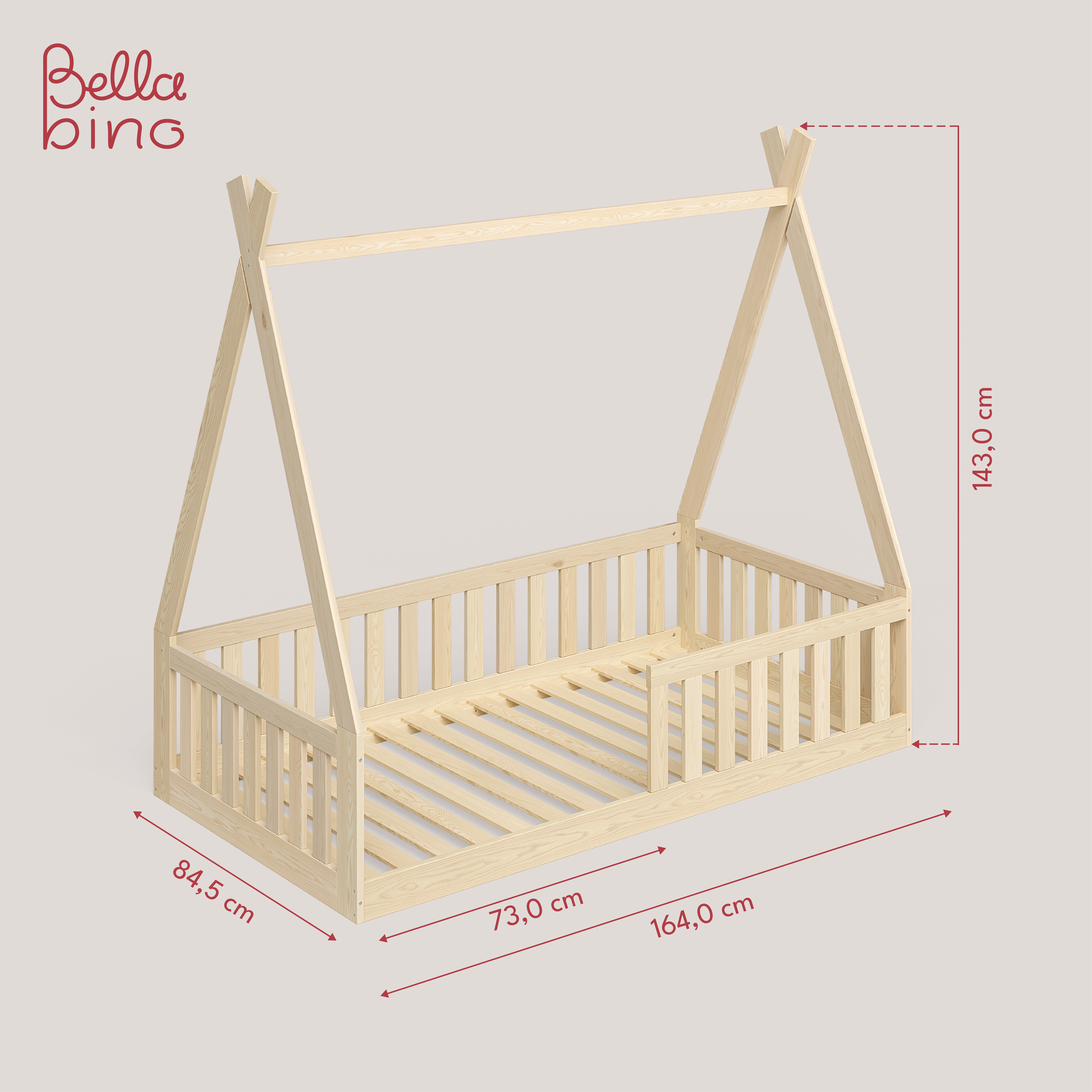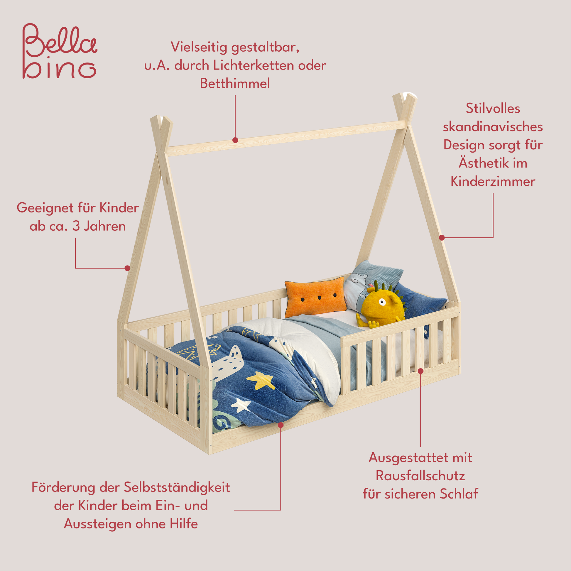 Das Tipi Bett ‚Tajo‘ von Bellabino bietet eine funktionale und optisch ansprechende Schlaflösung für das Kinderzimmer, die die spielerische Fantasie der Kleinen fördert und und für erholsame Nächte sorgt.