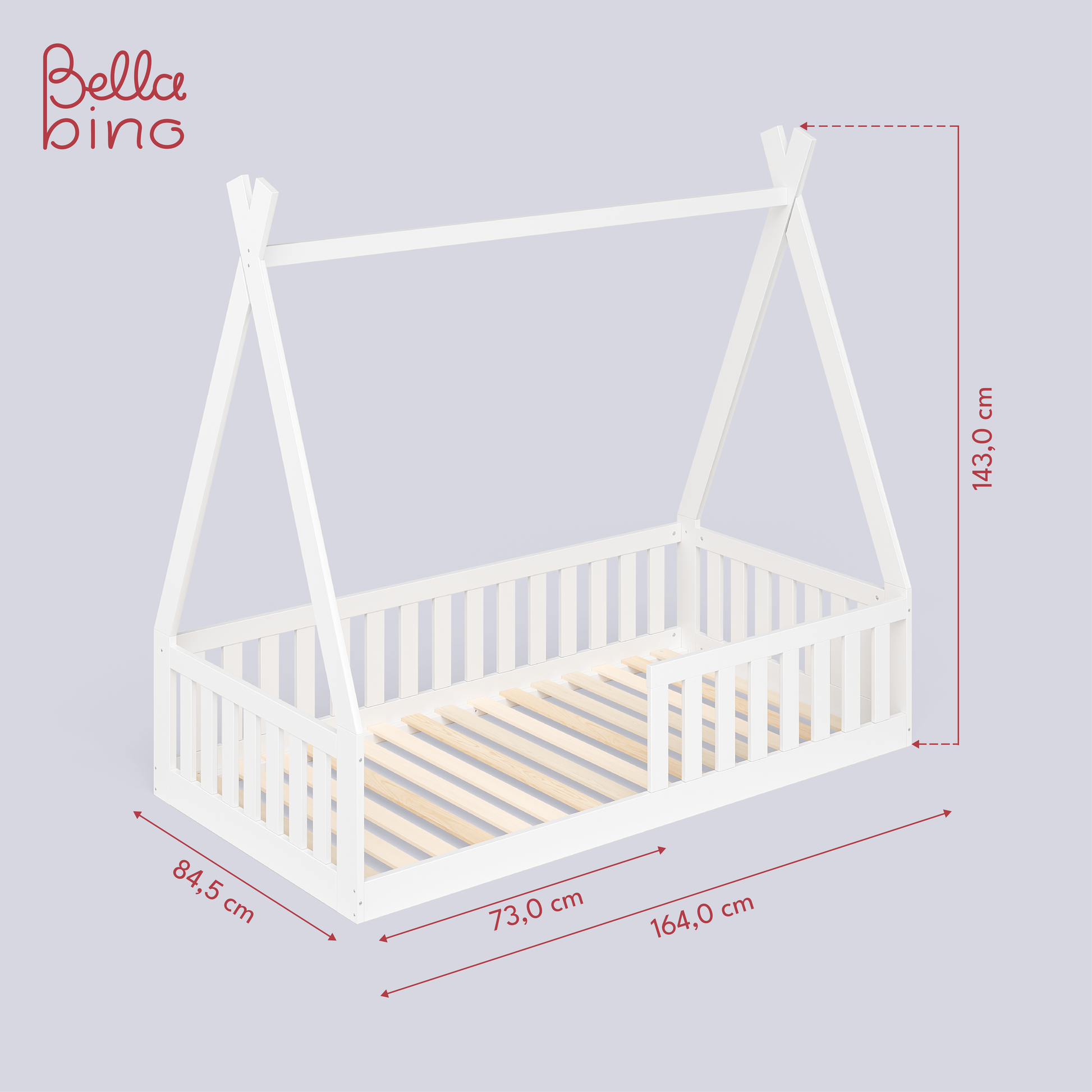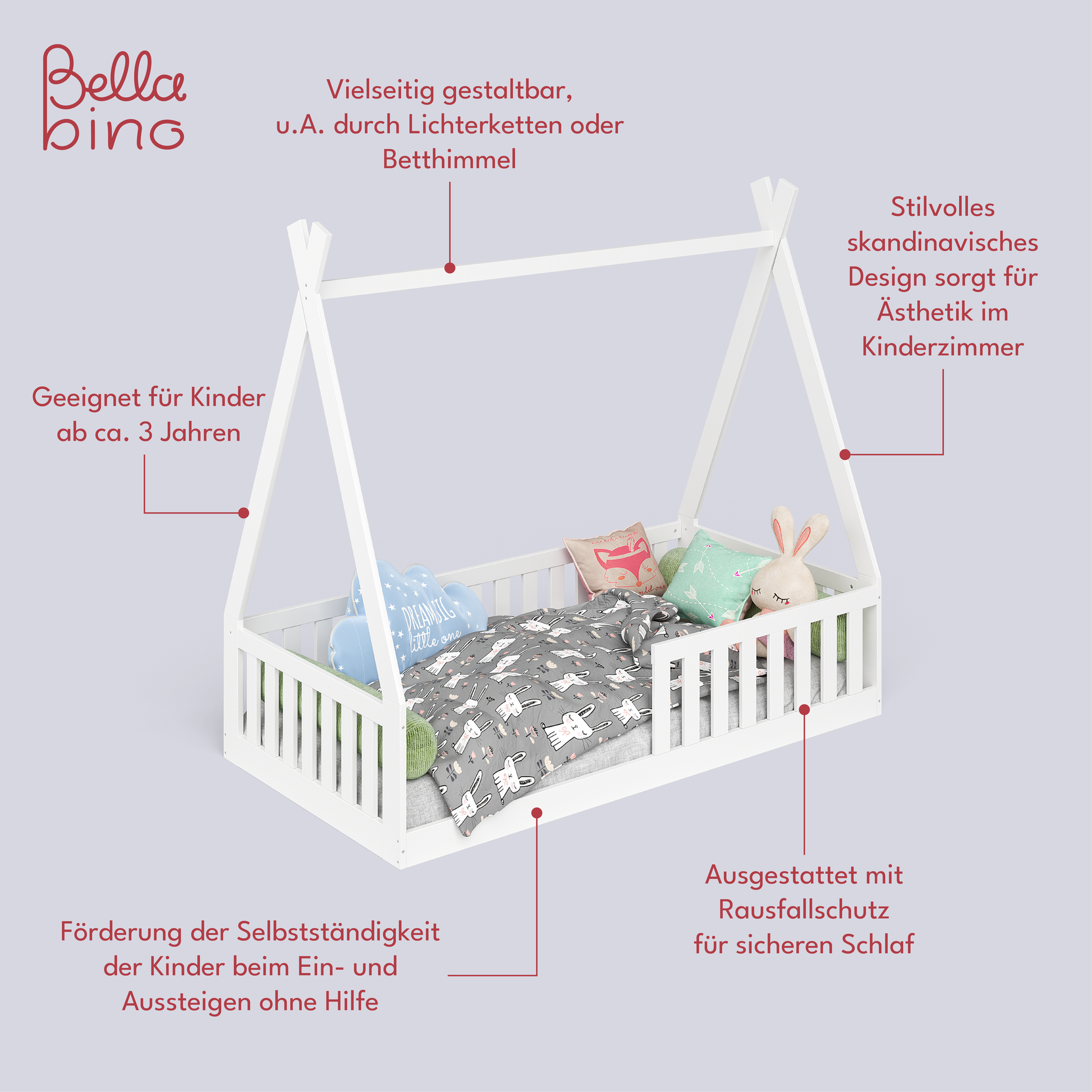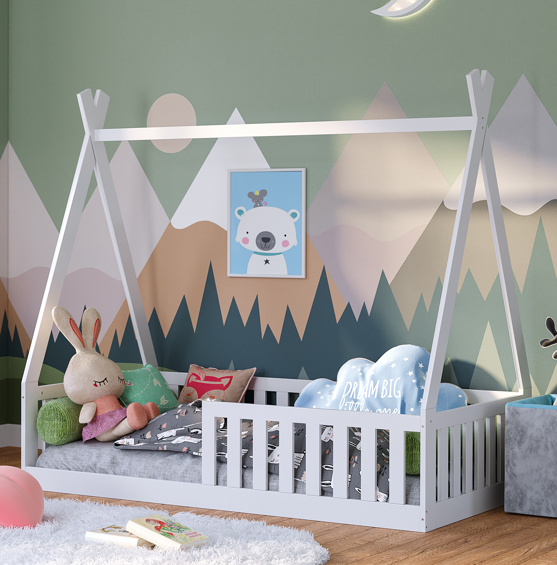 Das Tipi Bett 'Tajo' von Bellabino ist eine funktionale und optisch ansprechende Schlaflösung für das Kinderzimmer, die die spielerische Fantasie der Kleinen fördert und und für erholsame Nächte sorgt.