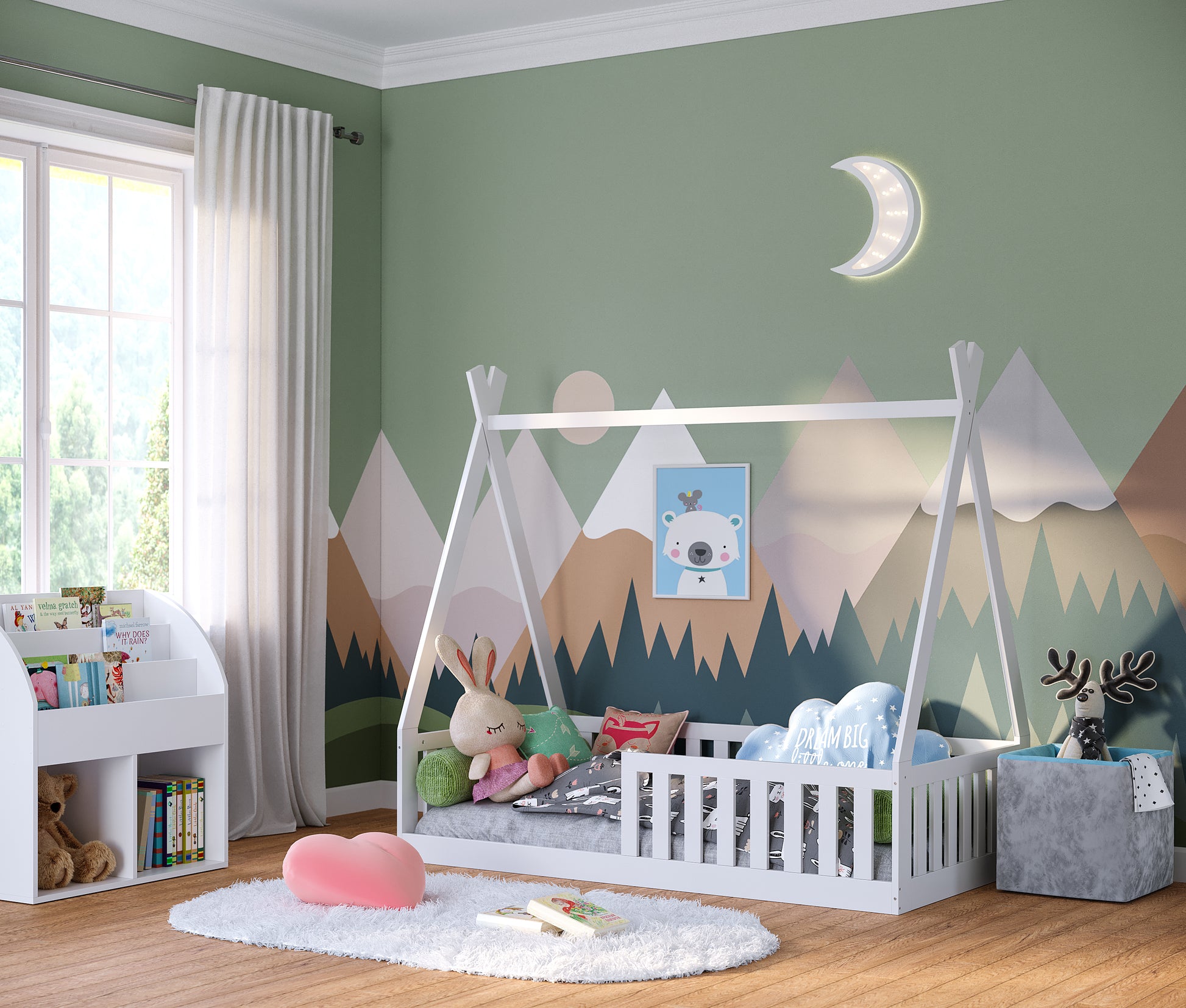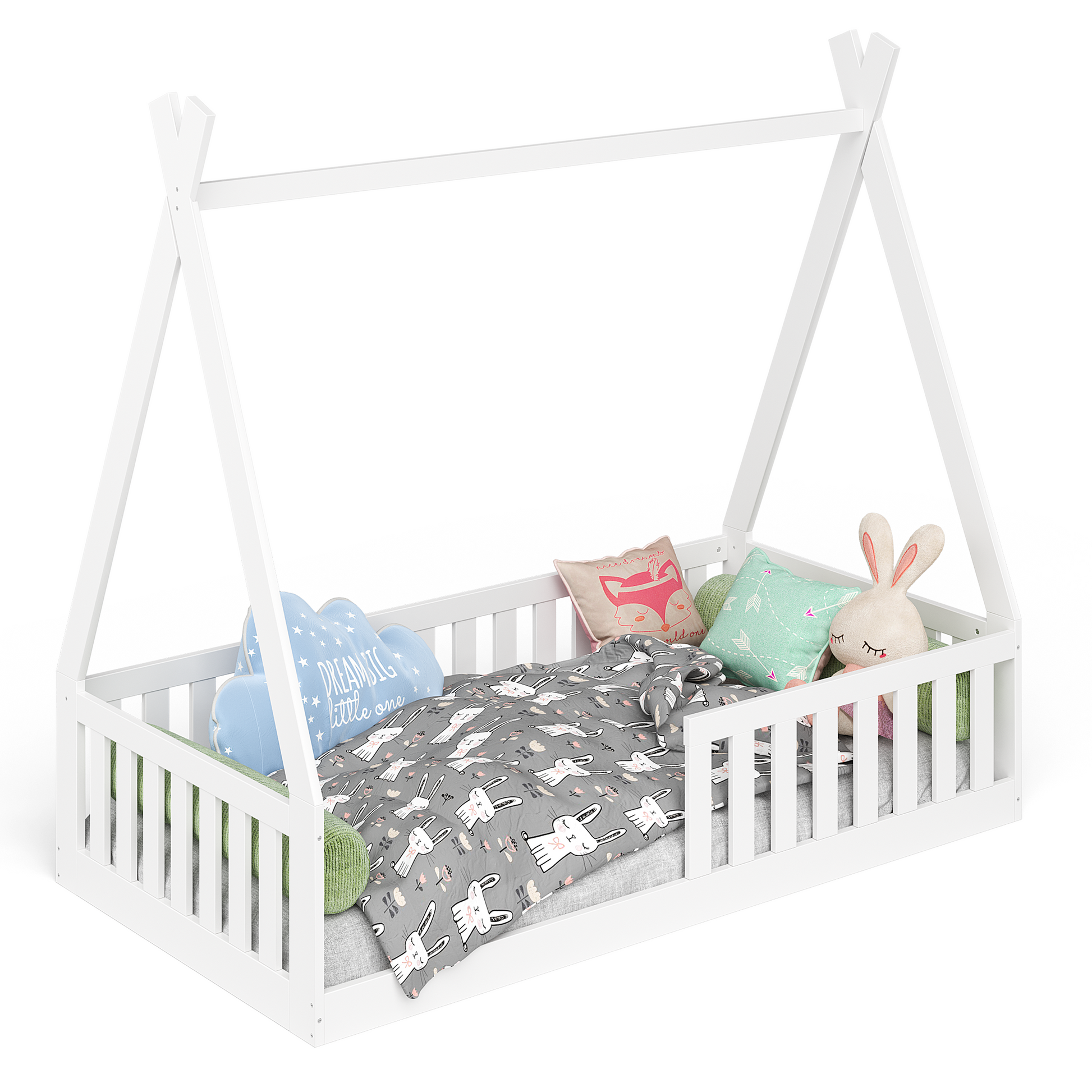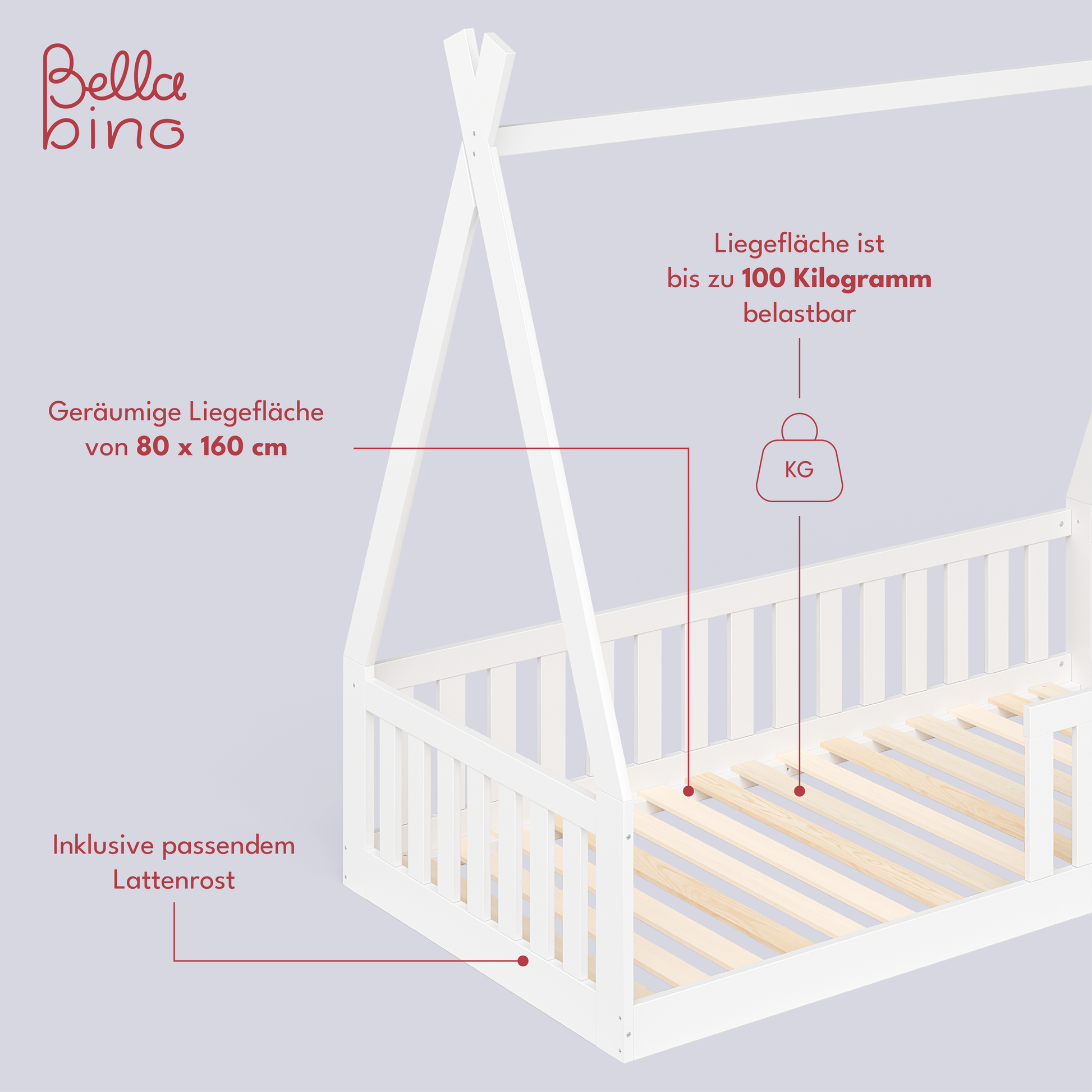 Das Tipi Bett 'Tajo' von Bellabino ist eine funktionale und optisch ansprechende Schlaflösung für das Kinderzimmer, die die spielerische Fantasie der Kleinen fördert und und für erholsame Nächte sorgt.