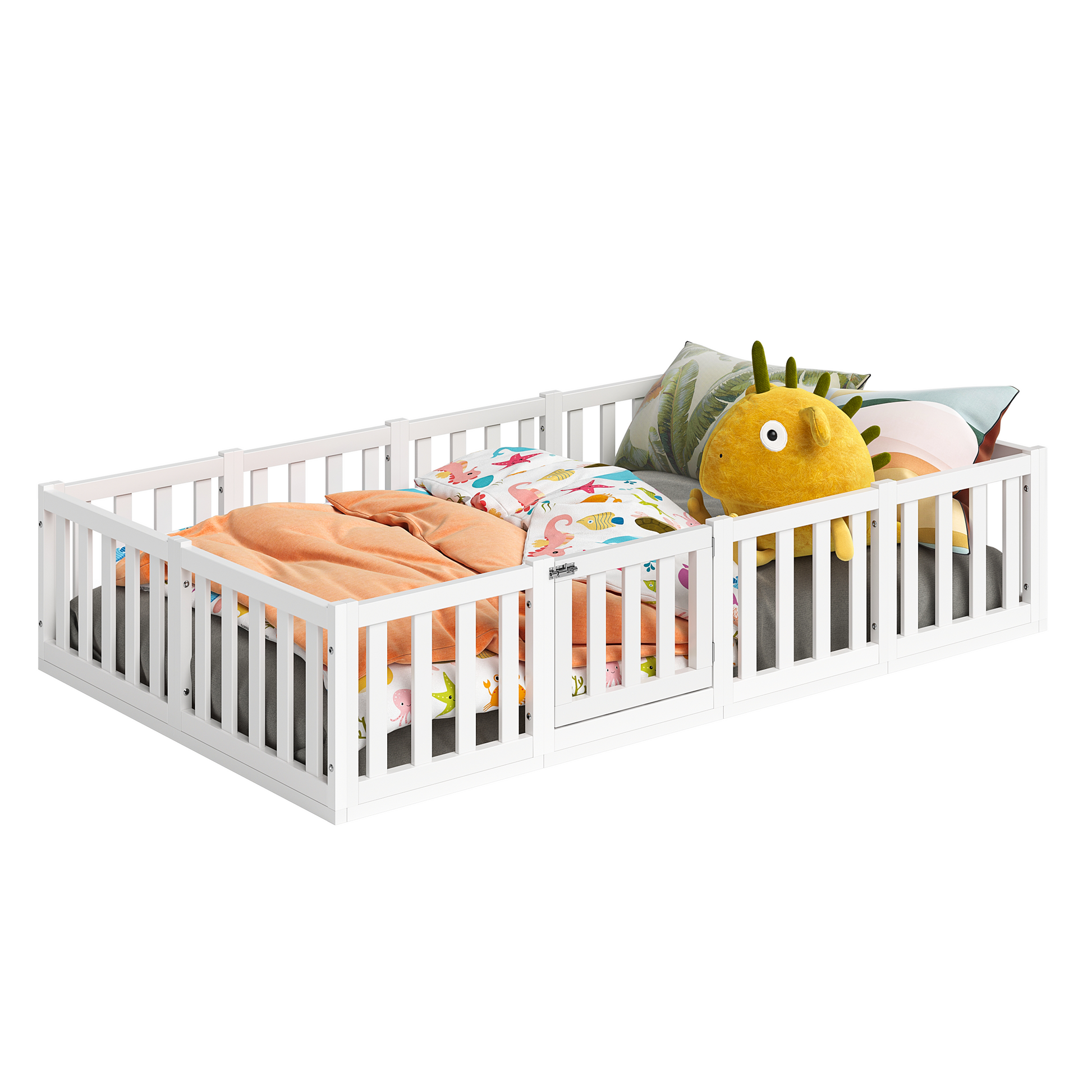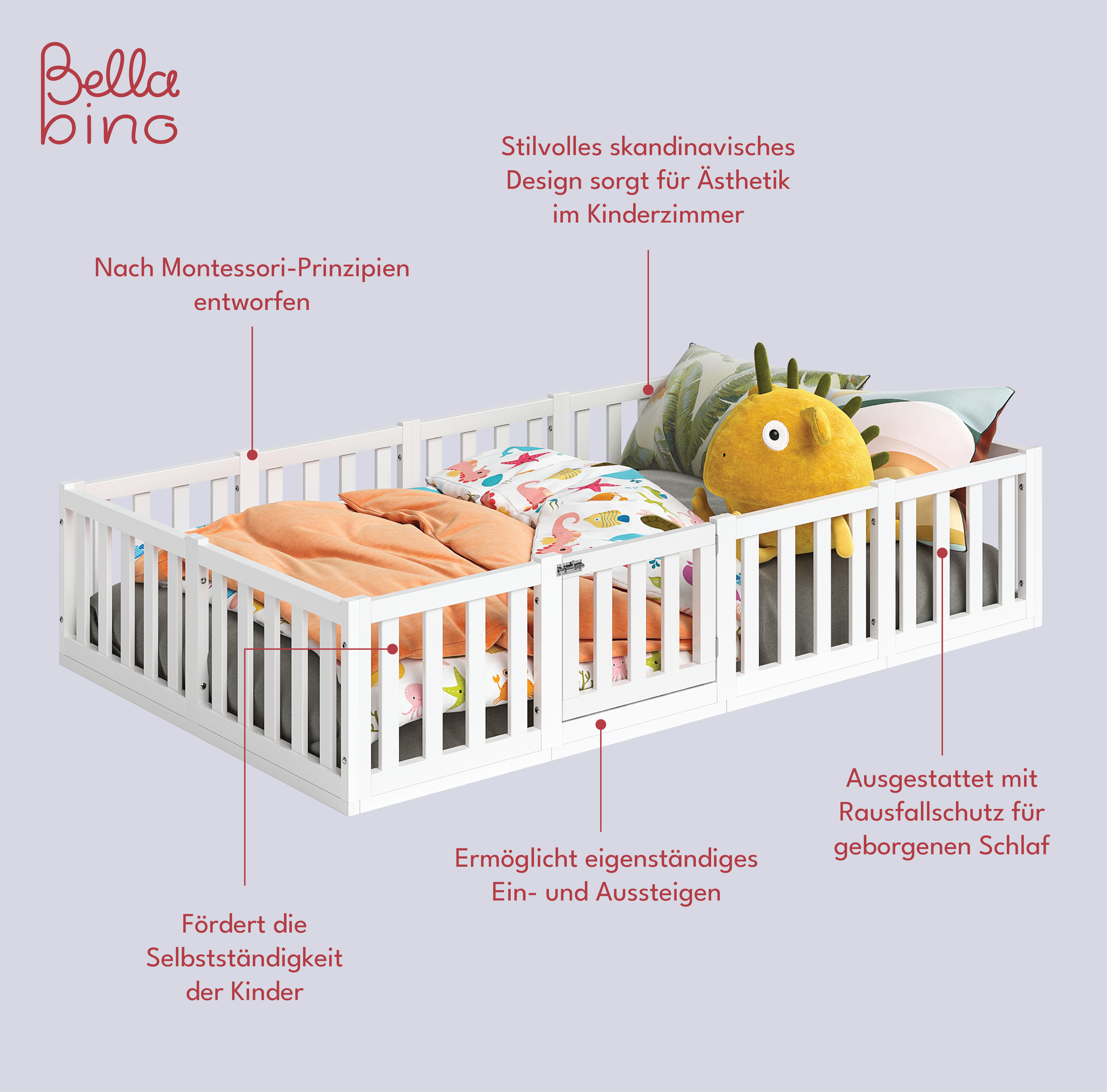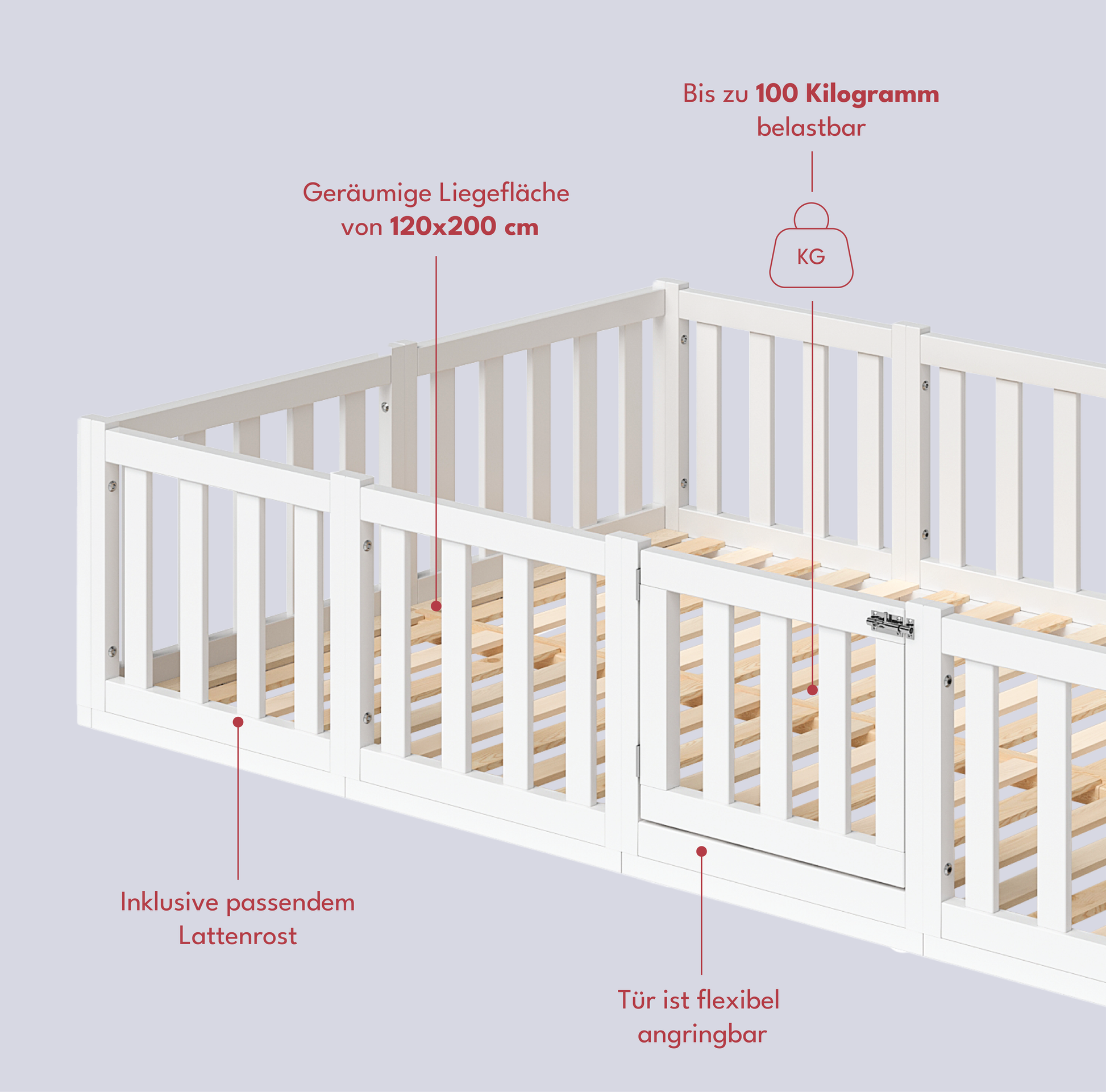 - Lieferumfang: Bodenbett inkl. Rausfallschutz mit Tür und Lattenrost