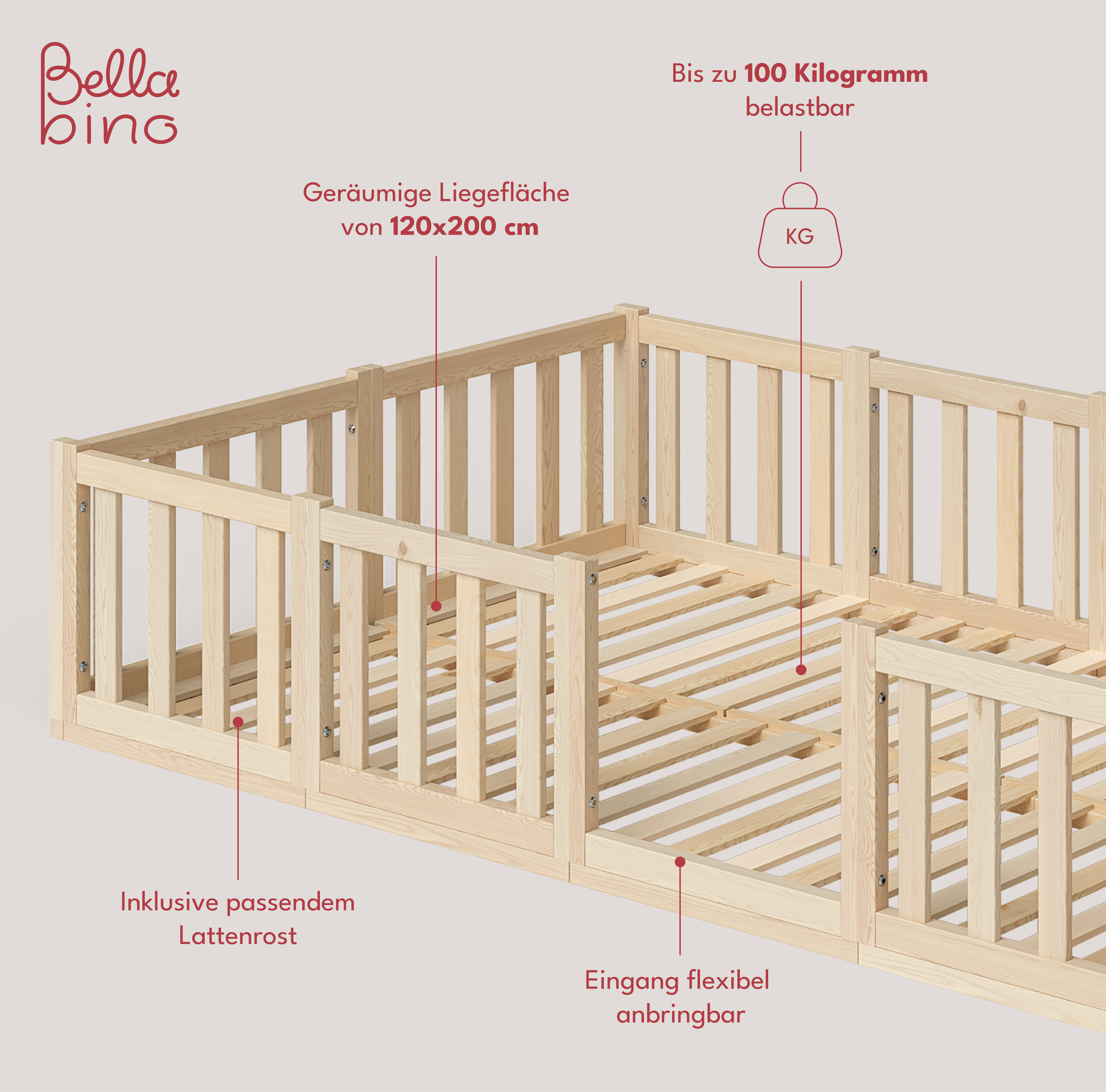 Um den Kleinen einen erholsamen Schlaf zu schenken, verfügt das Bett über eine geräumige Liegefläche von 120 x 200 cm, die bereits mit einem passenden Lattenrost ausgestattet ist. Das Bett ist zudem mit einem Rausfallschutz ausgestattet, der für die nötige Sicherheit während des Schlafes sorgt. Eine kleine Öffnung an der Längsseite erleichtert zudem den Zugang zur Liegefläche und garantiert ein einfaches Ein- und Aussteigen. Weiterhin ist das Bodenbett 'Tapi' bis 120 kg belastbar.