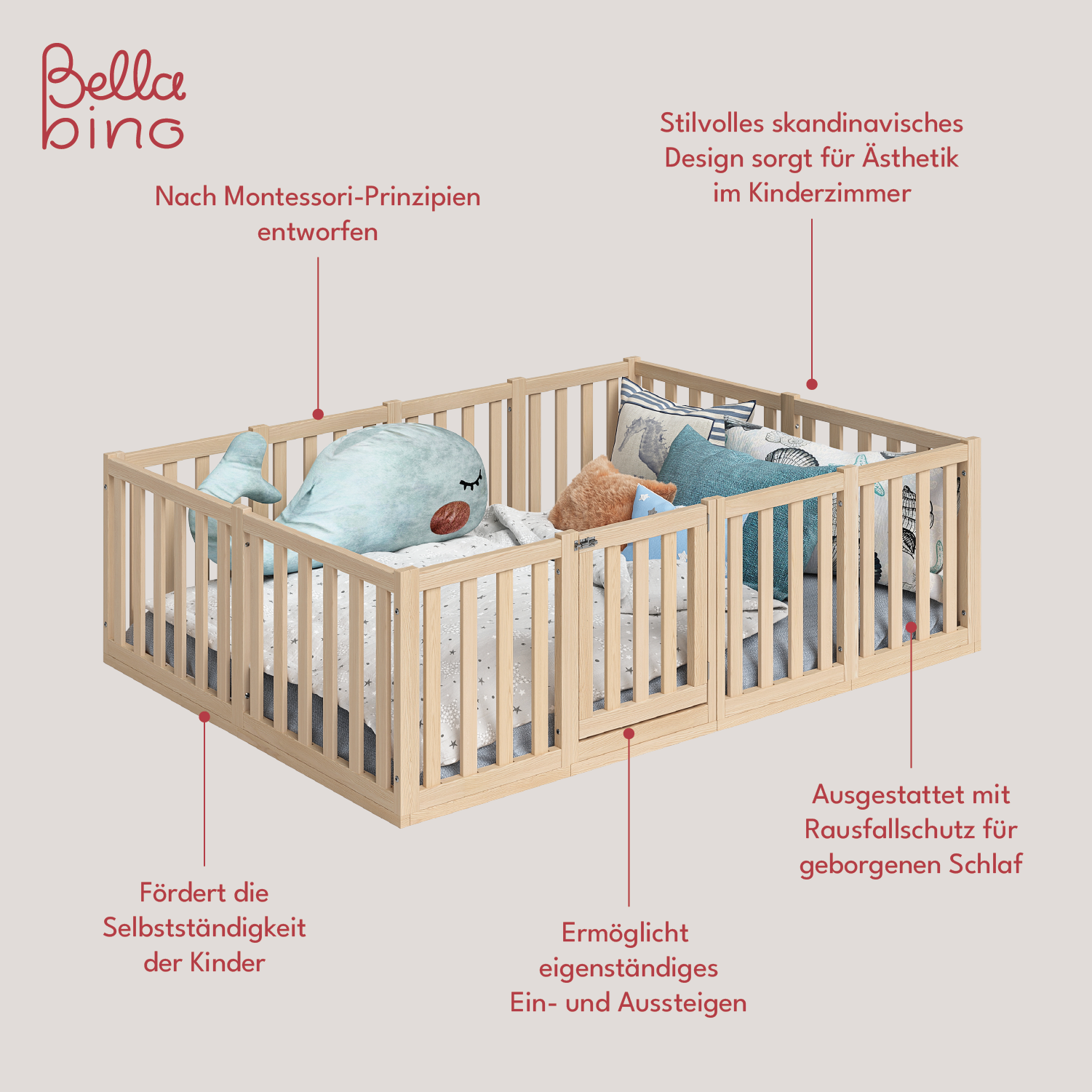 Das Bodenbett 'Tapi' von Bellabino bietet eine behagliche und funktionale Schlaflösung für Kinder, die sich frei und eigenständig in ihrem Zimmer bewegen möchten. 'Tapi' wird direkt auf dem Boden platziert, sodass das Bett eine niedrige Höhe aufweist. Dadurch kann das Kind die Liegefläche eigenständig nutzen und braucht beim Ein- und Aussteigen nicht mehr die Hilfe von Mama und Papa.