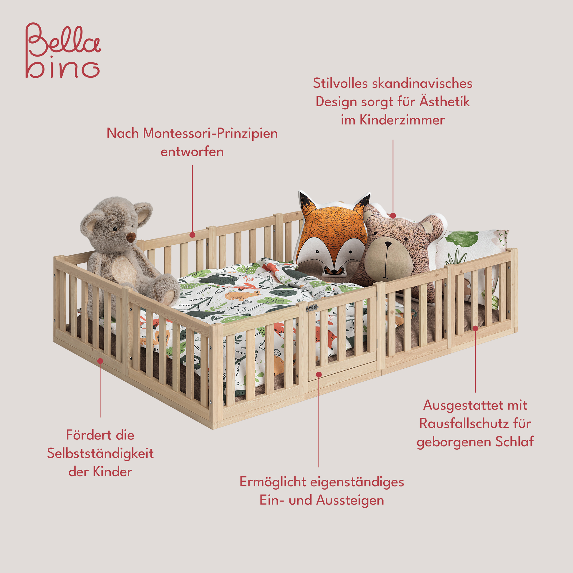 Das Bodenbett von Bellabino zeichnet sich zudem durch eine hohe Stabilität und Robustheit aus. Dank der massiven Holzmaterialien (Kiefer) kann 'Tapi' bis 120 kg belastet werden, sodass sich Mama oder Papa zum Lesen einer Gute-Nacht-Geschichte mit ins Bett legen können.