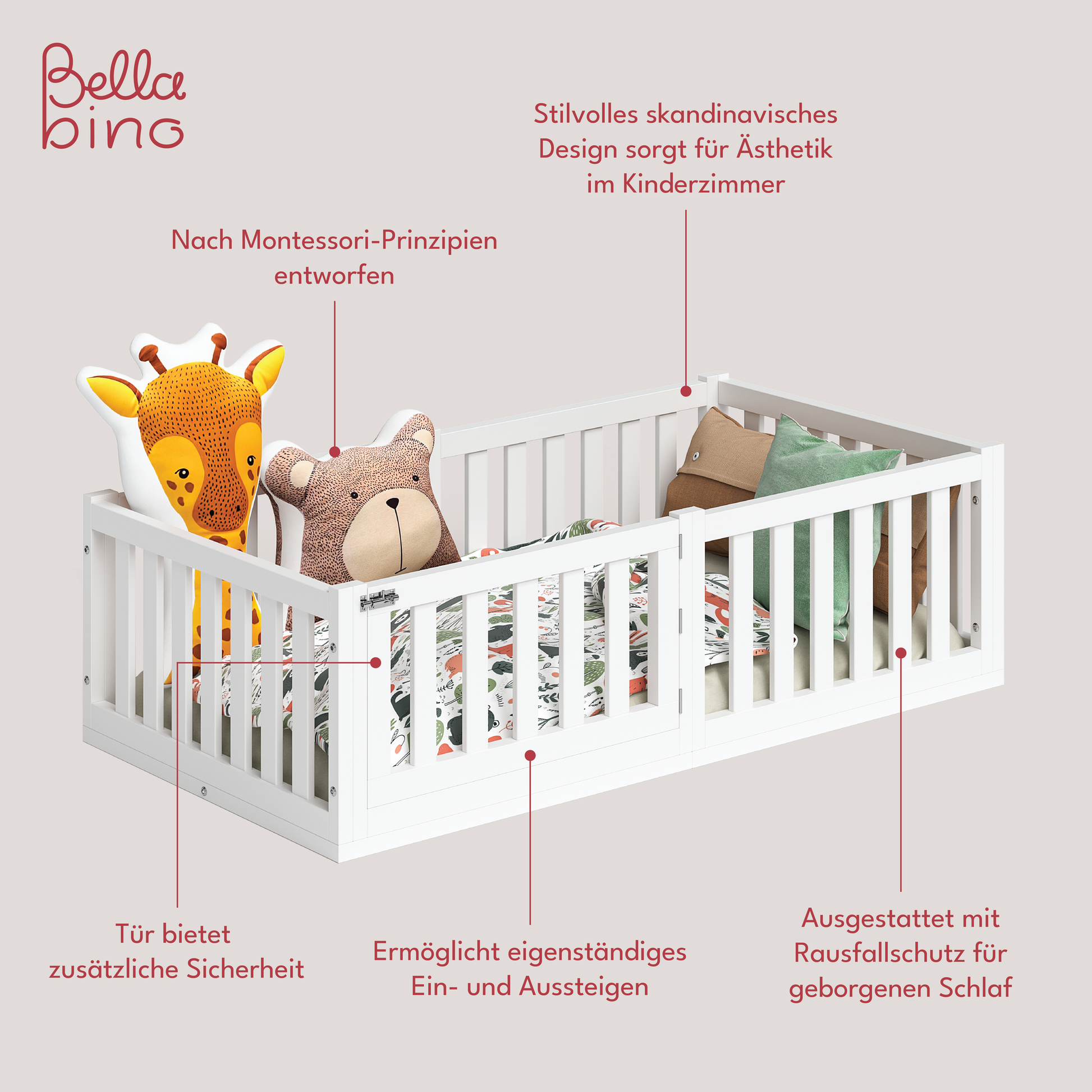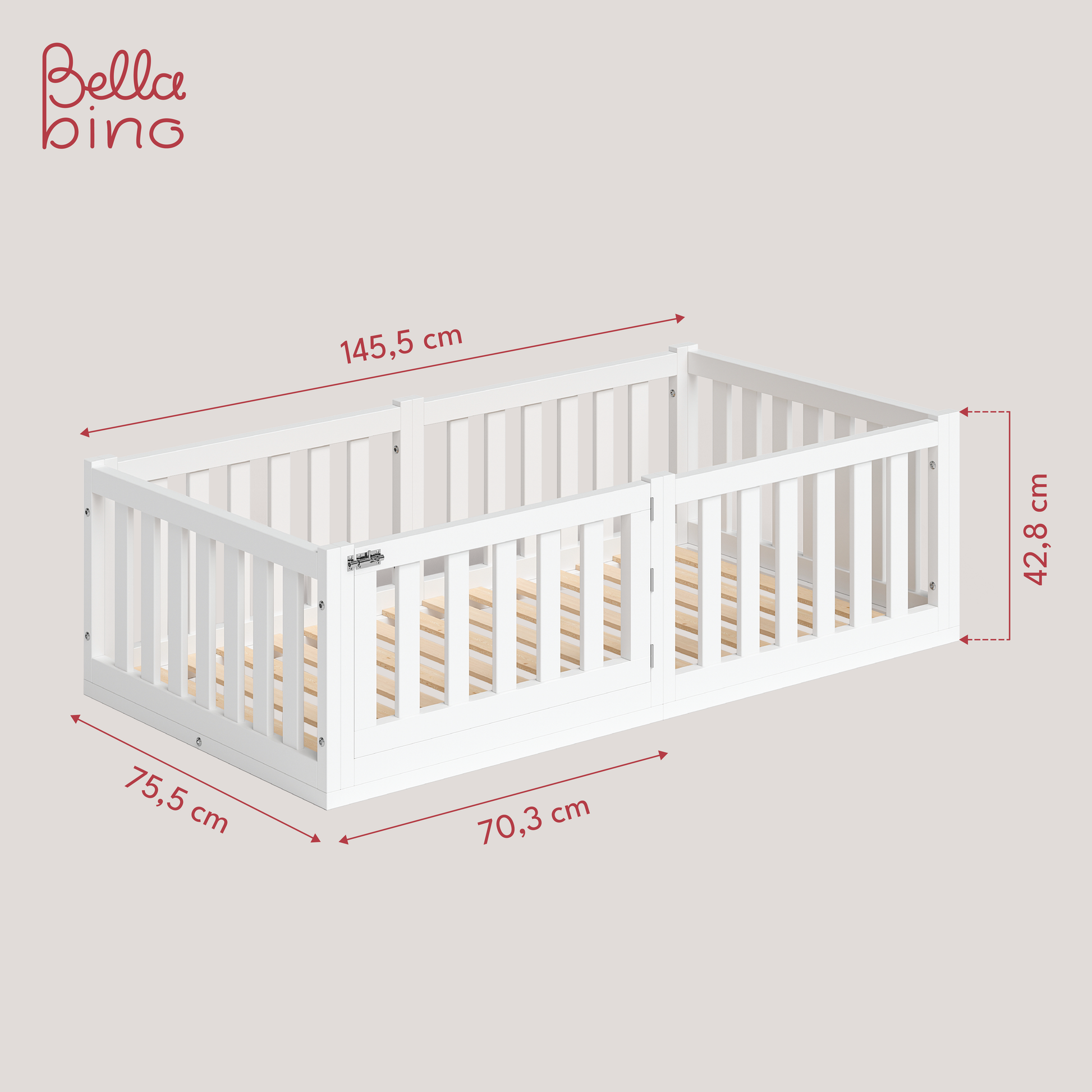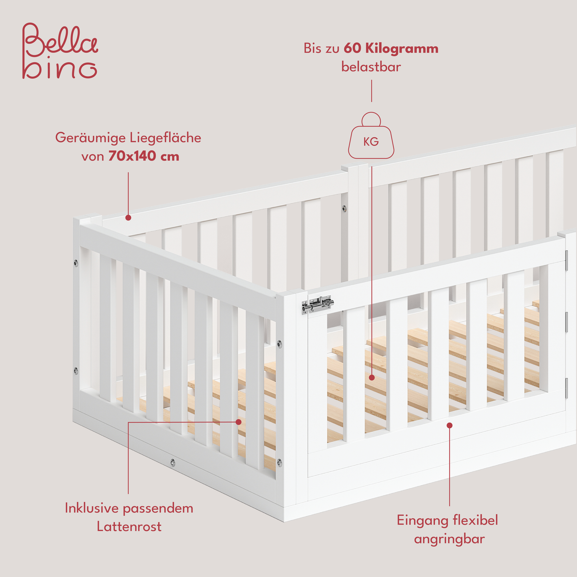 Das Kinderbett von Bellabino verfügt über eine geräumige Liegefläche von 70x140 cm cm, ein dazu passender Lattenrost ist in der Lieferung enthalten. Die Liegefläche ist mit einem Rausfallschutz umgeben, der die nötige Sicherheit beim Schlafen garantiert. Der Rausfallschutz ist zudem mit einer kleinen Tür an der Längsseite ausgestattet, welche ein sicheres Ein- und Aussteigen garantiert.