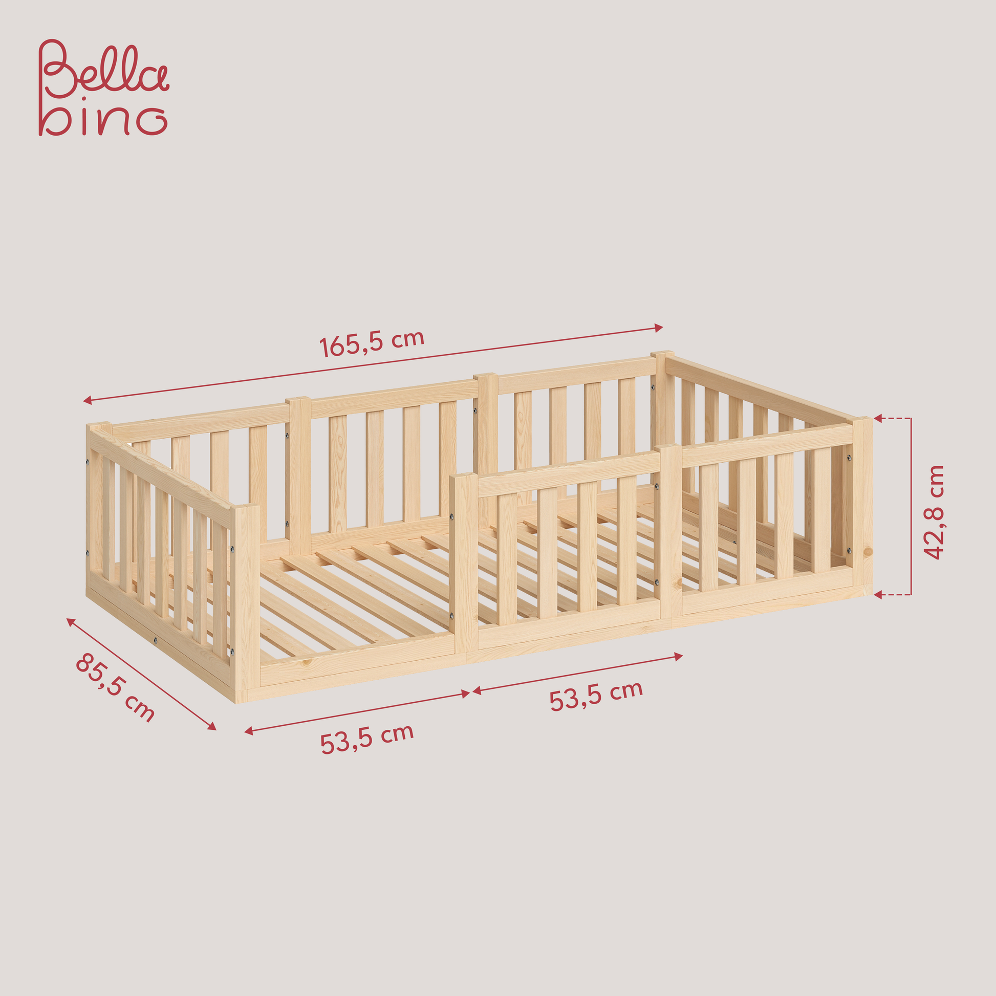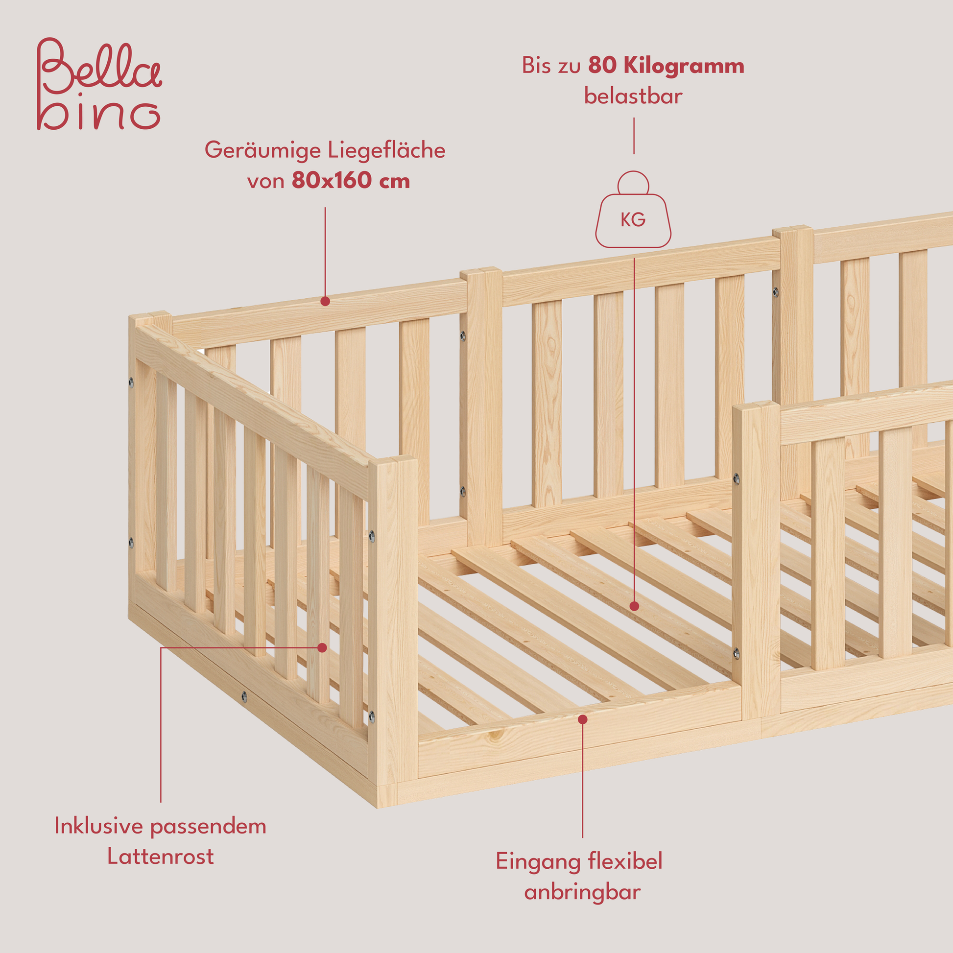 Das Kinderbett von Bellabino verfügt über eine geräumige Liegefläche von 80x160 cm cm, ein dazu passender Lattenrost ist in der Lieferung enthalten. Die Liegefläche ist mit einem extra hohem Rausfallschutz umgeben, der die nötige Sicherheit beim Schlafen garantiert. Der Rausfallschutz ist zudem mit einer kleinen Öffnung an der Längsseite ausgestattet, welche ein sicheres Ein- und Aussteigen garantiert.