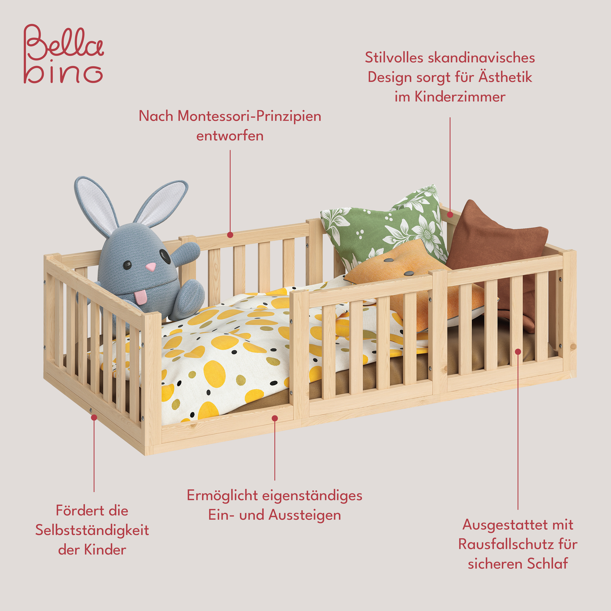 Das Bodenbett 'Tapi' von Bellabino bietet eine gemütliche und funktionale Schlaflösung für Kinder, die sich frei und eigenständig in ihrem Zimmer bewegen möchten. 'Tapi' wird direkt auf dem Boden platziert, sodass das Bett eine niedrige Höhe aufweist. Dadurch kann das Kind die Liegefläche eigenständig nutzen und braucht beim Ein- und Aussteigen nicht mehr die Hilfe von Mama und Papa.