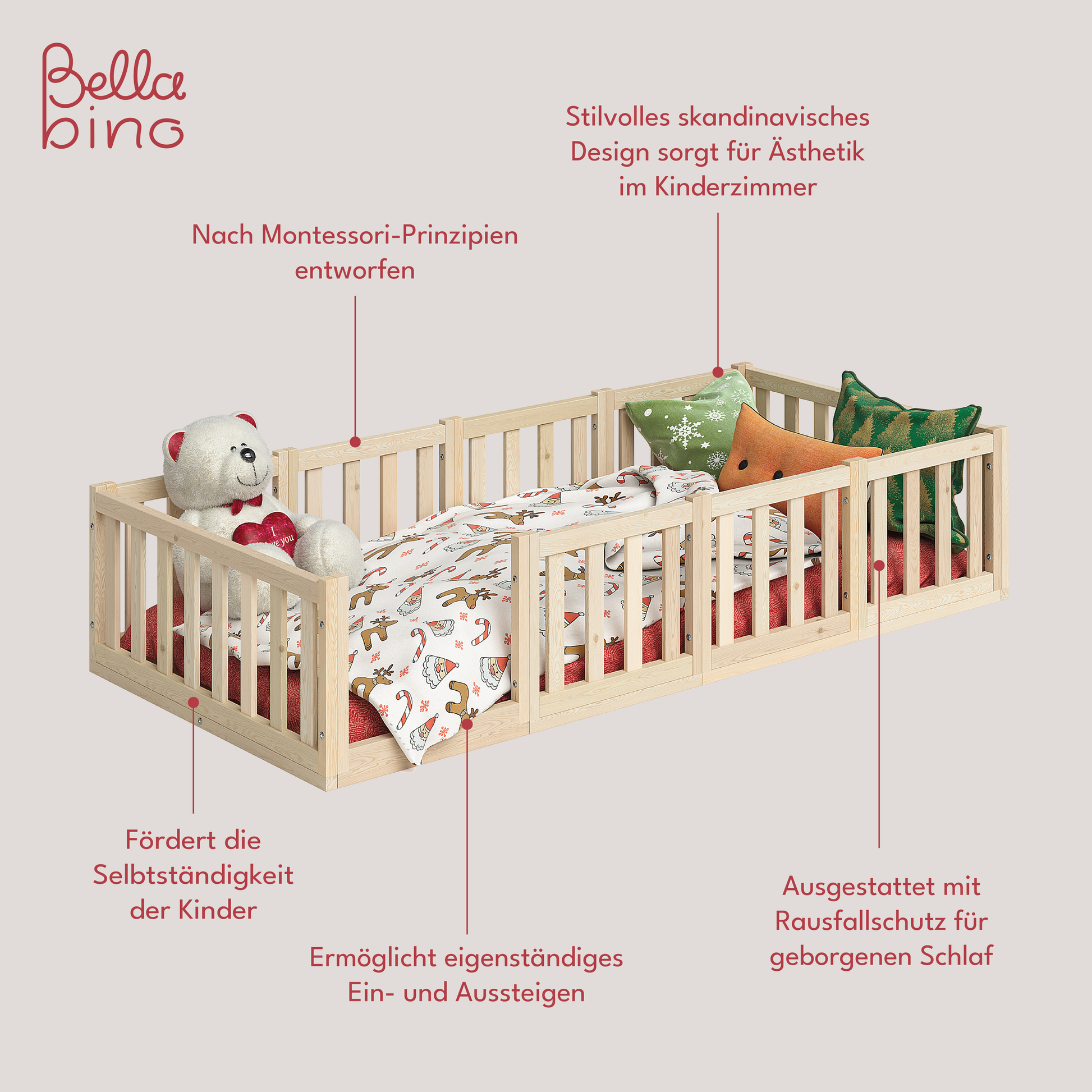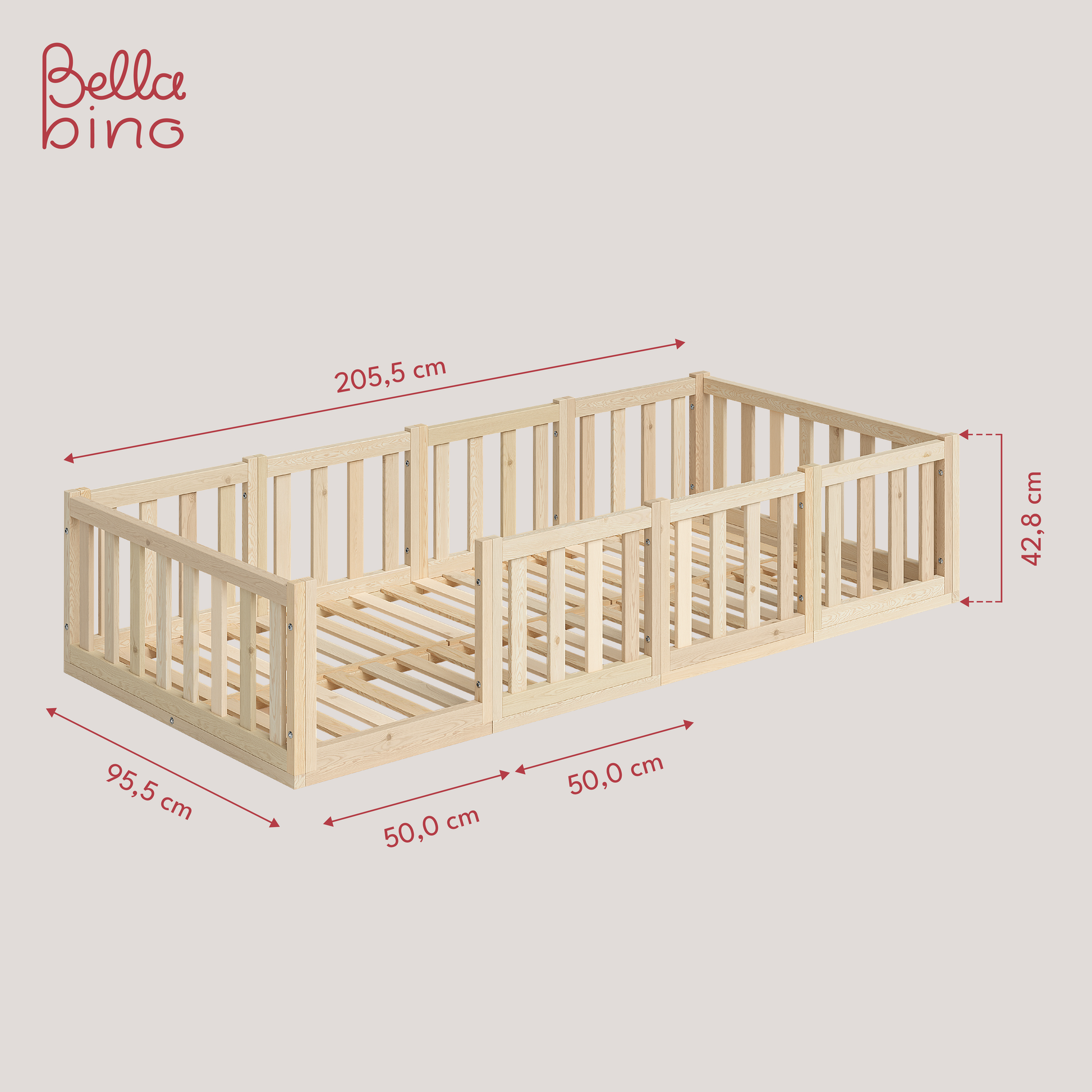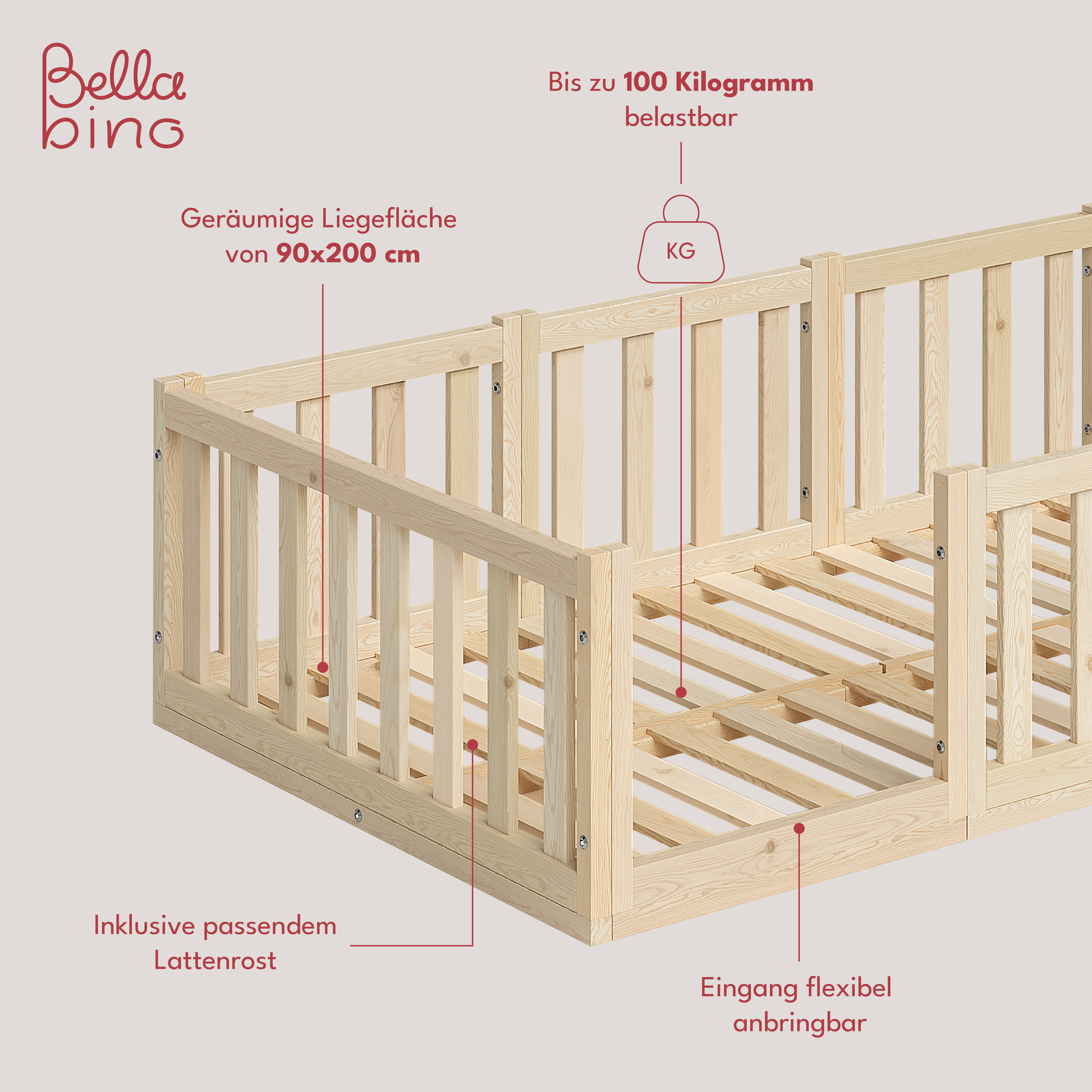 Das Kinderbett von Bellabino verfügt über eine geräumige Liegefläche von 90x200 cm, ein dazu passender Lattenrost ist in der Lieferung enthalten. Die Liegefläche ist mit einem Rausfallschutz umgeben, der die nötige Sicherheit beim Schlafen garantiert. Der Rausfallschutz ist zudem mit einer kleinen Öffnung an der Längsseite ausgestattet, welche ein sicheres Ein- und Aussteigen garantiert.