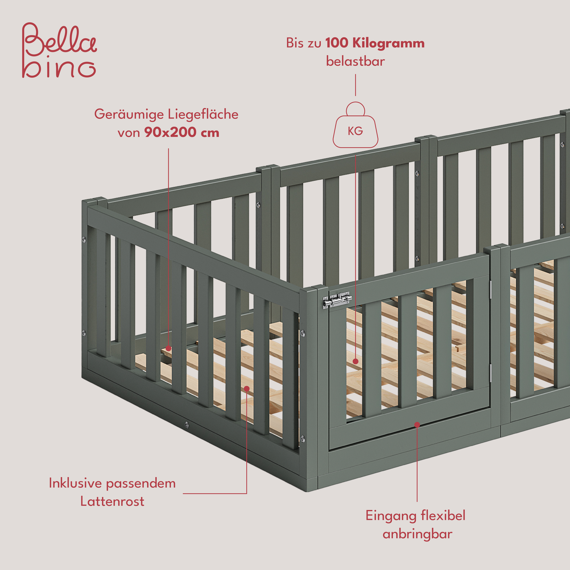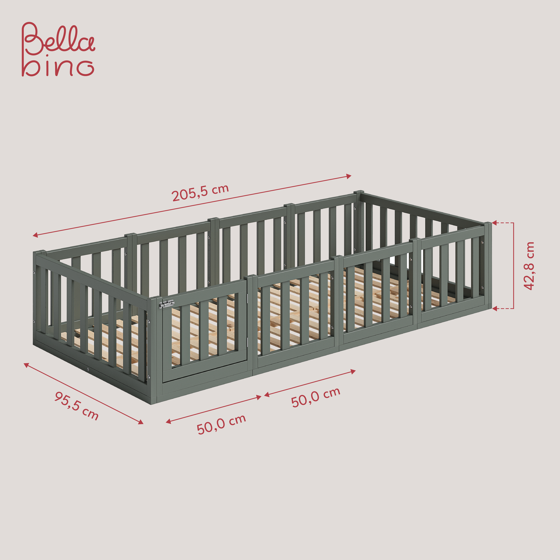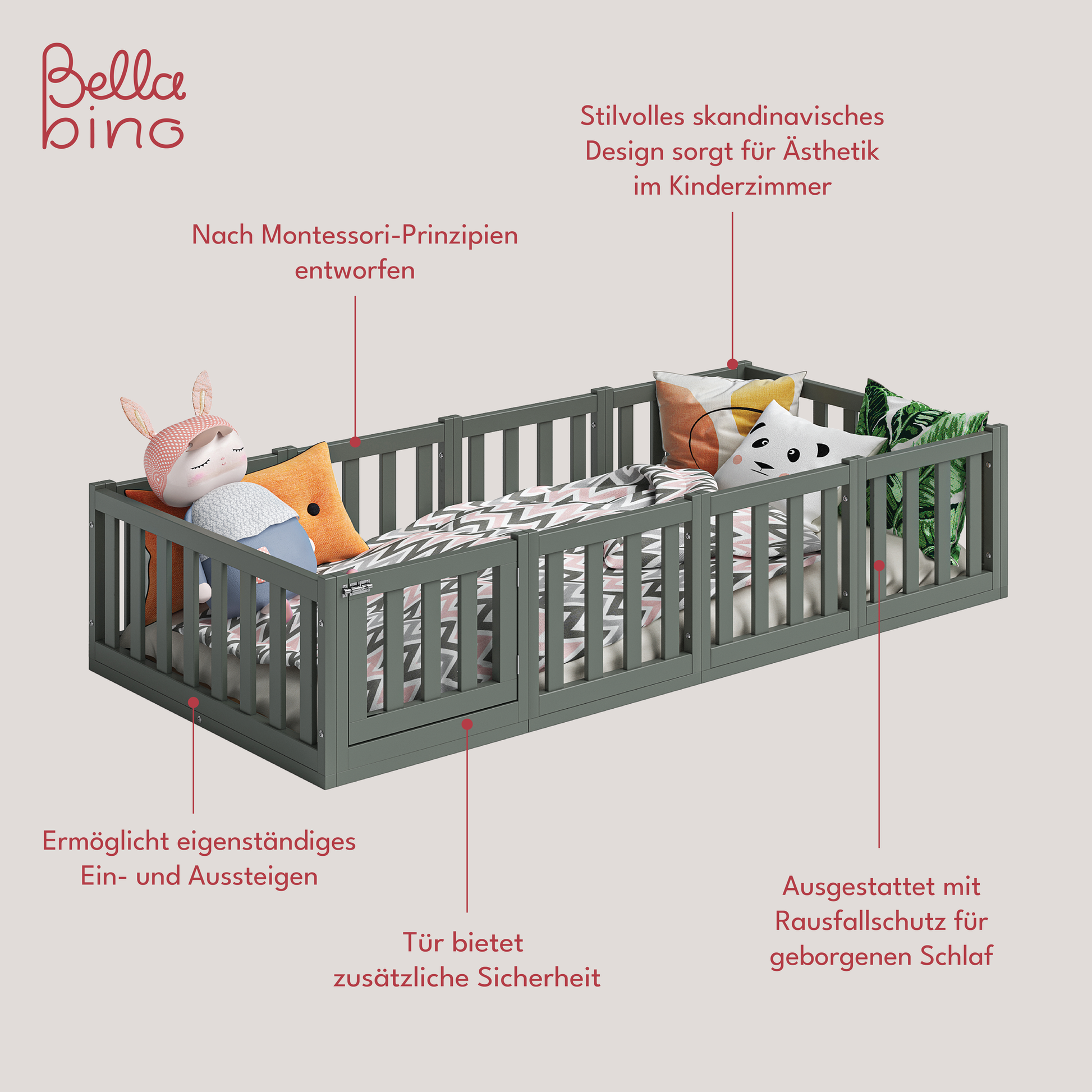 - Lieferumfang: Bodenbett inkl. Rausfallschutz mit Tür und Lattenrost