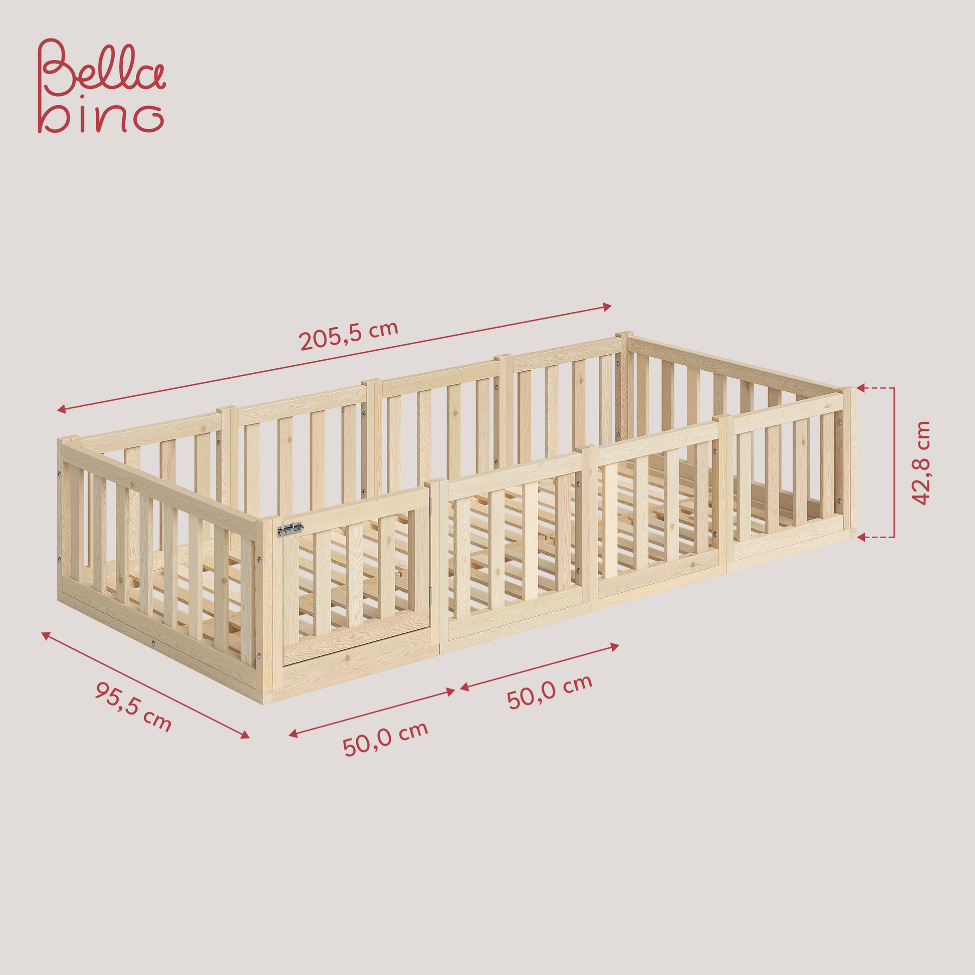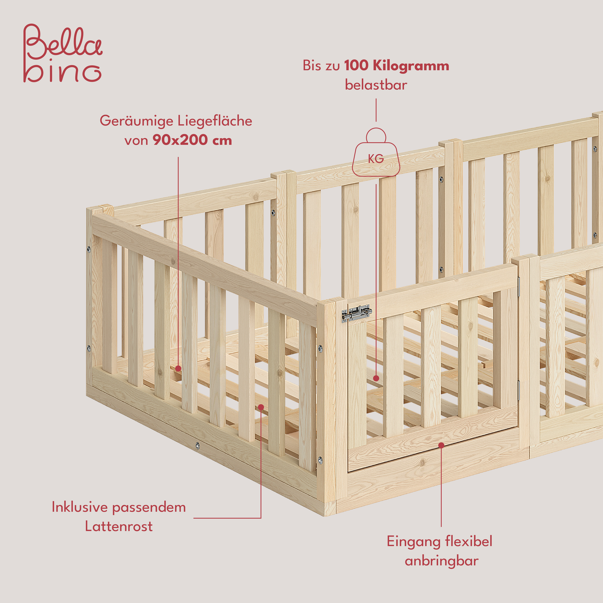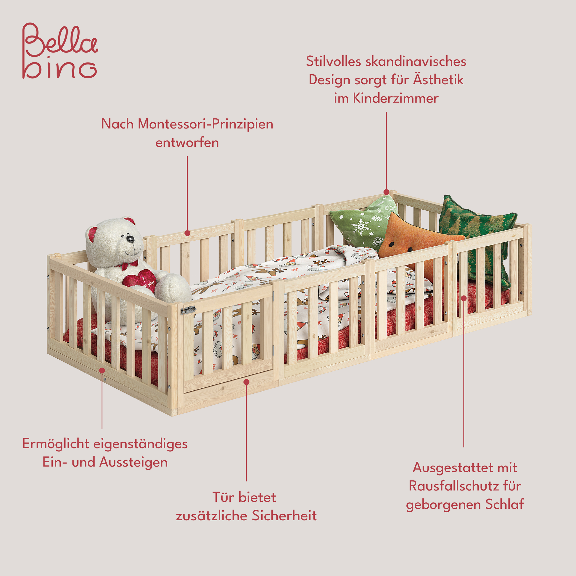 - Lieferumfang: Bodenbett inkl. Rausfallschutz mit Tür und Lattenrost