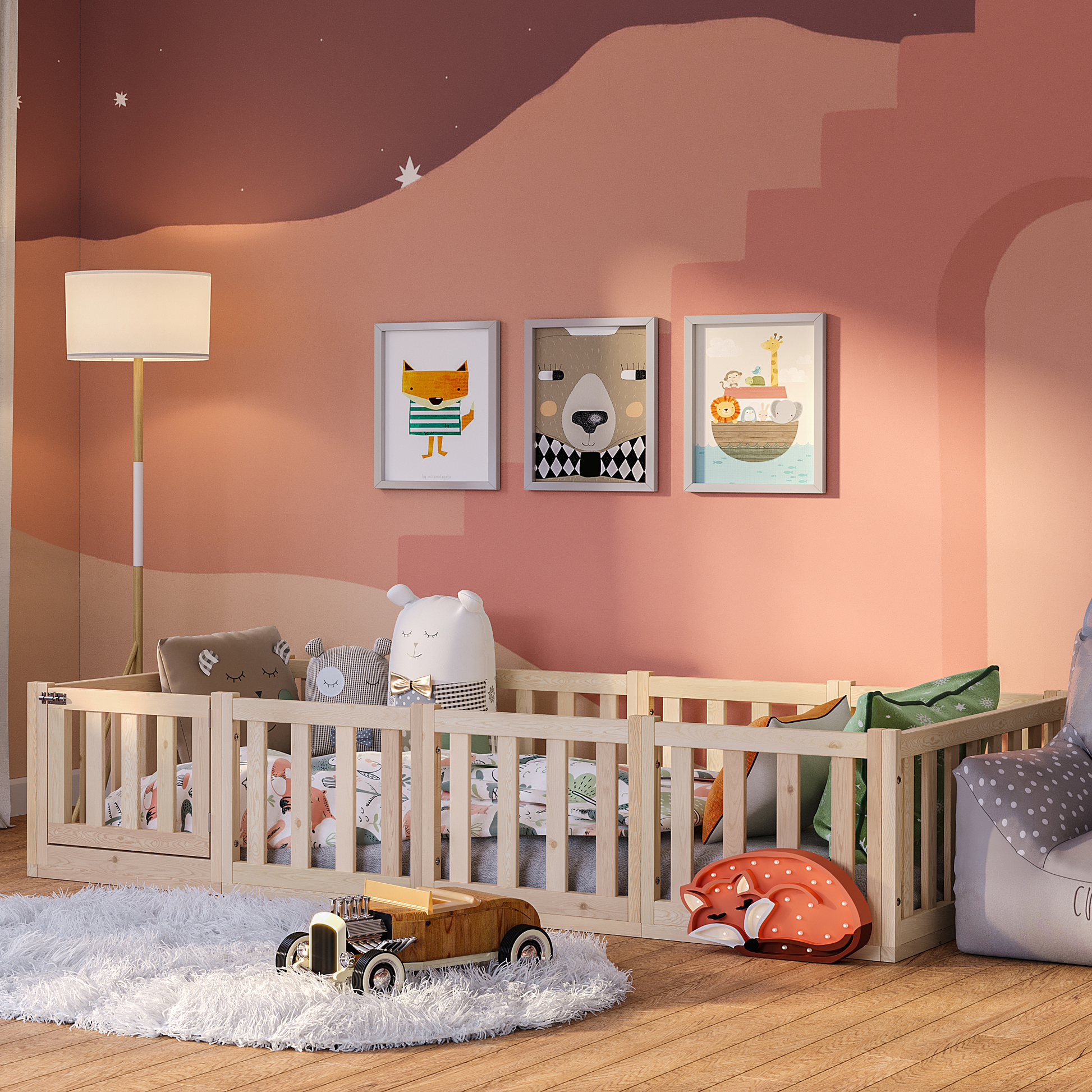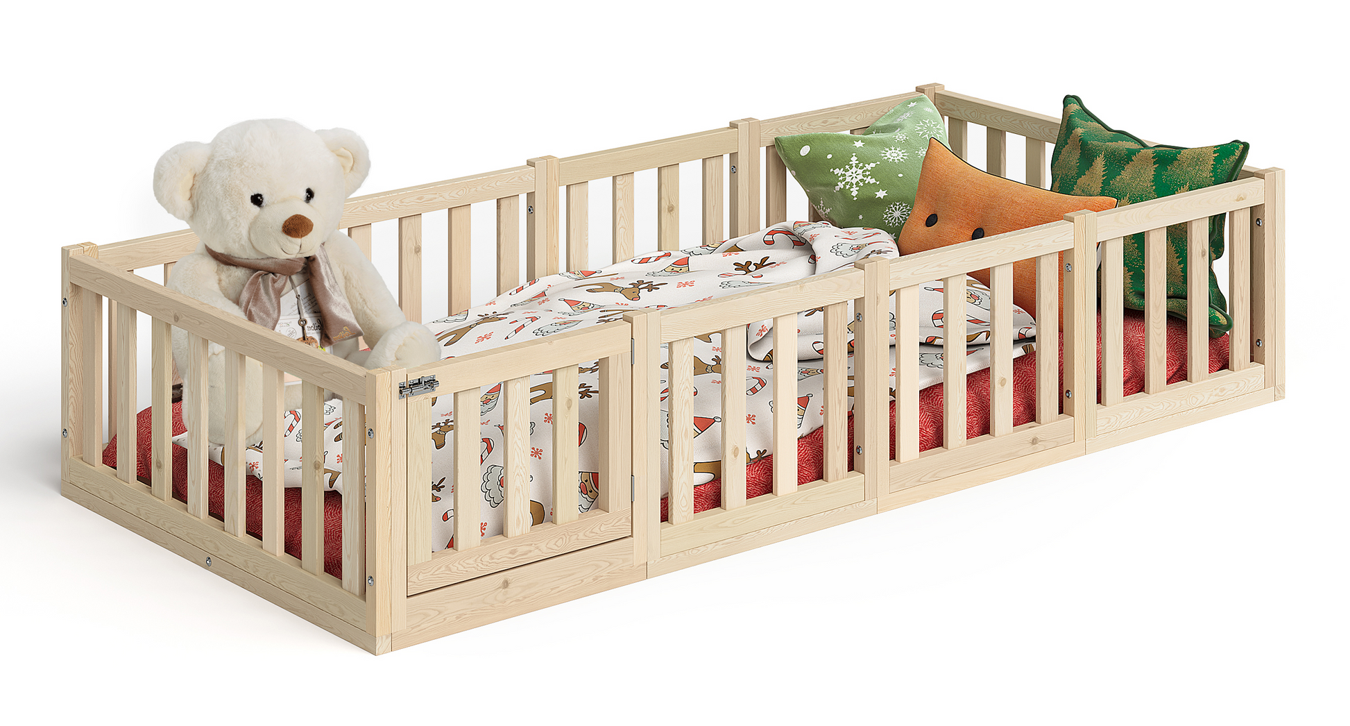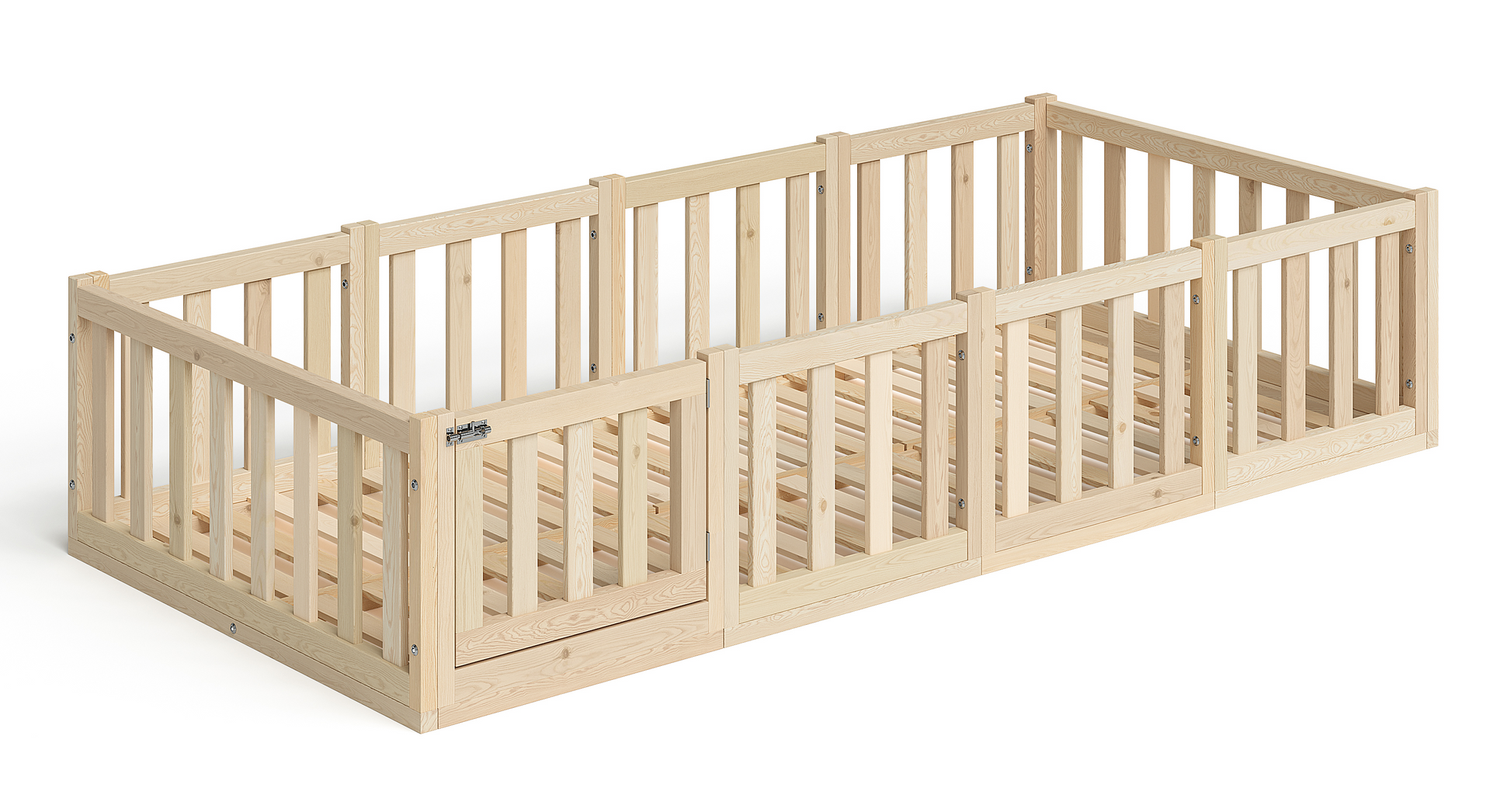 - Lieferumfang: Bodenbett inkl. Rausfallschutz mit Tür und Lattenrost