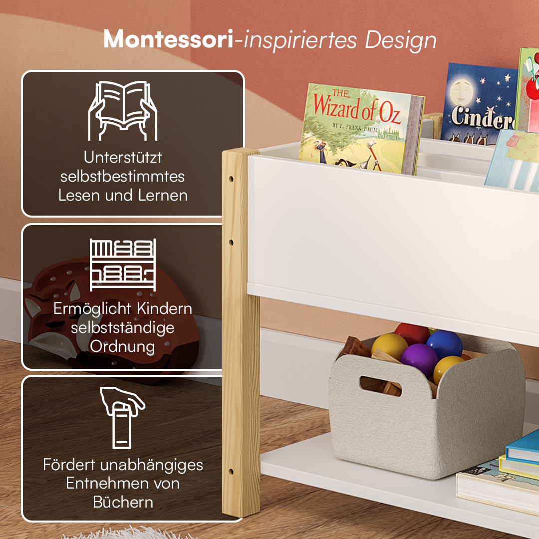 Das kinderfreundliche Bücherregal, entwickelt nach Montessori-Prinzipien, ermöglicht den Kleinen einfachen Zugang zu ihren Büchern und fördert ihre Unabhängigkeit und Leselust. Schaffen Sie mit dem Bellabino Regal eine inspirierende Ecke für Bücher und Spielzeug, die funktional und ästhetisch ansprechend ist.
